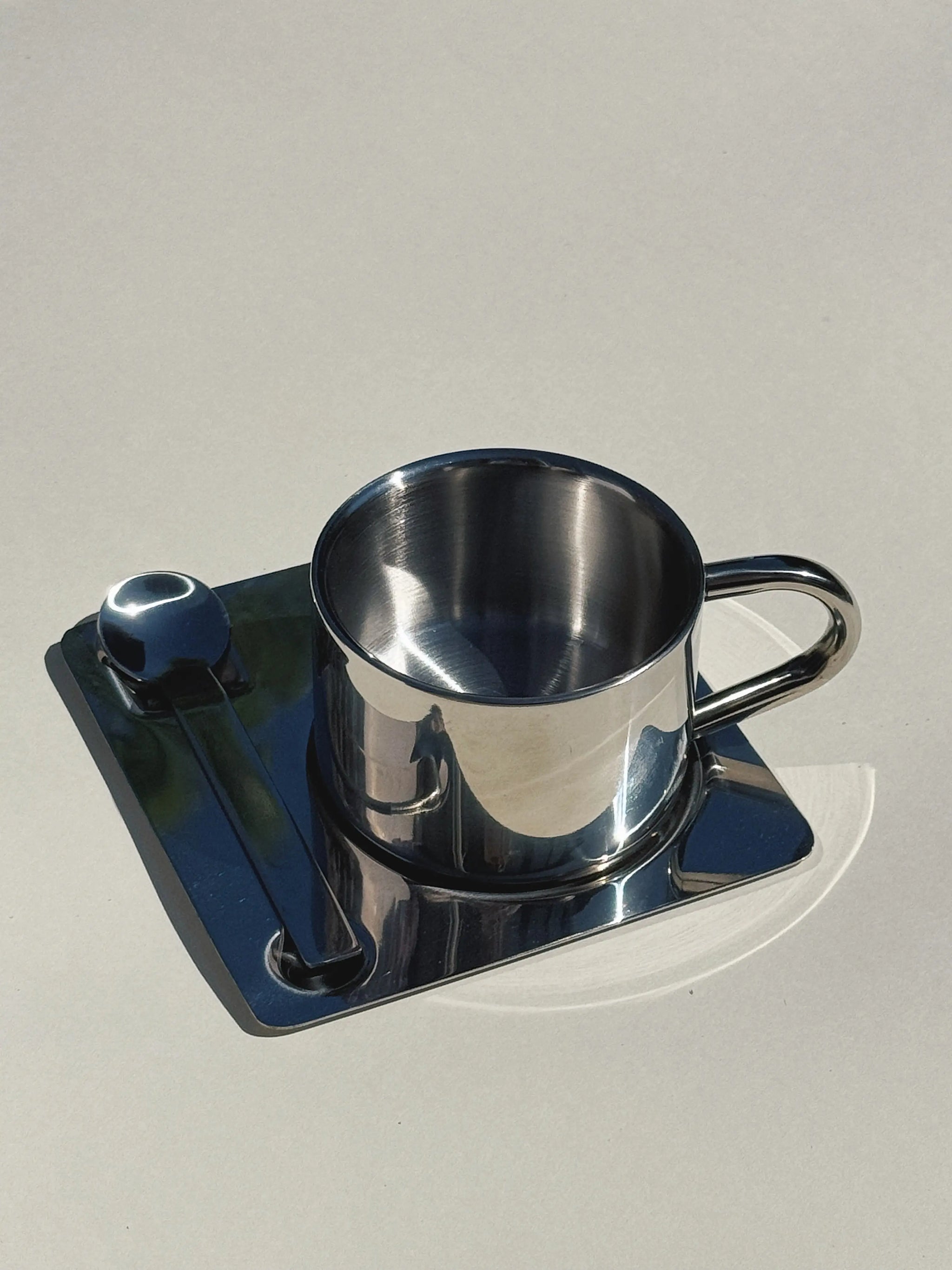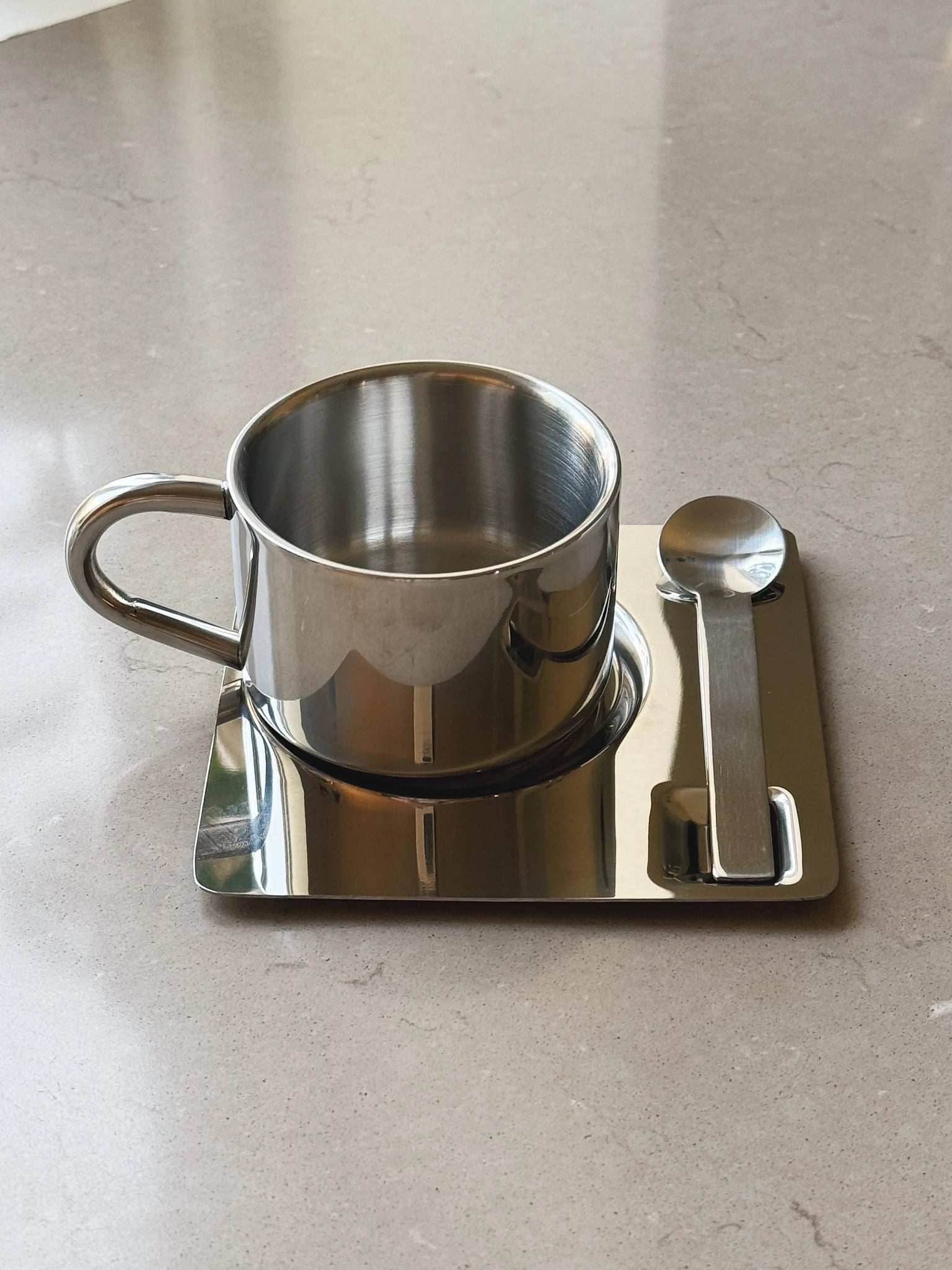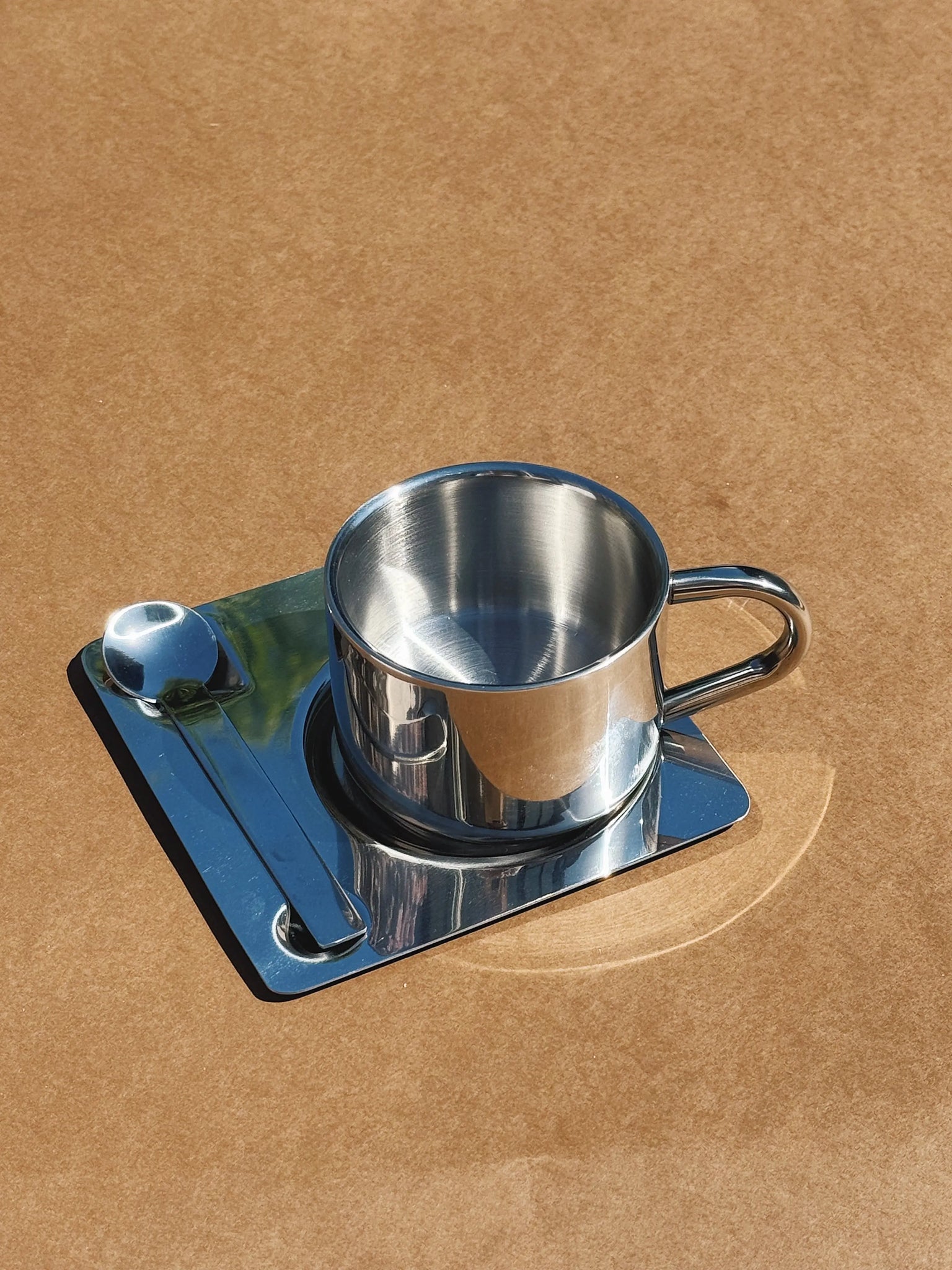 Kaffekop i Rustfrit Stål med Underkop og Ske | 150 ml