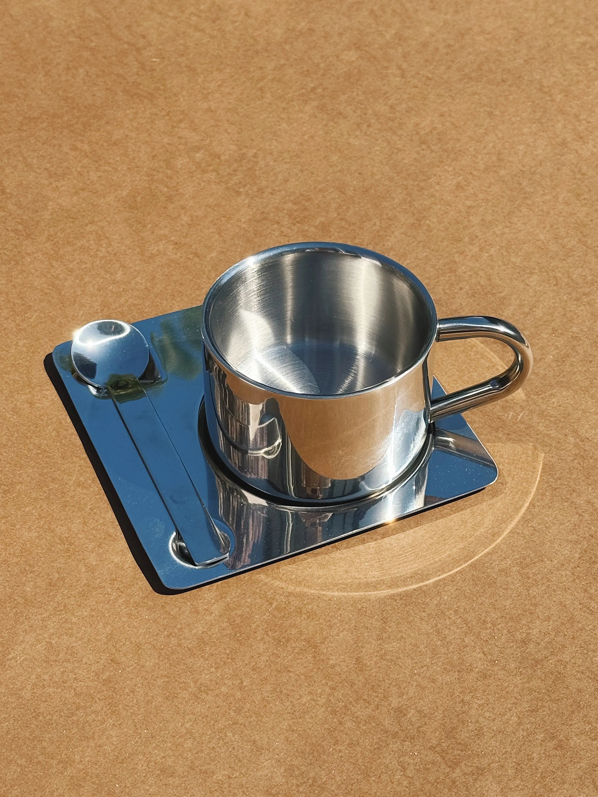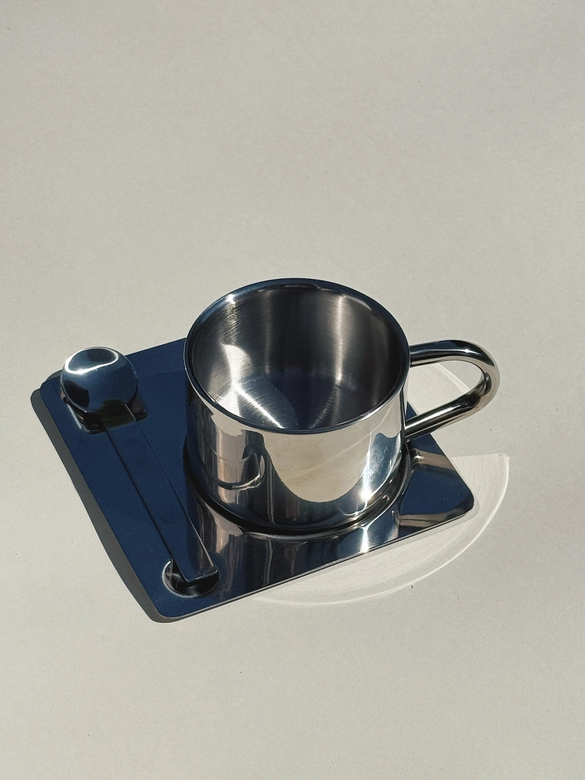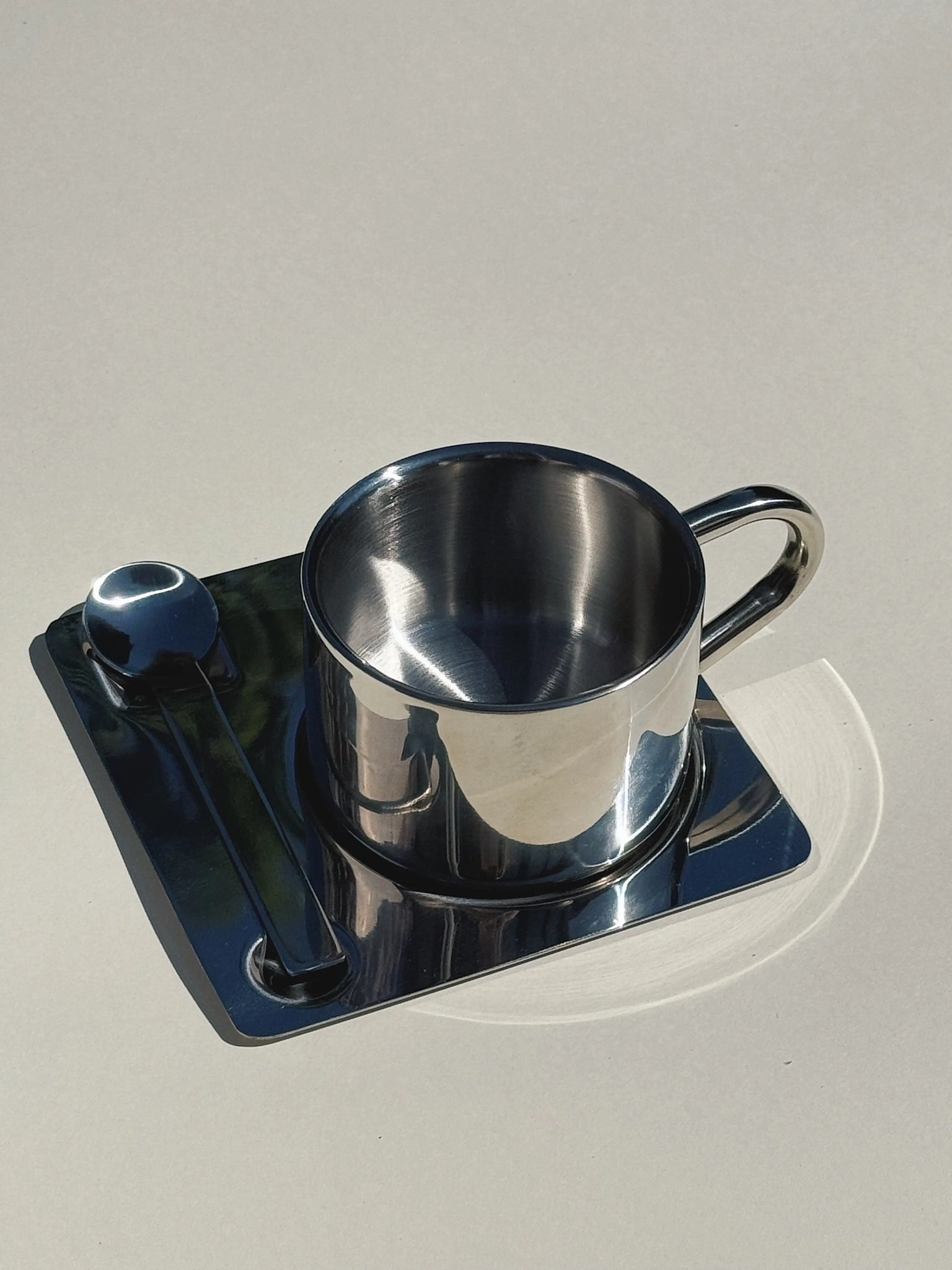 Kaffekop i Rustfrit Stål med Underkop og Ske | 150 ml