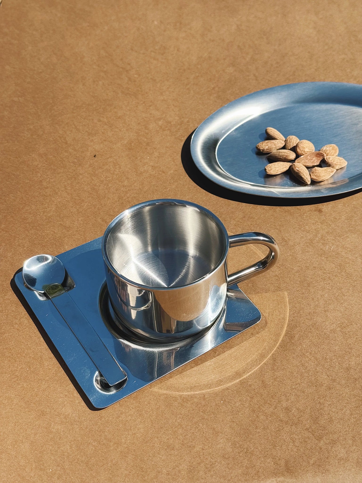 Kaffesættet består af en kop, en plade, der fungerer som underkop, og en ske. Pladen giver ikke kun en elegant base, men tilbyder også plads til skeen. Den børstede ståloverflade og dobbeltlagskonstruktion hjælper med at bevare varme og giver et sofistikeret udseende. Let at rengøre og perfekt til daglig brug.