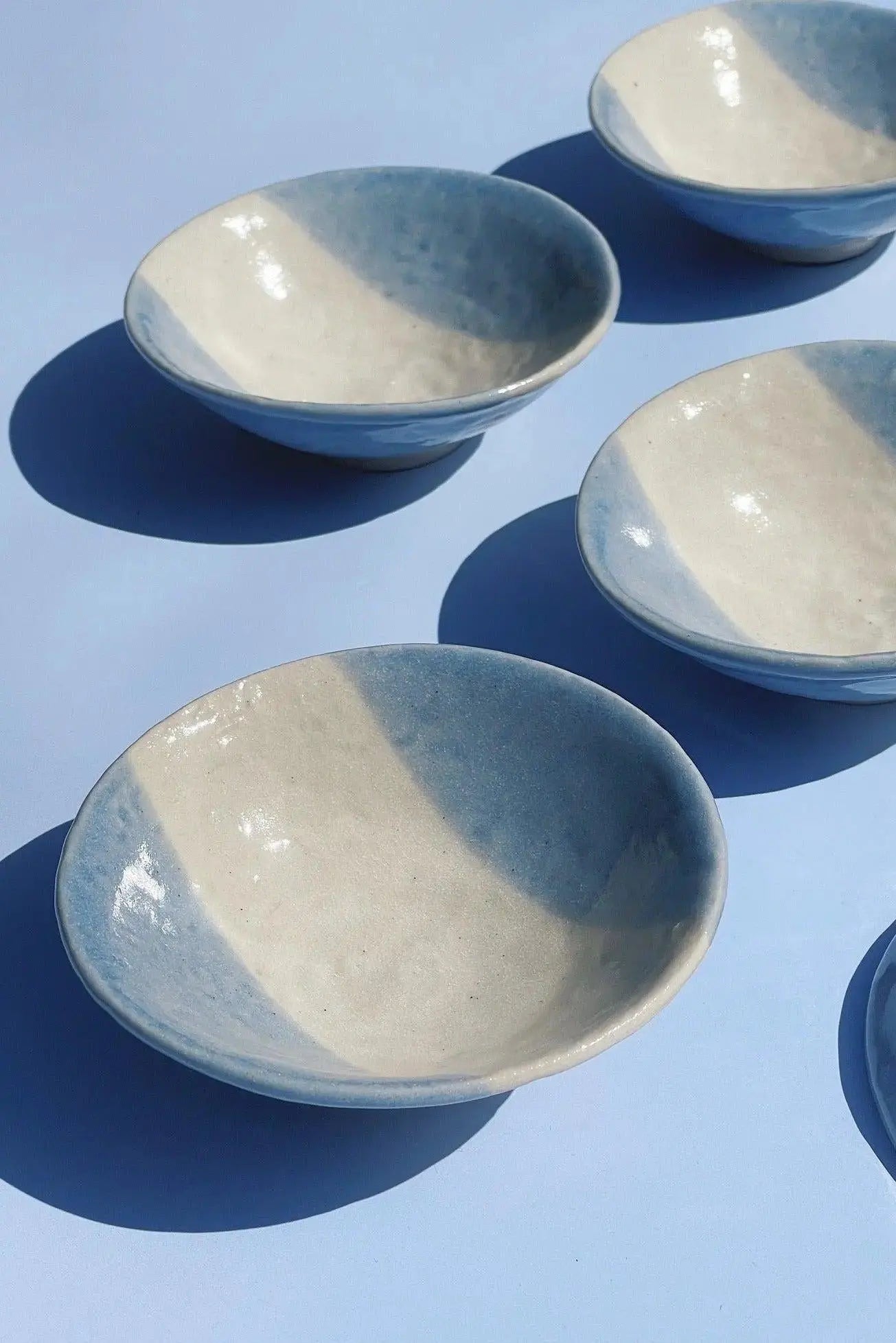 Håndlavet, japansk skål i lyseblå og hvid keramik.
