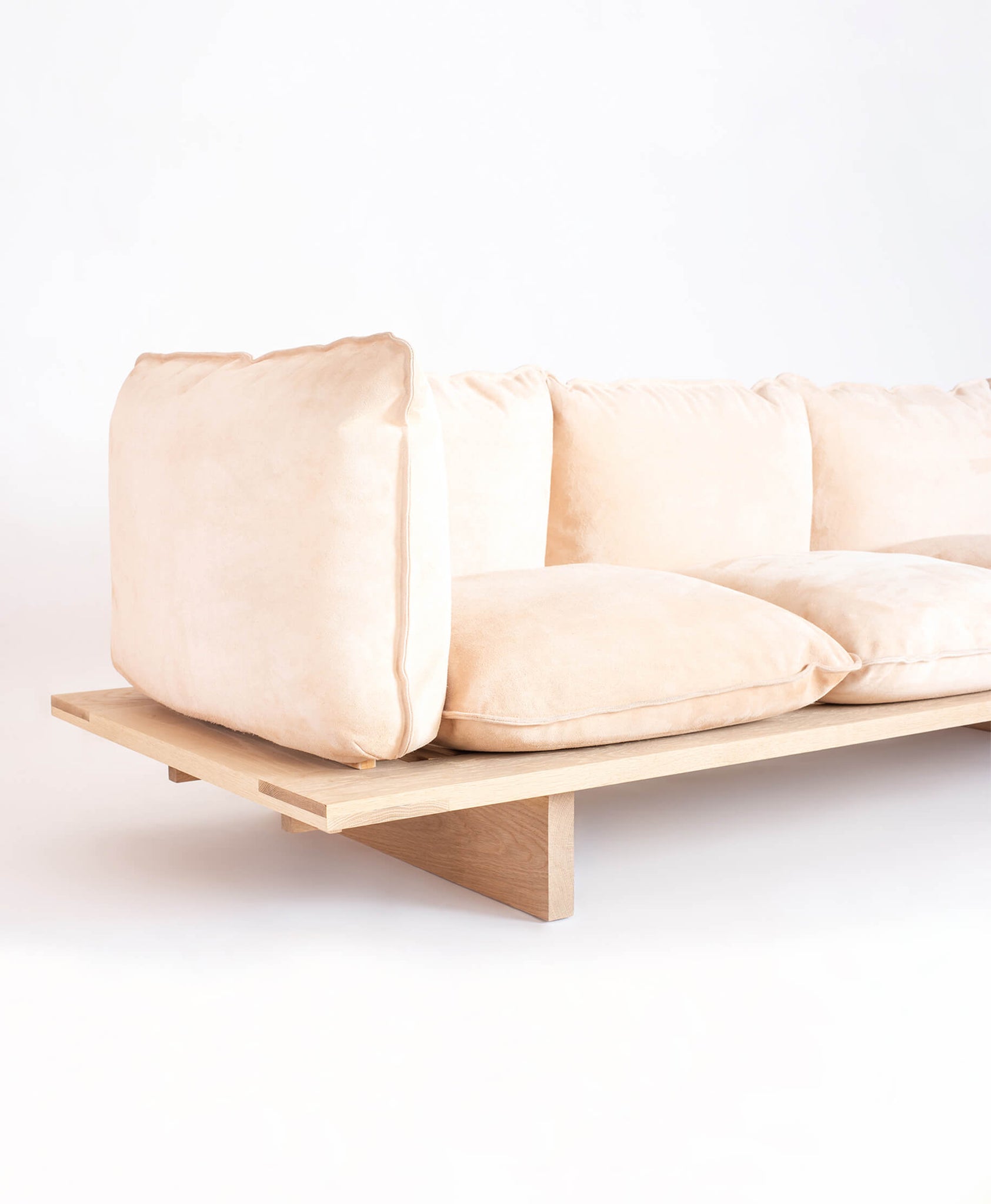 Sofaen er skabt med fokus på ærlig konstruktion og visuel lethed. Den synlige limtræskonstruktion kombineret med de “svævende” hynder giver et skulpturelt og moderne udtryk, der fungerer både i private hjem og i repræsentative rum.