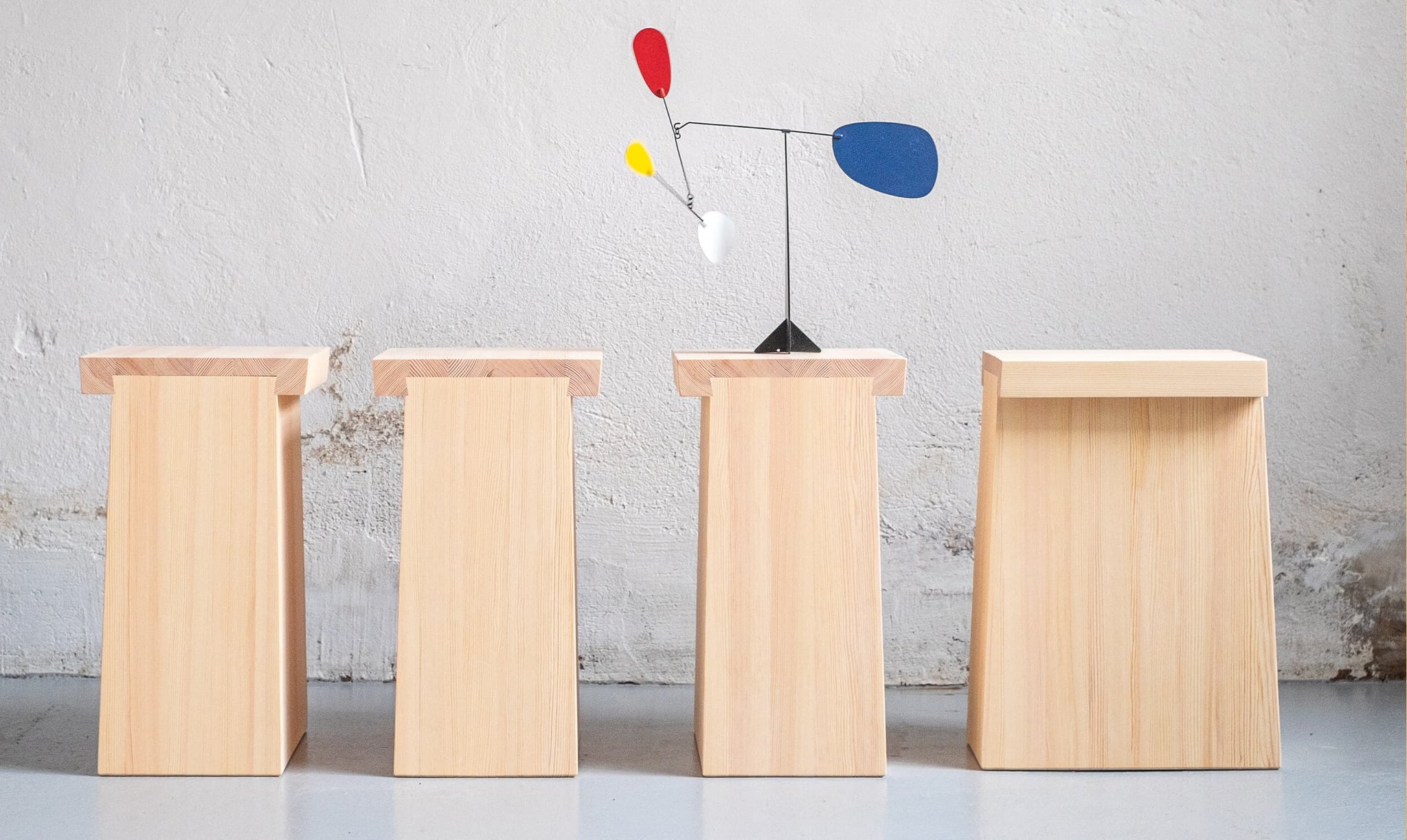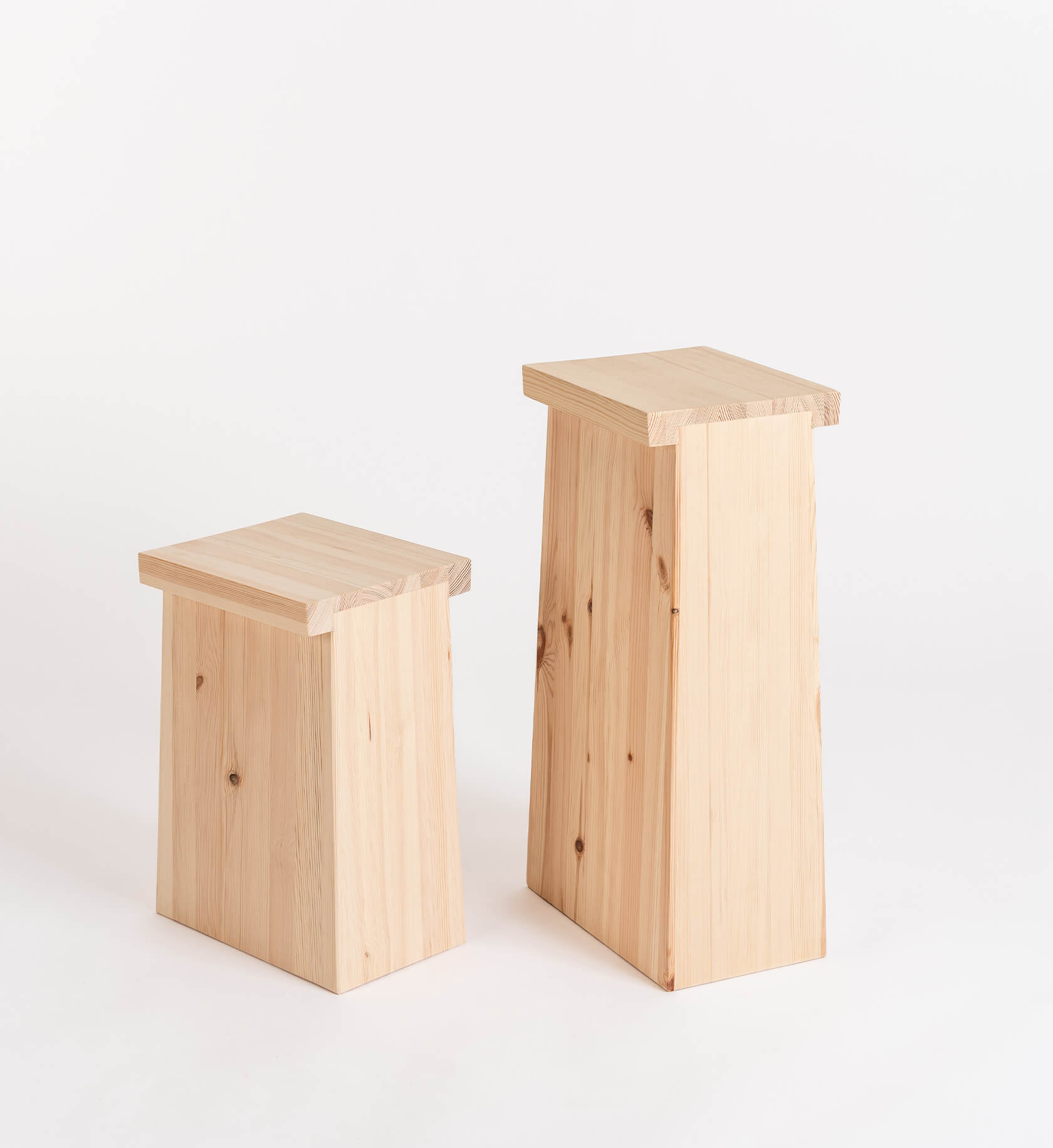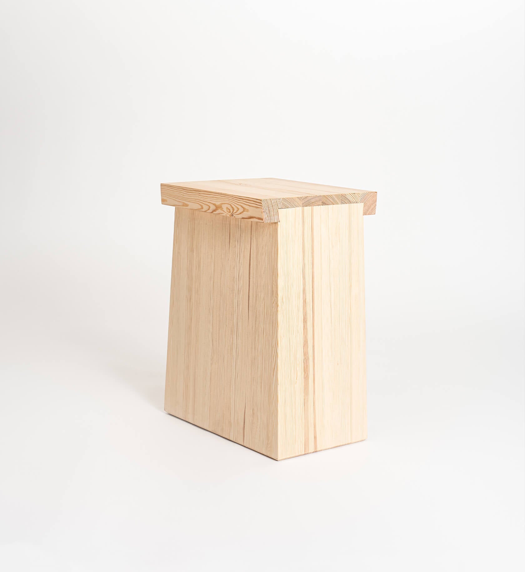 Taburetten er fremstillet i massivt svensk fyrretræ og kan vælges enten ubehandlet for et råt, naturligt udtryk eller behandlet med naturlig linolie for en varmere tone og en mere robust overflade, der patinerer smukt over tid.