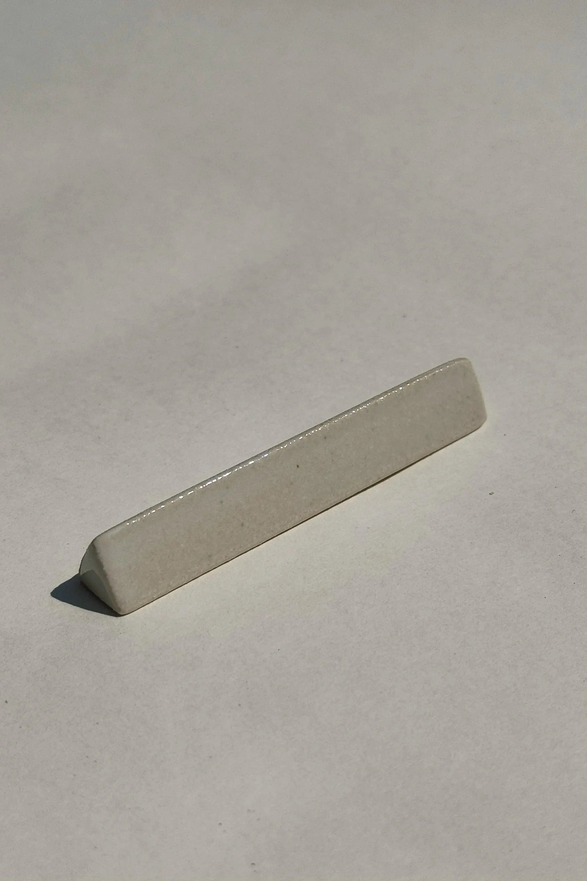 Elegant og funktionel spisepindholder i keramik fra Japan, formet som en skarp trekant. Den ene side er glaseret med blank, varm hvid glasur, mens den anden har en mat, rå finish. Den kontrasterende overflade giver et sofistikeret og sanseligt udtryk til borddækningen.