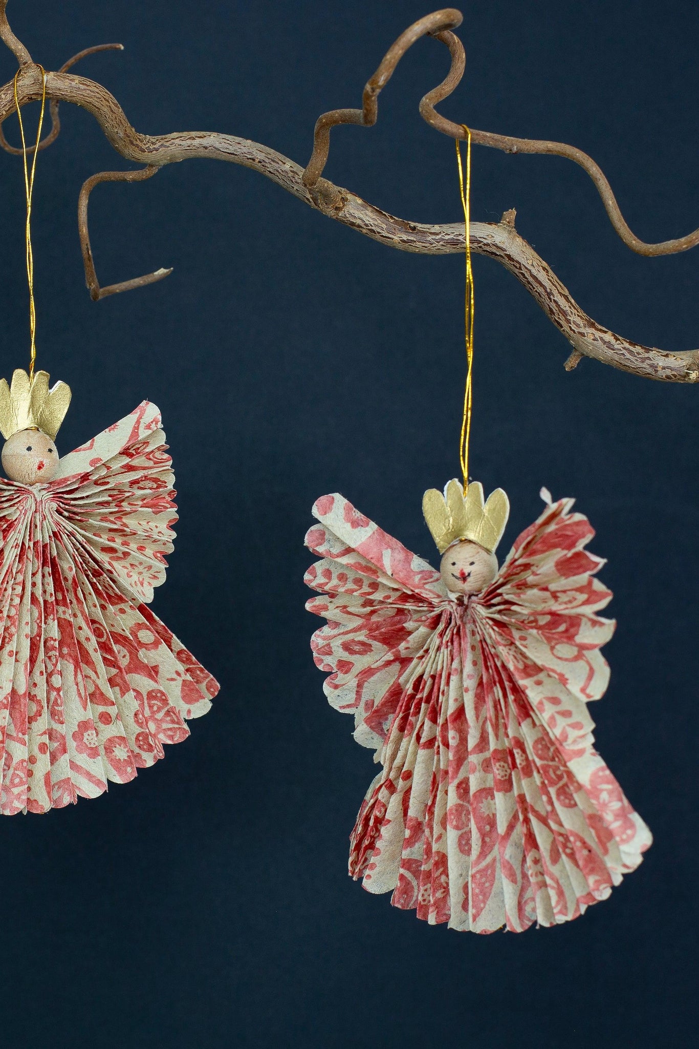 De mest charmerende små juleornamenter, lavet af rødt og hvidt papir og formet som engle med en lille guldkrone. Disse engle kommer i et sæt med to og er perfekte til at hænge på juletræet, på en gren eller i vinduet, hvor de vil tilføje en smuk og festlig stemning