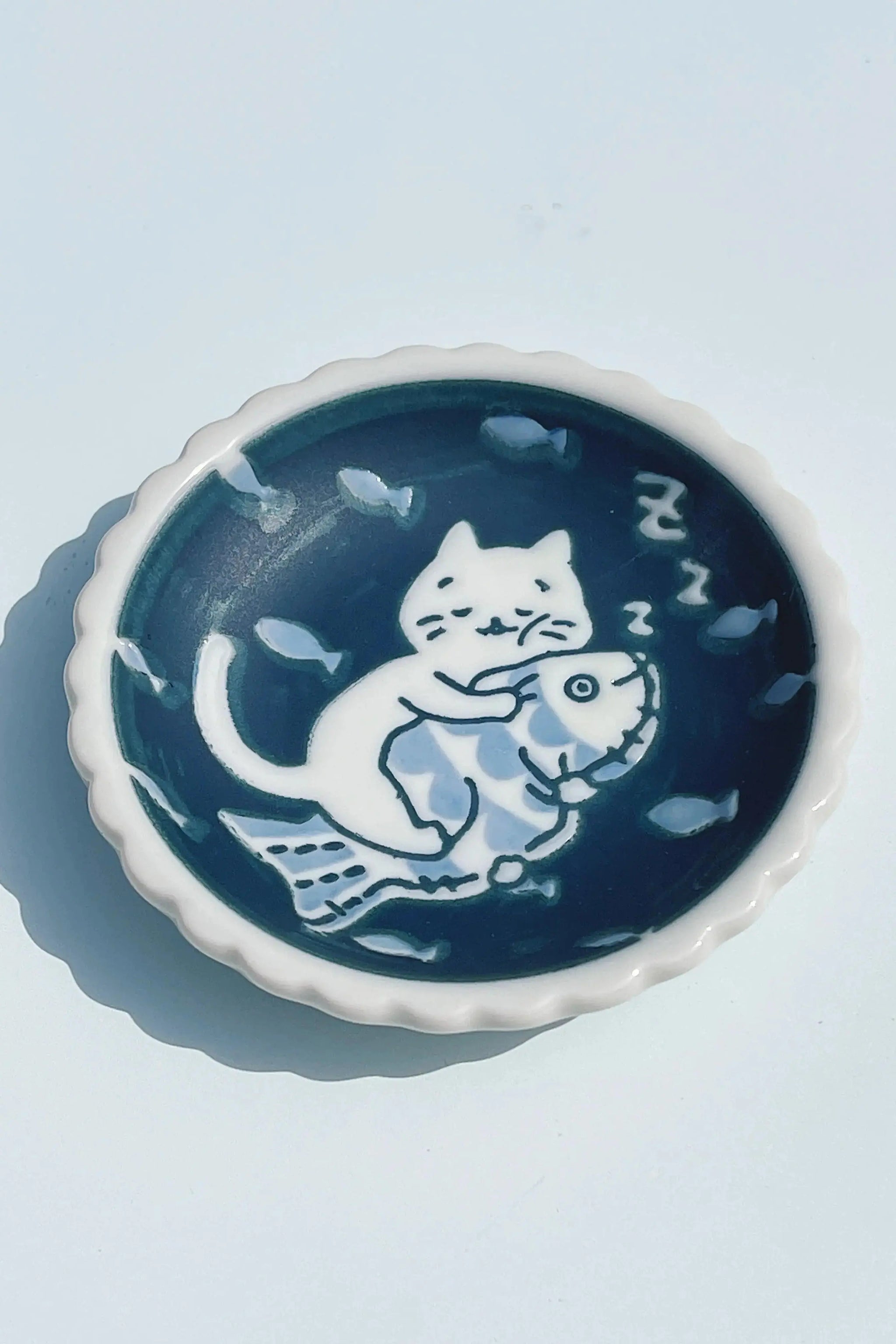 Lille blå tallerken fra Japan med hvid kat og fisk | 10.5 cm