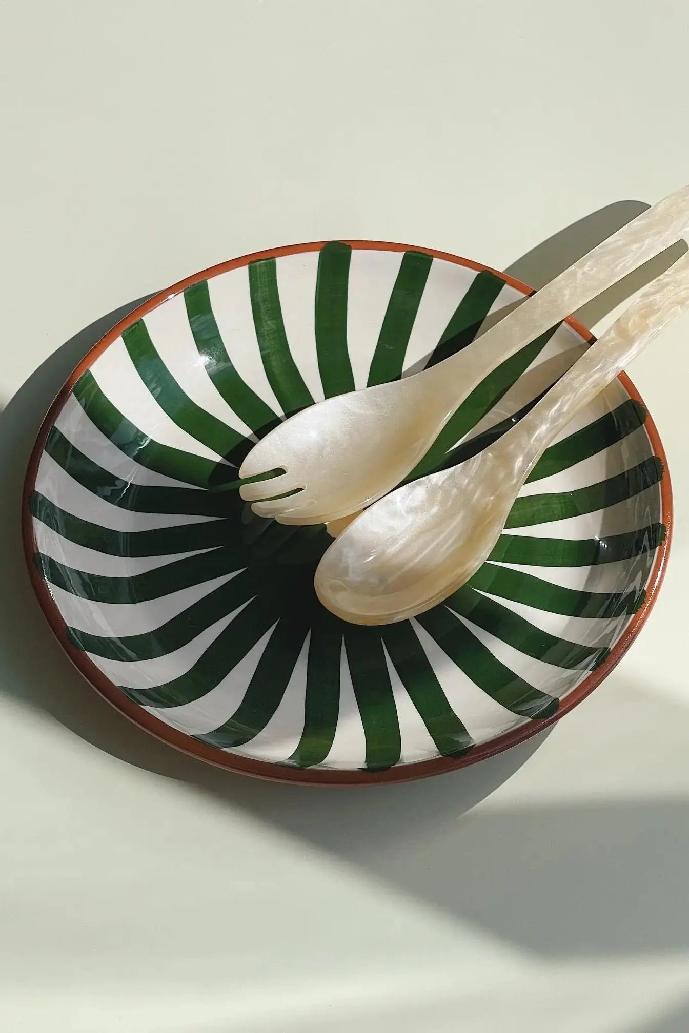 Unik, hånddrejet og håndmalet fad med grønne og hvide striber ved navn Ray fra portugisiske Casa Cubista. Fadet har den perfekte størrelse til servering af salater, grøntsager, snacks, charcuterie m.m. Fadet findes også med blå og hvide striber og gule og hvide striber.