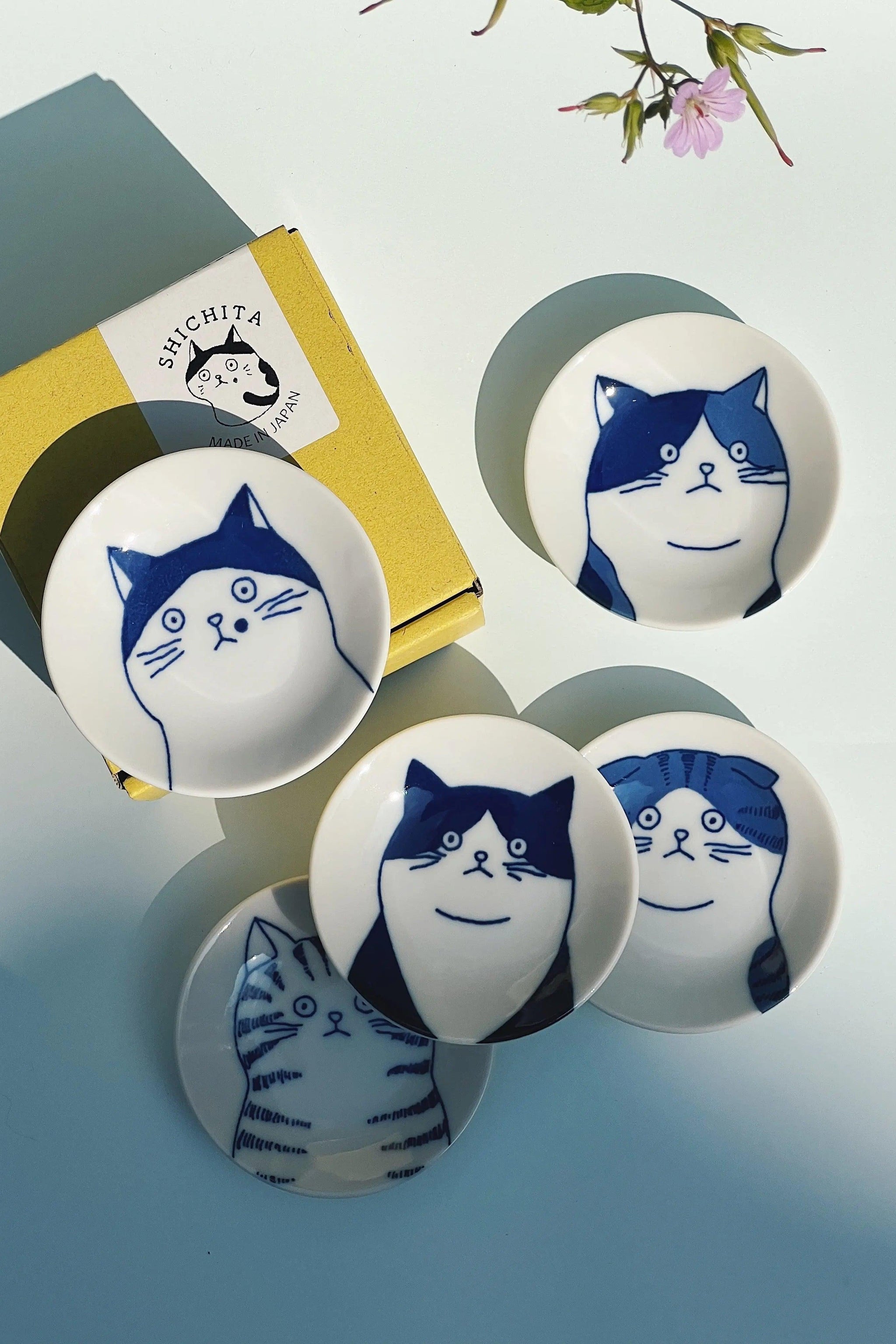 Japansk tallerken med blå kat | Sæt med 5 forskellige i æske | 8 cm