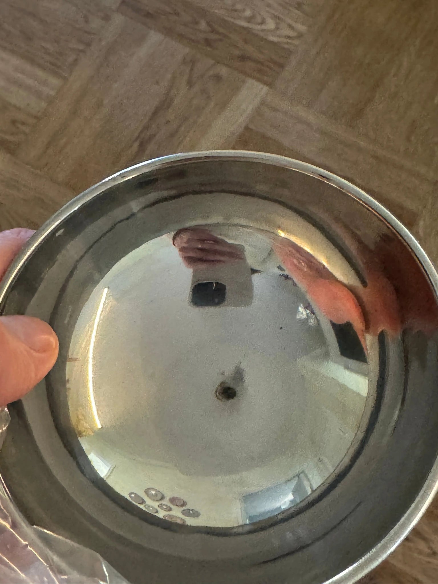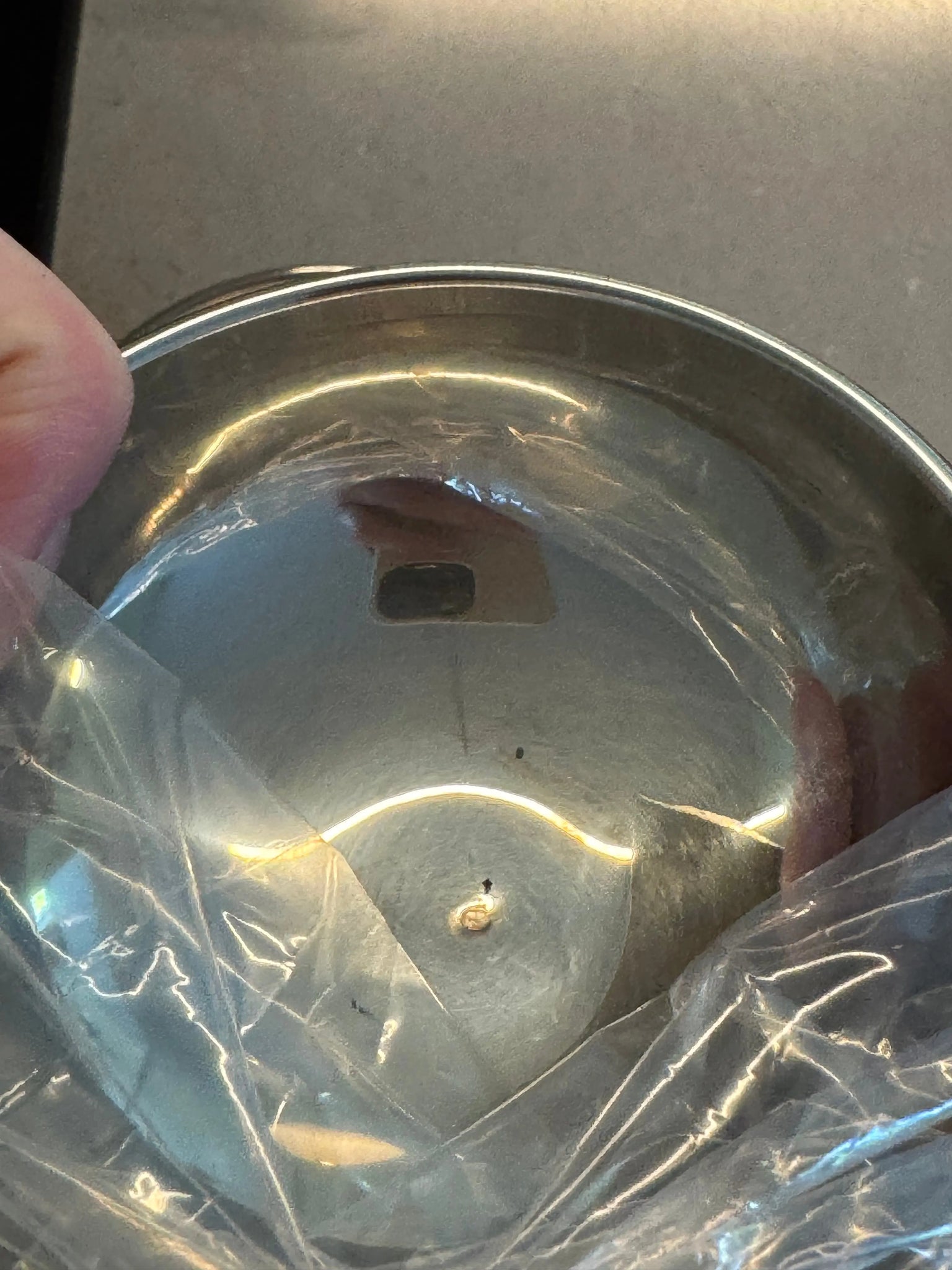 I bunden af isbægeret kan der forekomme en lille mørkere plet. Dette er ikke en fejl, men skyldes højtemperatur-svejsning, som under fremstillingen kan forårsage en farveændring i stålet. Pletten har ingen betydning for funktion, fødevaresikkerhed eller holdbarhed – og er et naturligt resultat af produktionen. Se billederne for reference.