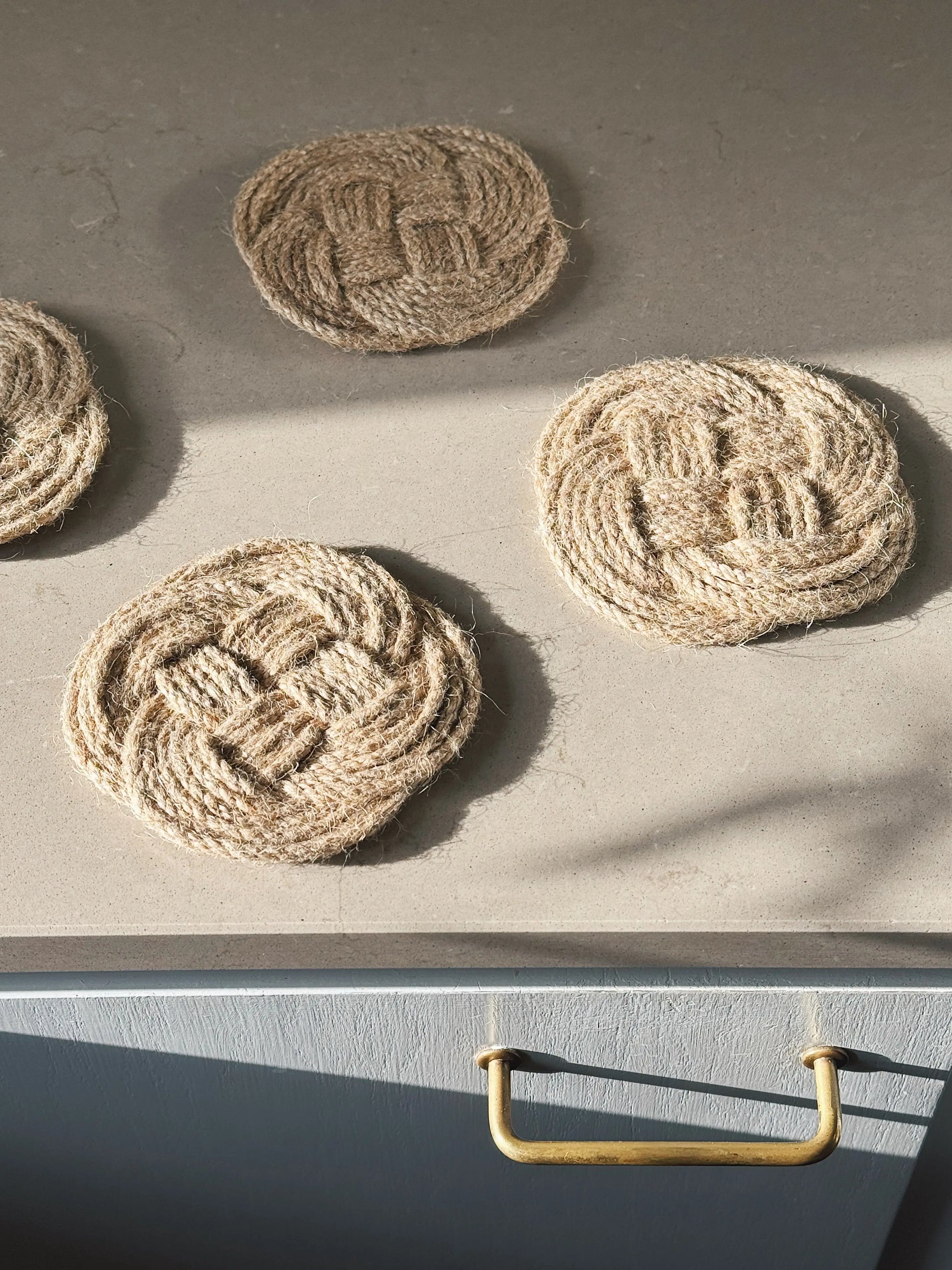 Mønstret er inspireret af traditionelle maritime knob og balancerer funktion og form med et strejf af havets poesi. Coasterne beskytter dine overflader mod varme kopper, fugt og ridser – og er samtidig dekorative nok til at ligge fremme hele tiden.
