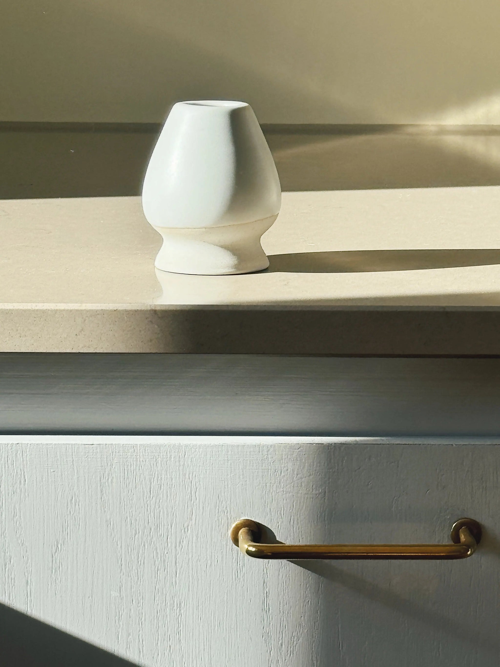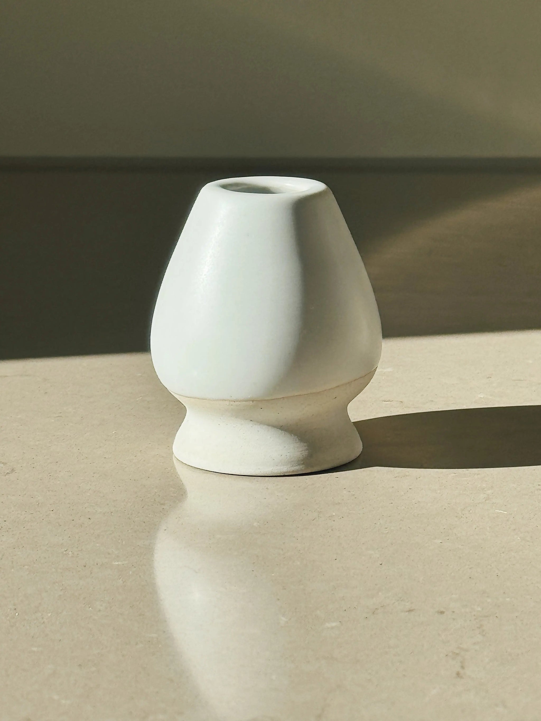 Denne elegante matcha holder er håndlavet og har en smuk kombination af hvid glasur og en råhvid/beige bund. Designet fremhæver dens enkle, minimalistiske æstetik, der passer perfekt ind i dit matcha-ritual. Den funktionelle form sikrer, at din matcha opbevares sikkert, mens den stilrene farvekombination tilføjer en rolig og harmonisk følelse til dit matcha-set.