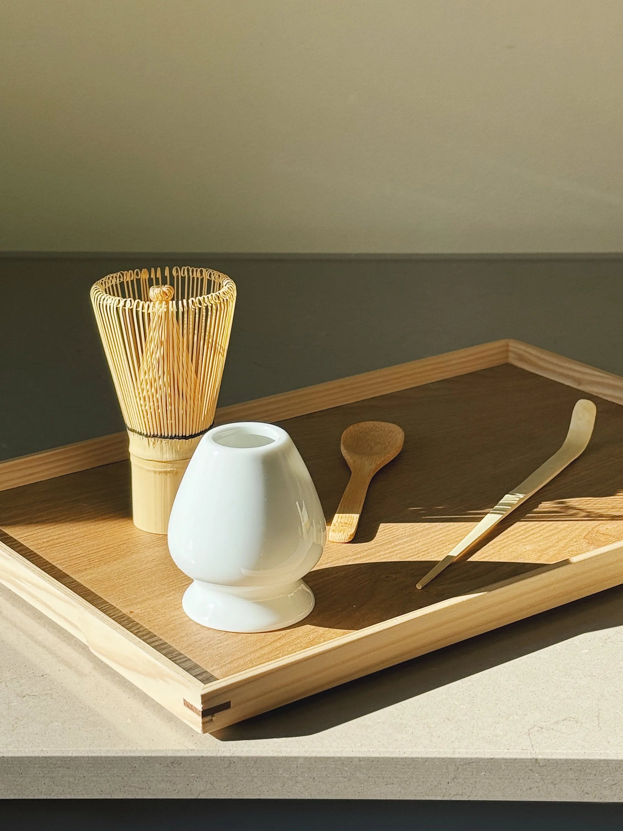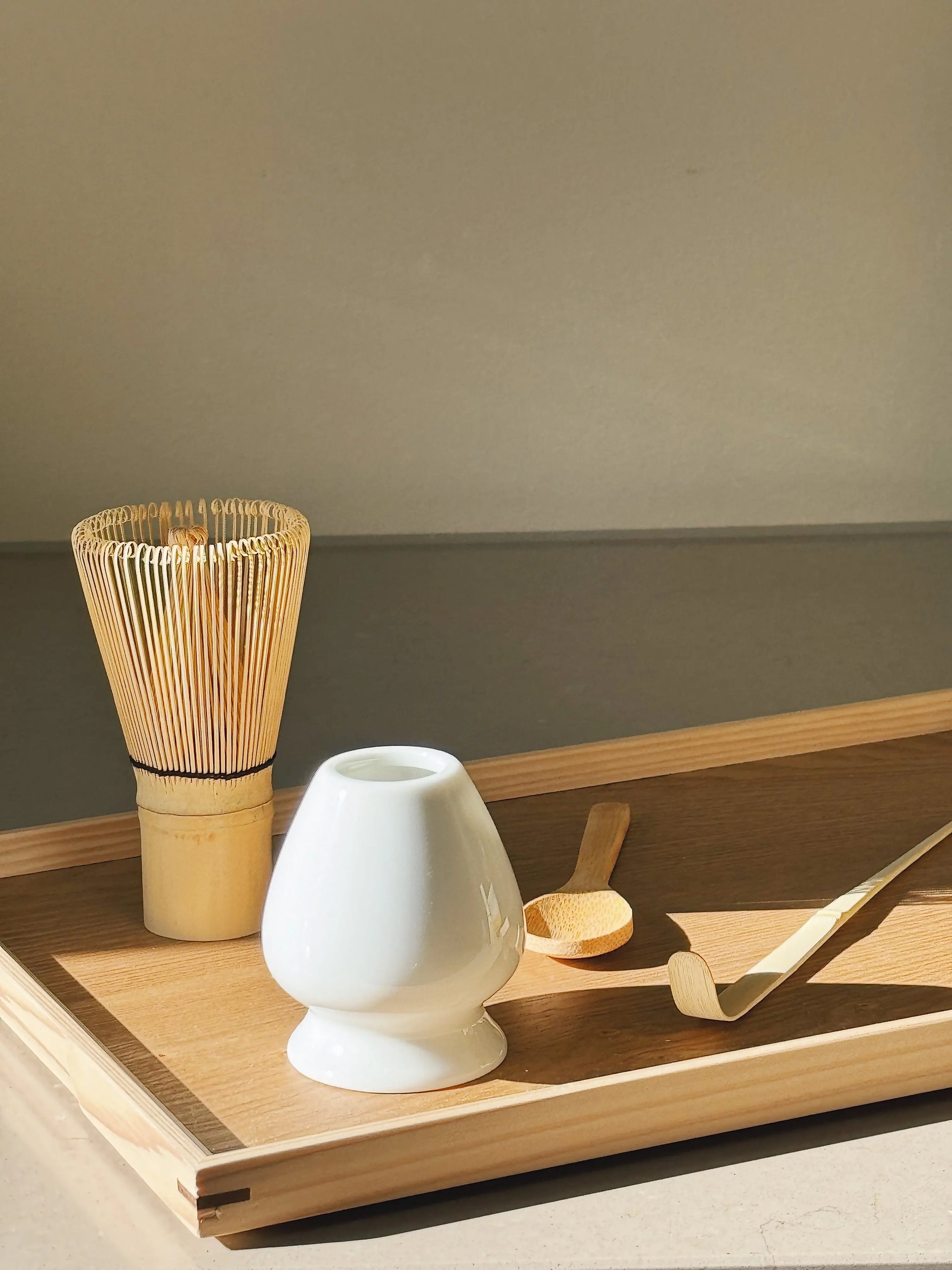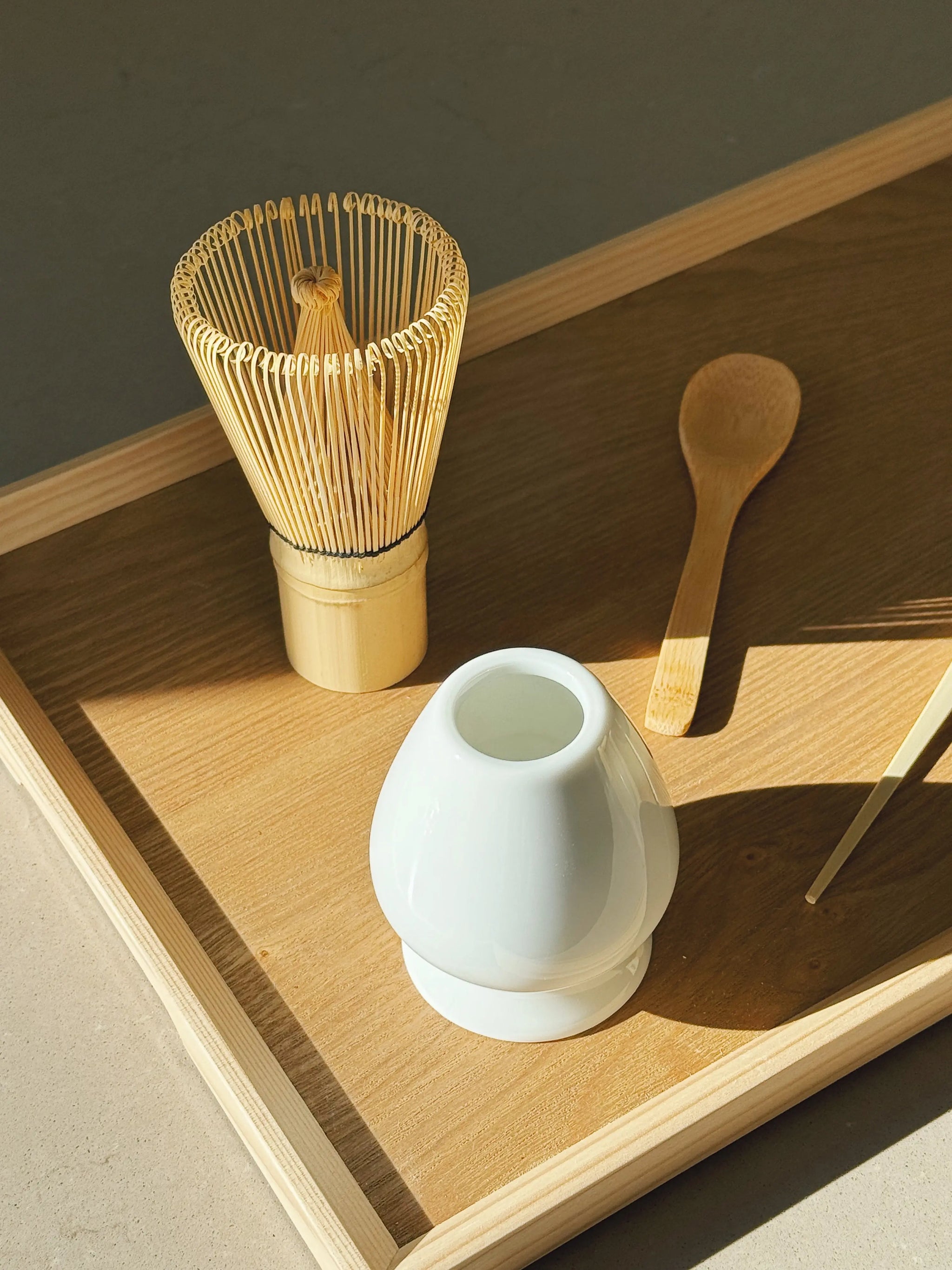Matcha-sæt med chasen, matchaske, teské og holder i hvid keramik