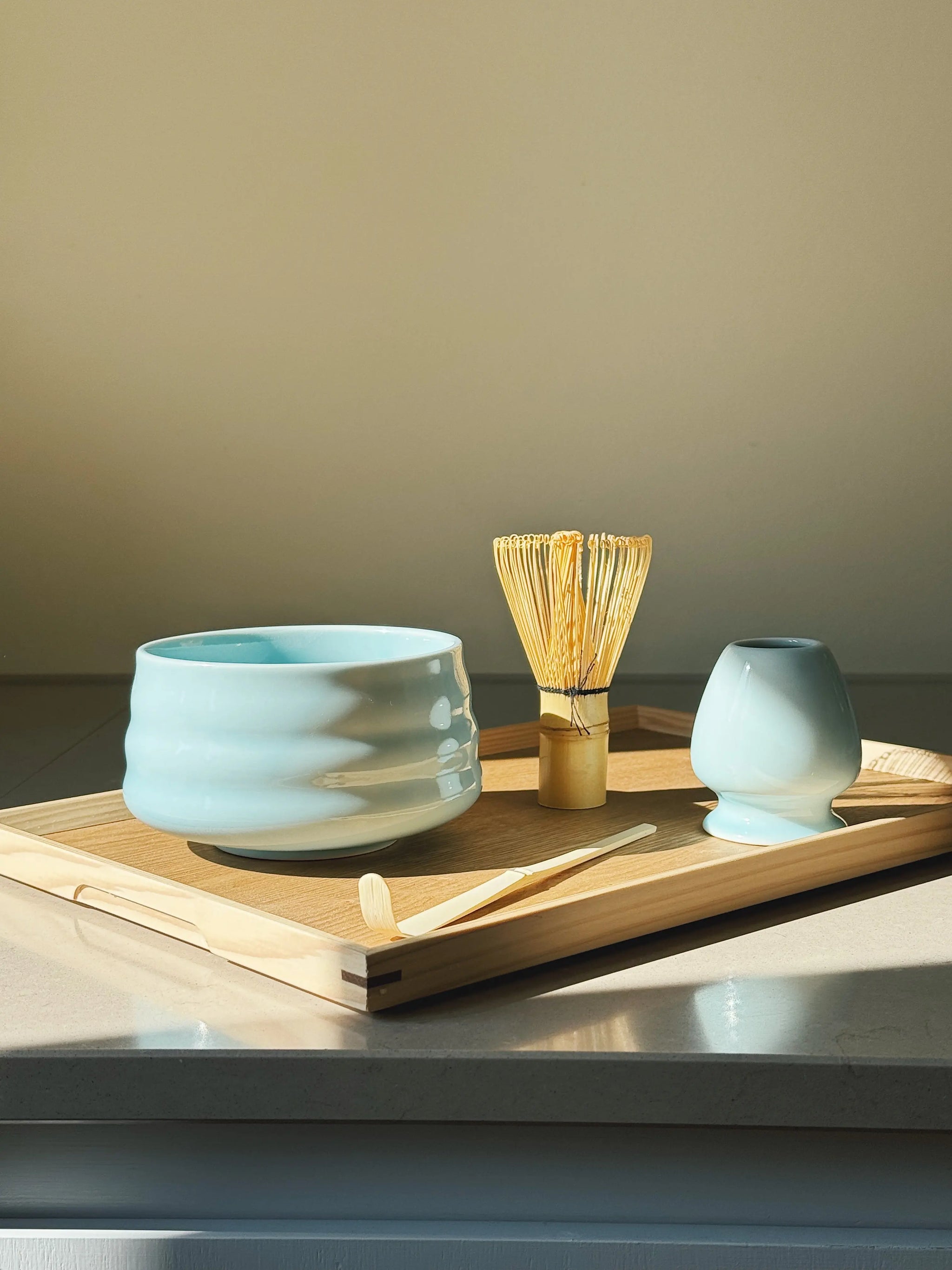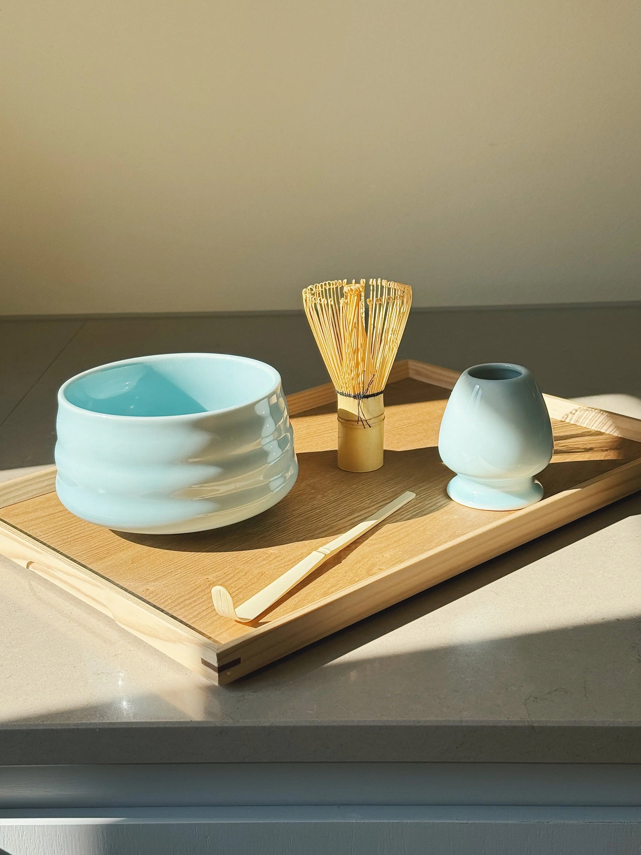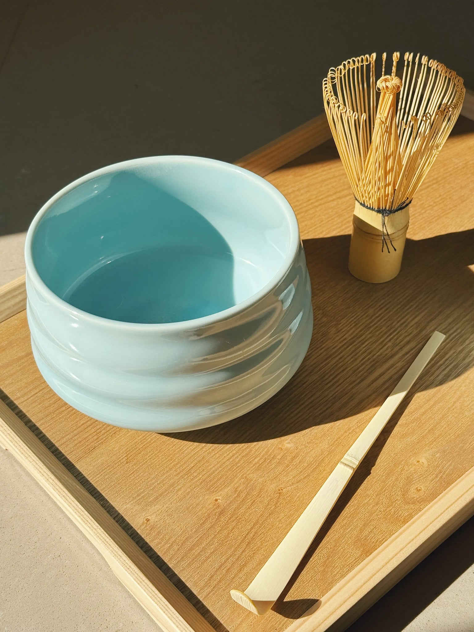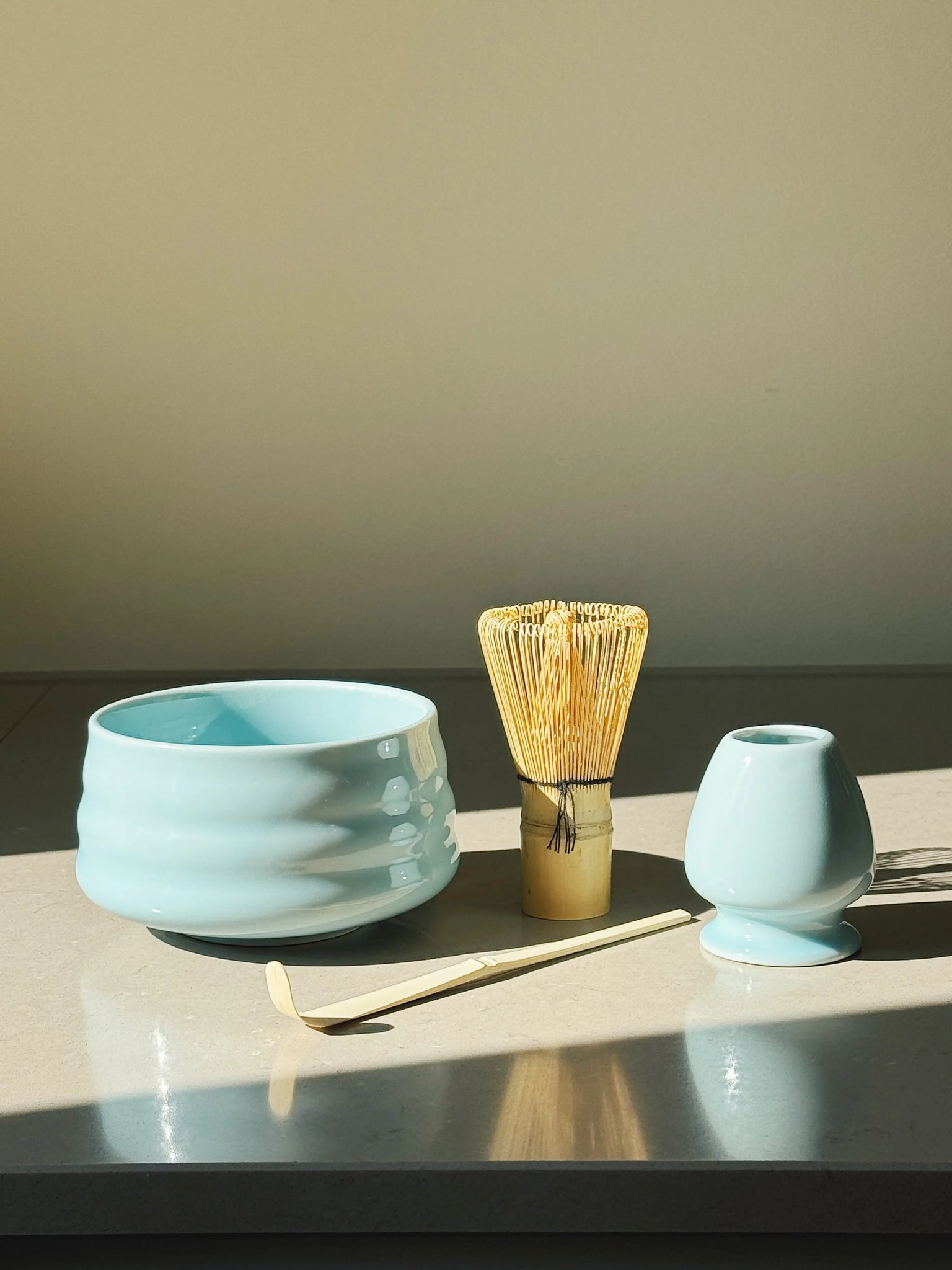 Matcha-sæt med skål, ske, piskeris og holder – lyseblå glaseret keramik