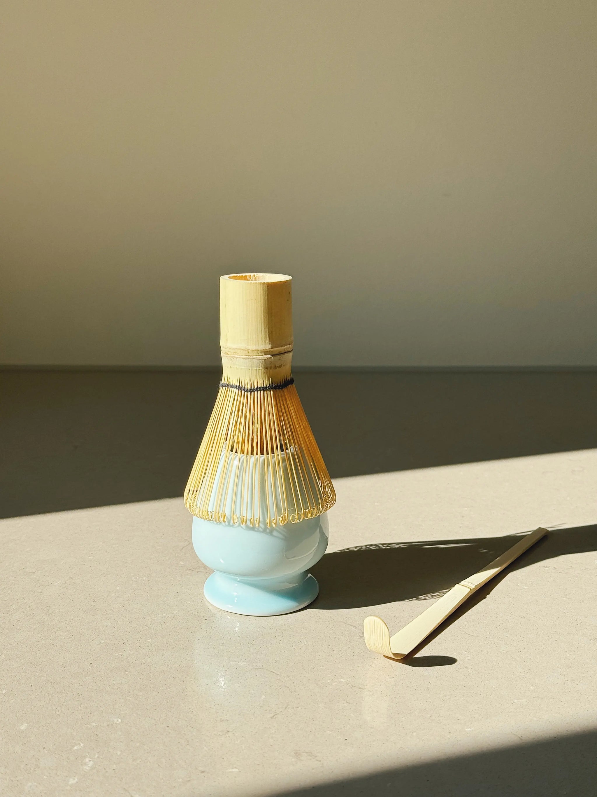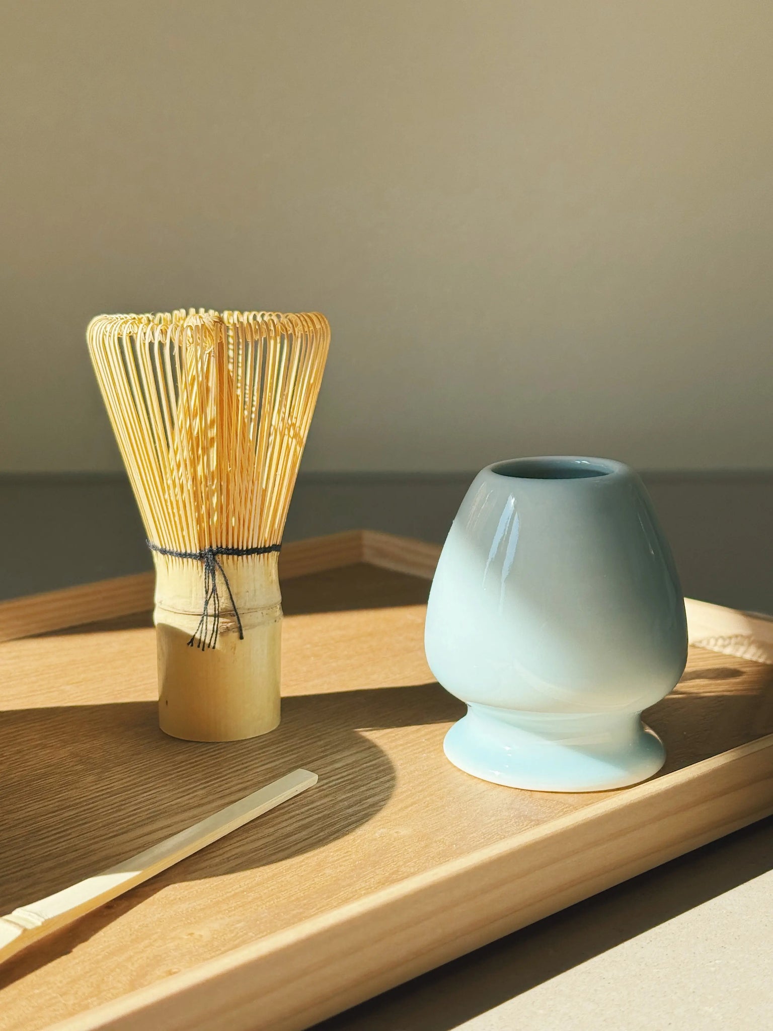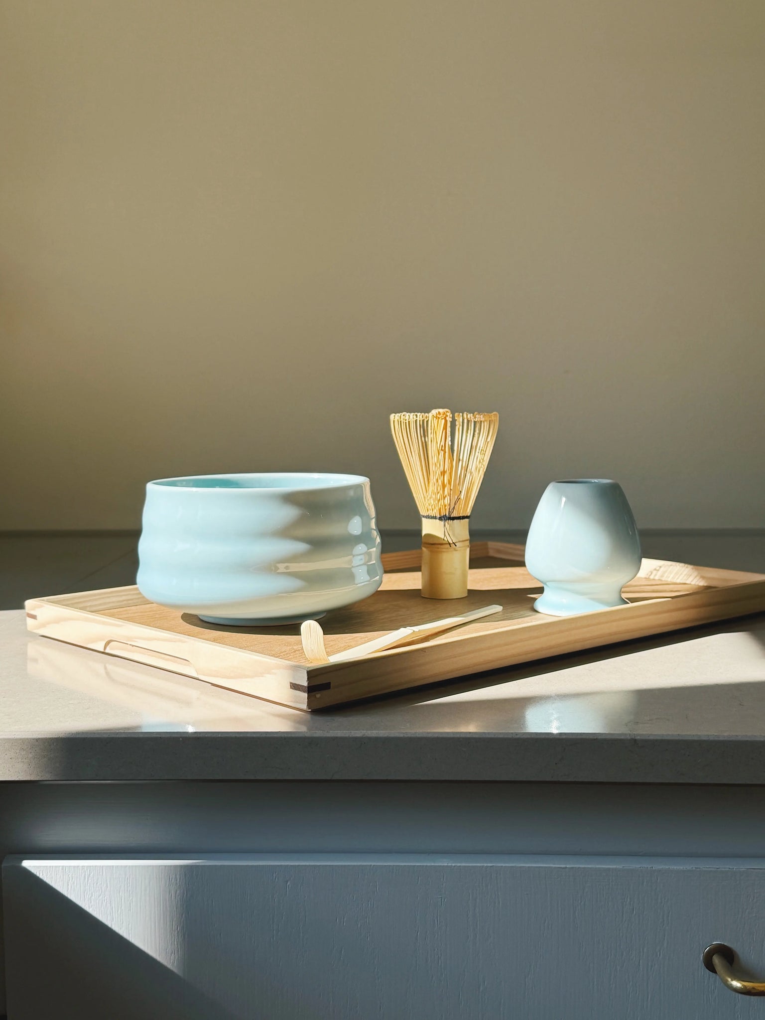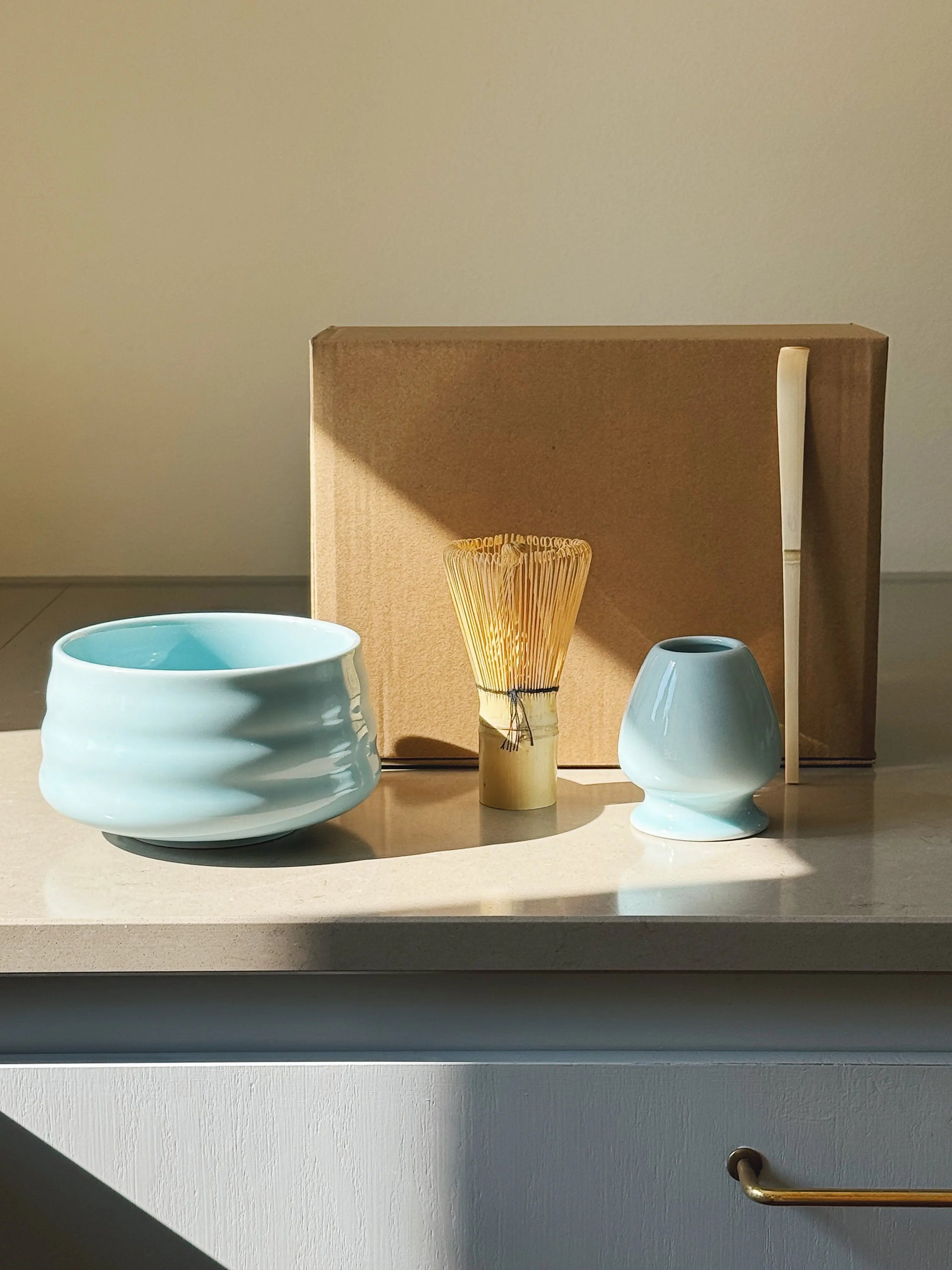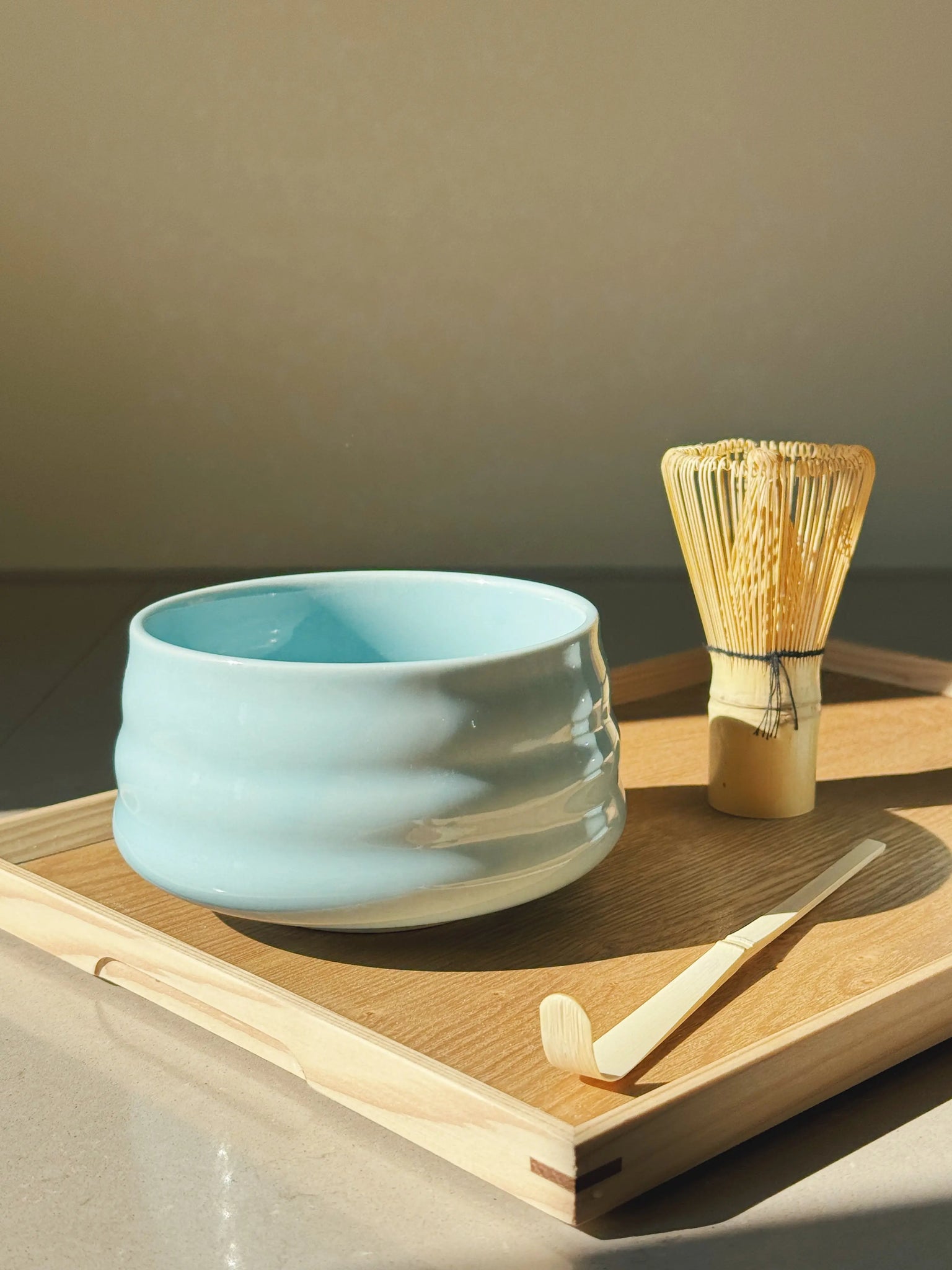 Matcha-sæt med skål, ske, piskeris og holder – lyseblå glaseret keramik