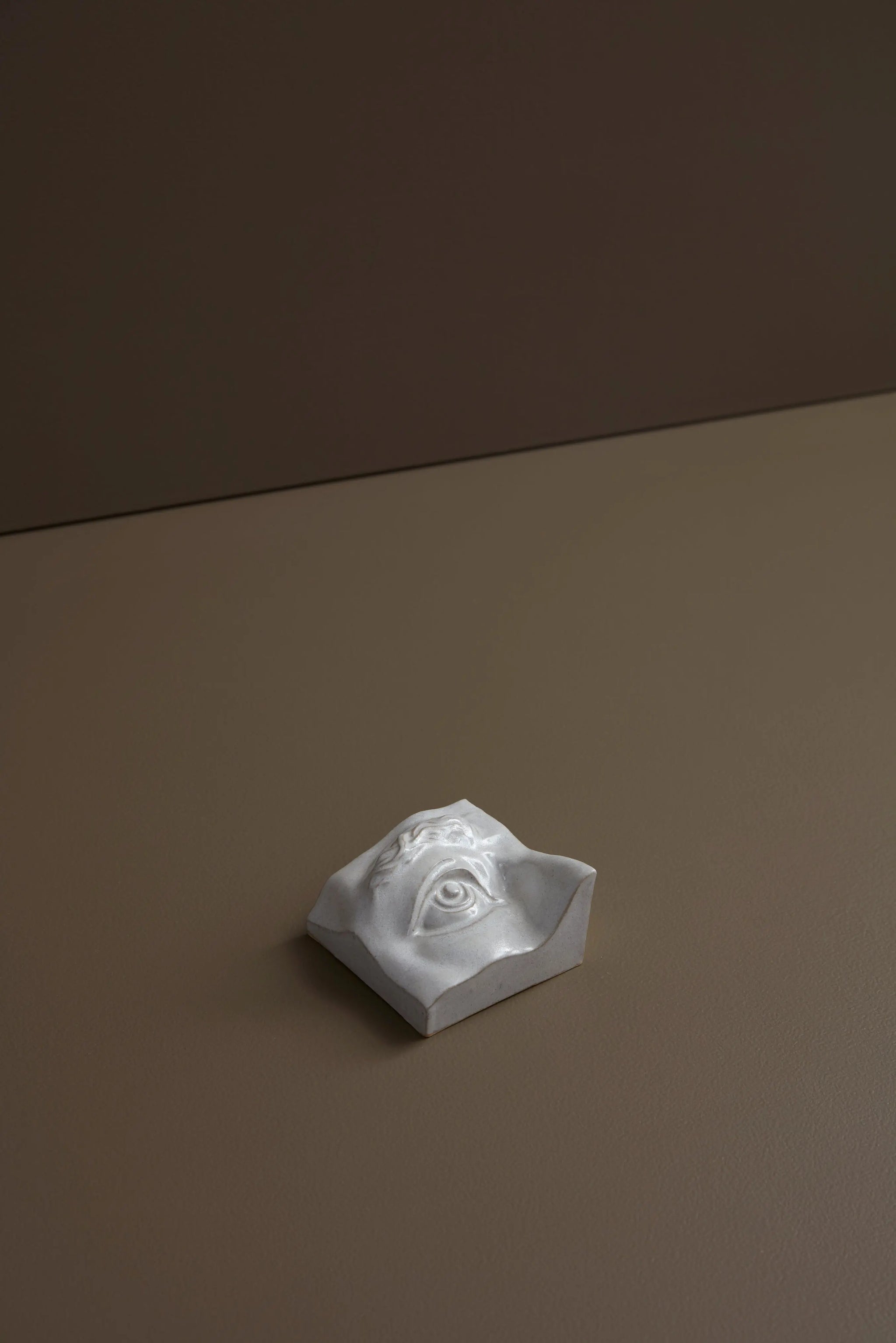 Fremstillet af glaseret hvid stentøjsler i farven AntiqueWhite, er dette øje designet til at blive ophængt på væggen og fungerer lige så godt alene som det gør sammen med andre ansigtsfragmenter.