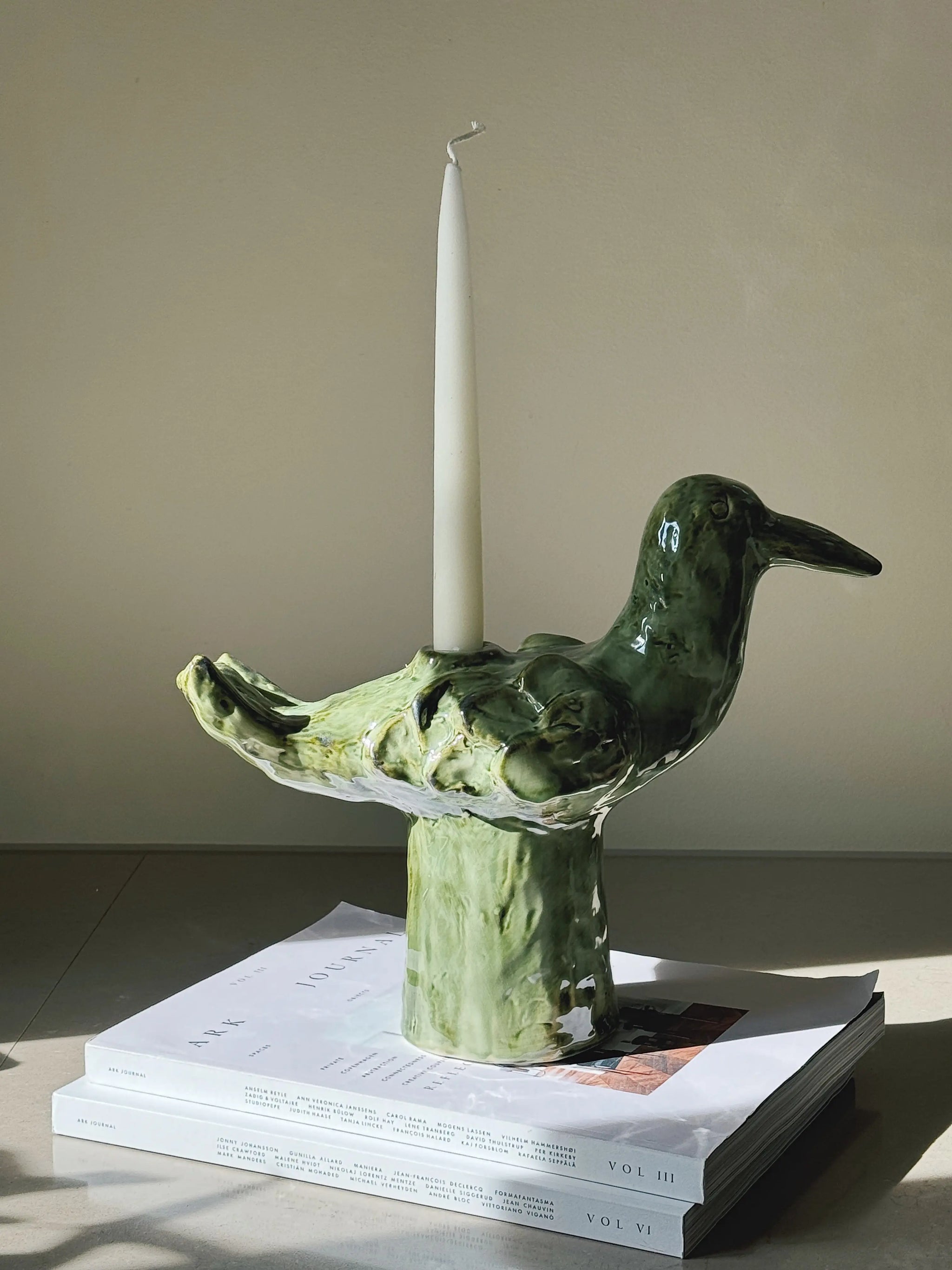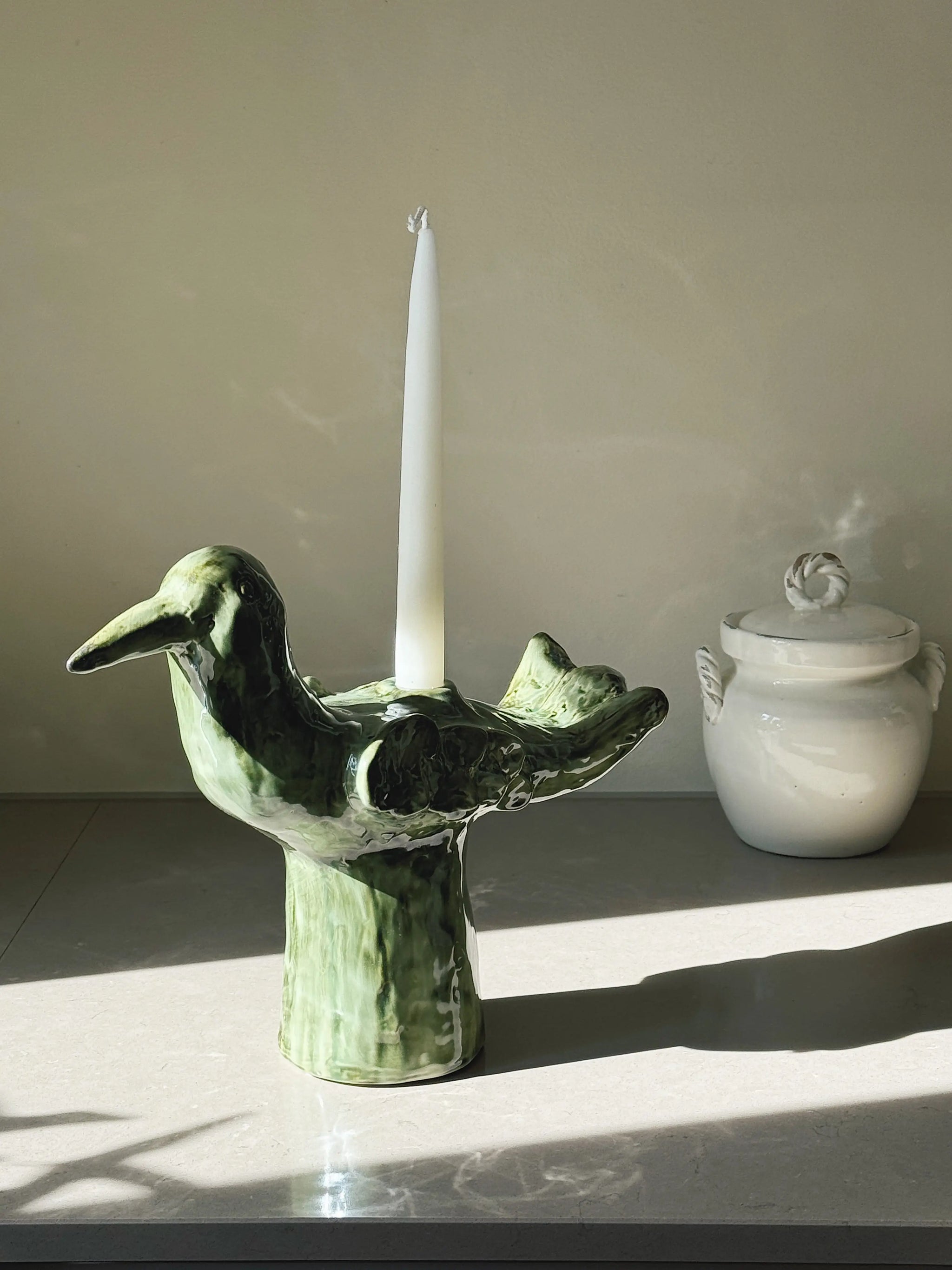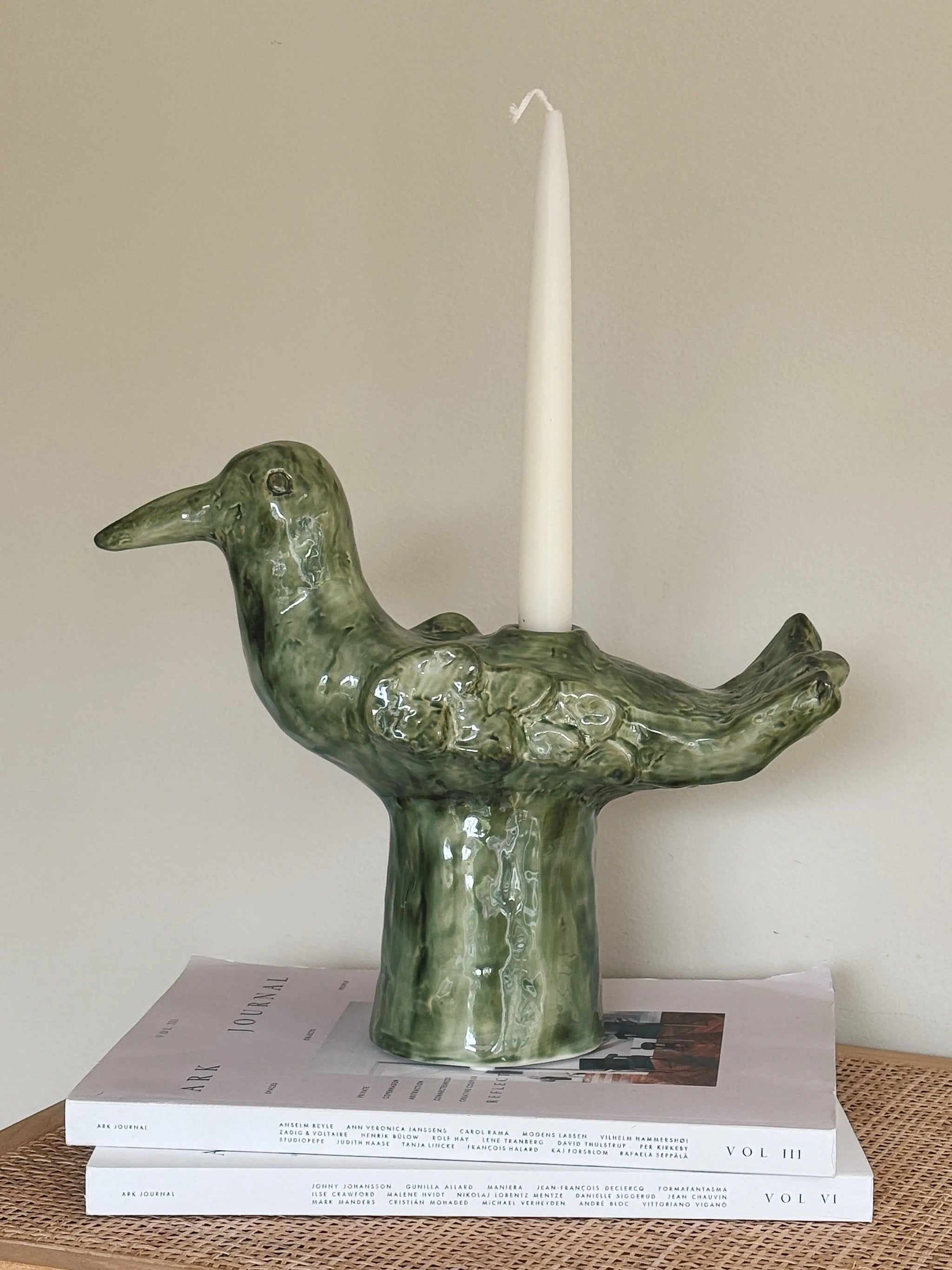 Den skulpturelle form leder tankerne hen på en fugl eller et mytisk væsen og gør lysestagen til både et funktionelt objekt og et keramisk kunstværk. Uanset om du placerer den midt på bordet, i vindueskarmen eller som en del af et dekorativt arrangement, tilfører den karakter og varme til din indretning.