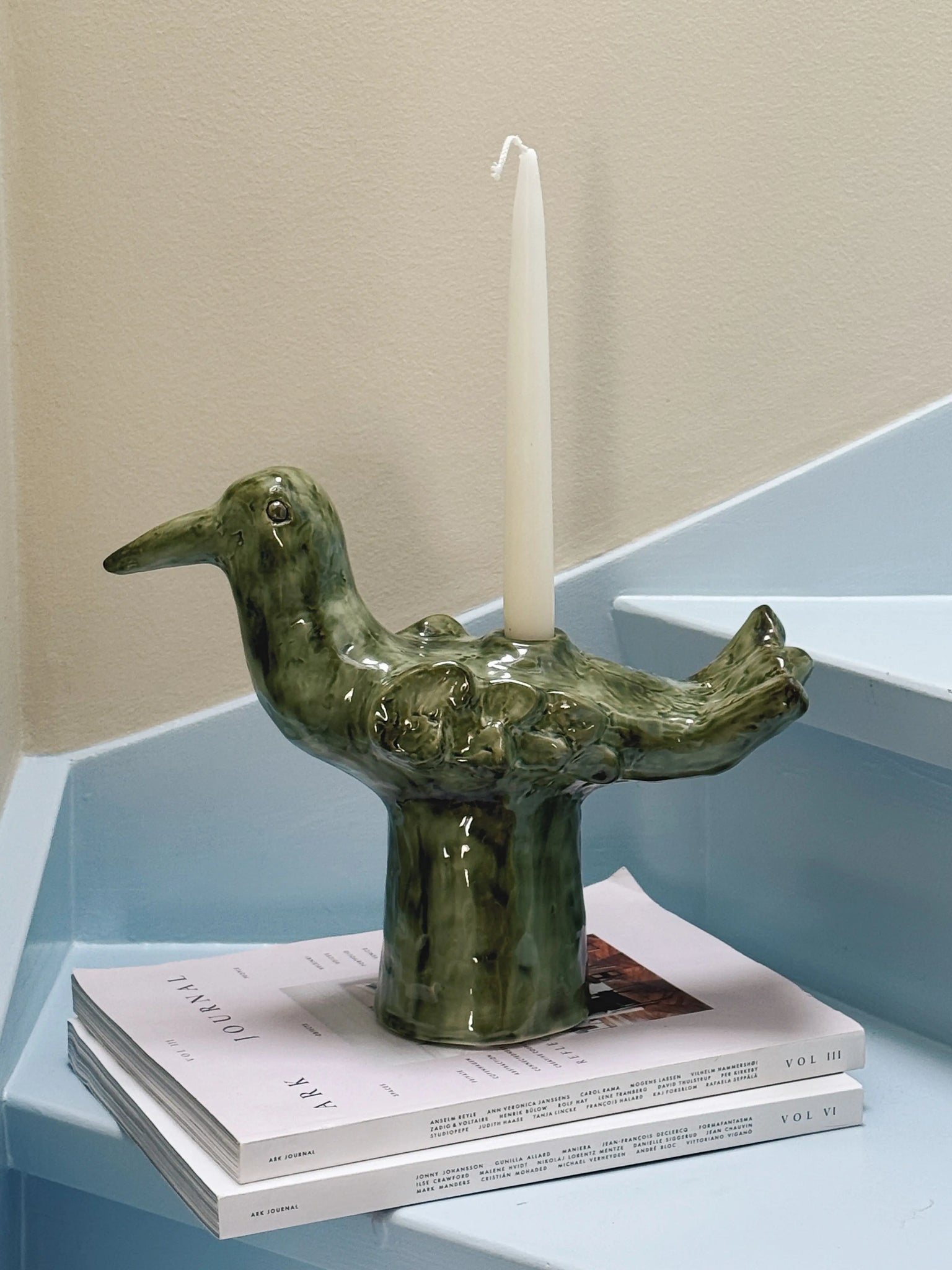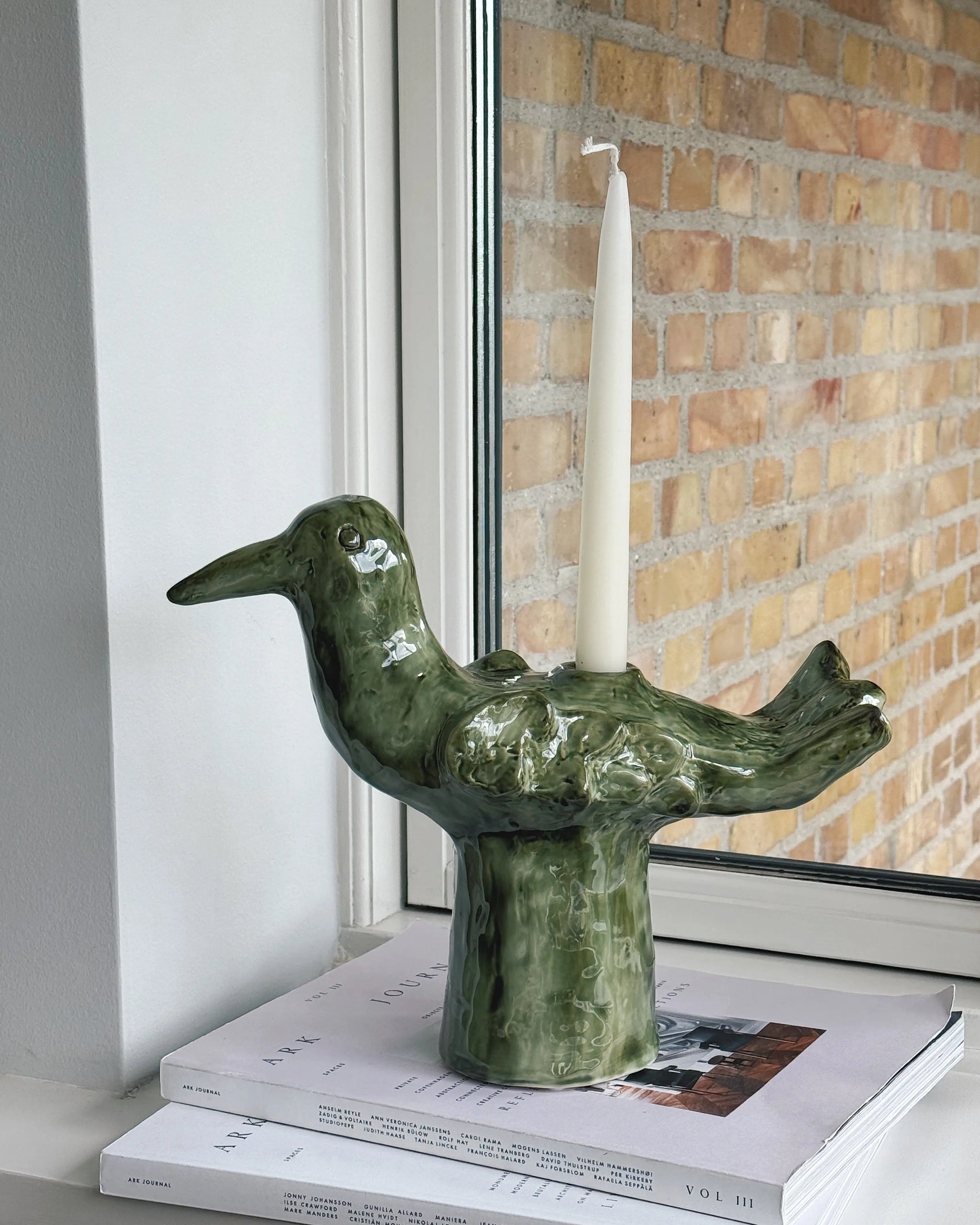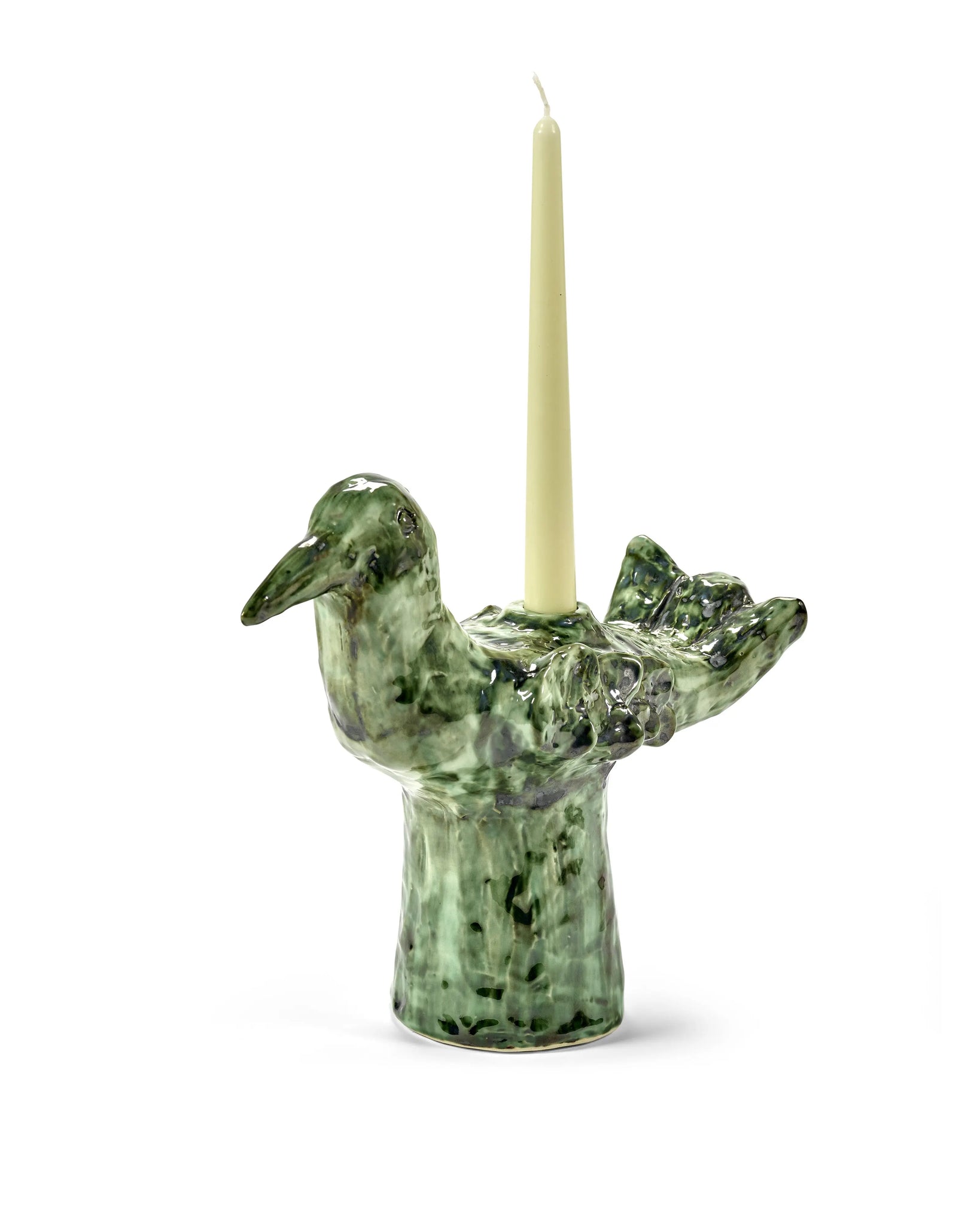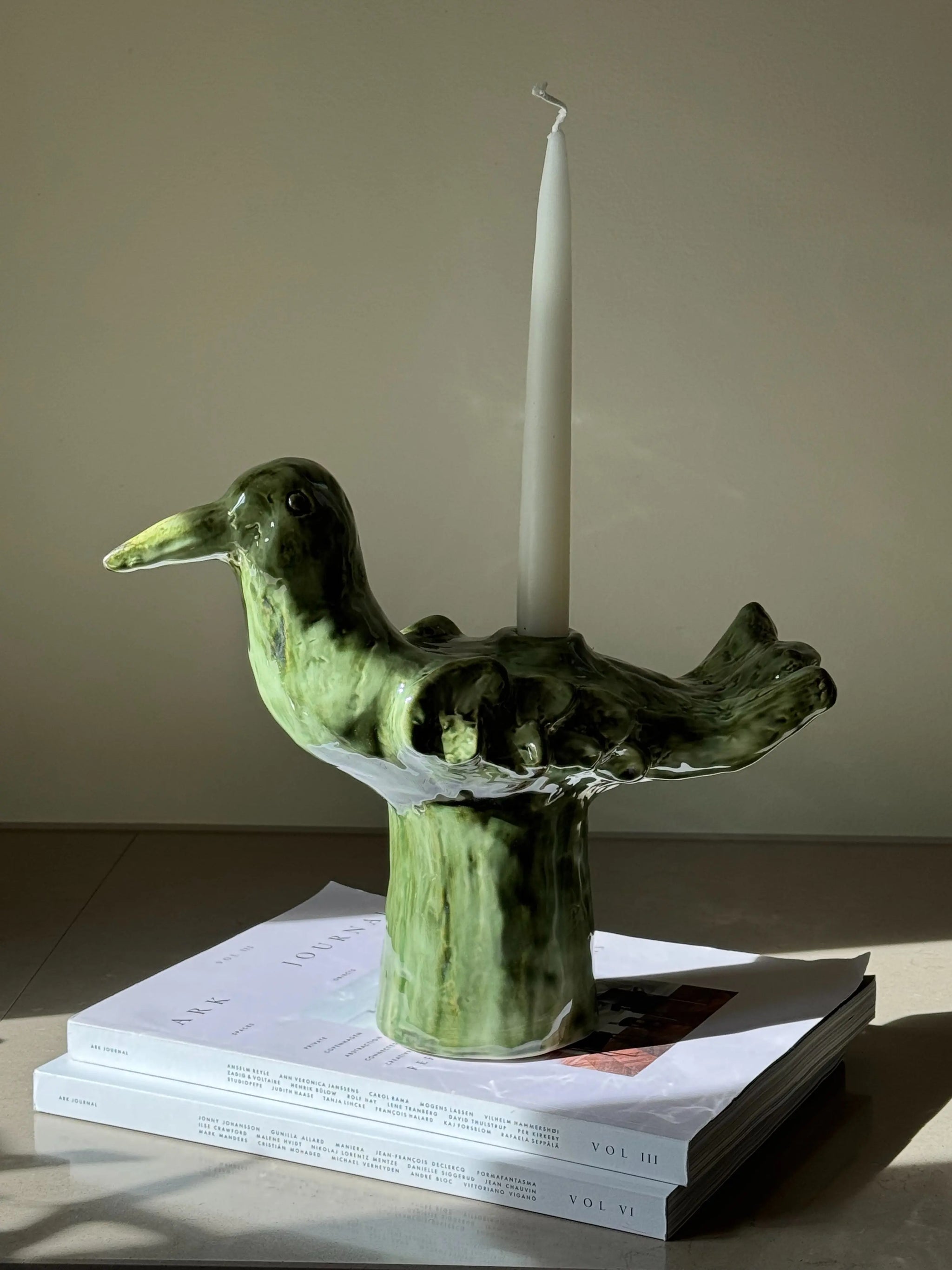 Den skulpturelle form leder tankerne hen på en fugl eller et mytisk væsen og gør lysestagen til både et funktionelt objekt og et keramisk kunstværk. Uanset om du placerer den midt på bordet, i vindueskarmen eller som en del af et dekorativt arrangement, tilfører den karakter og varme til din indretning.