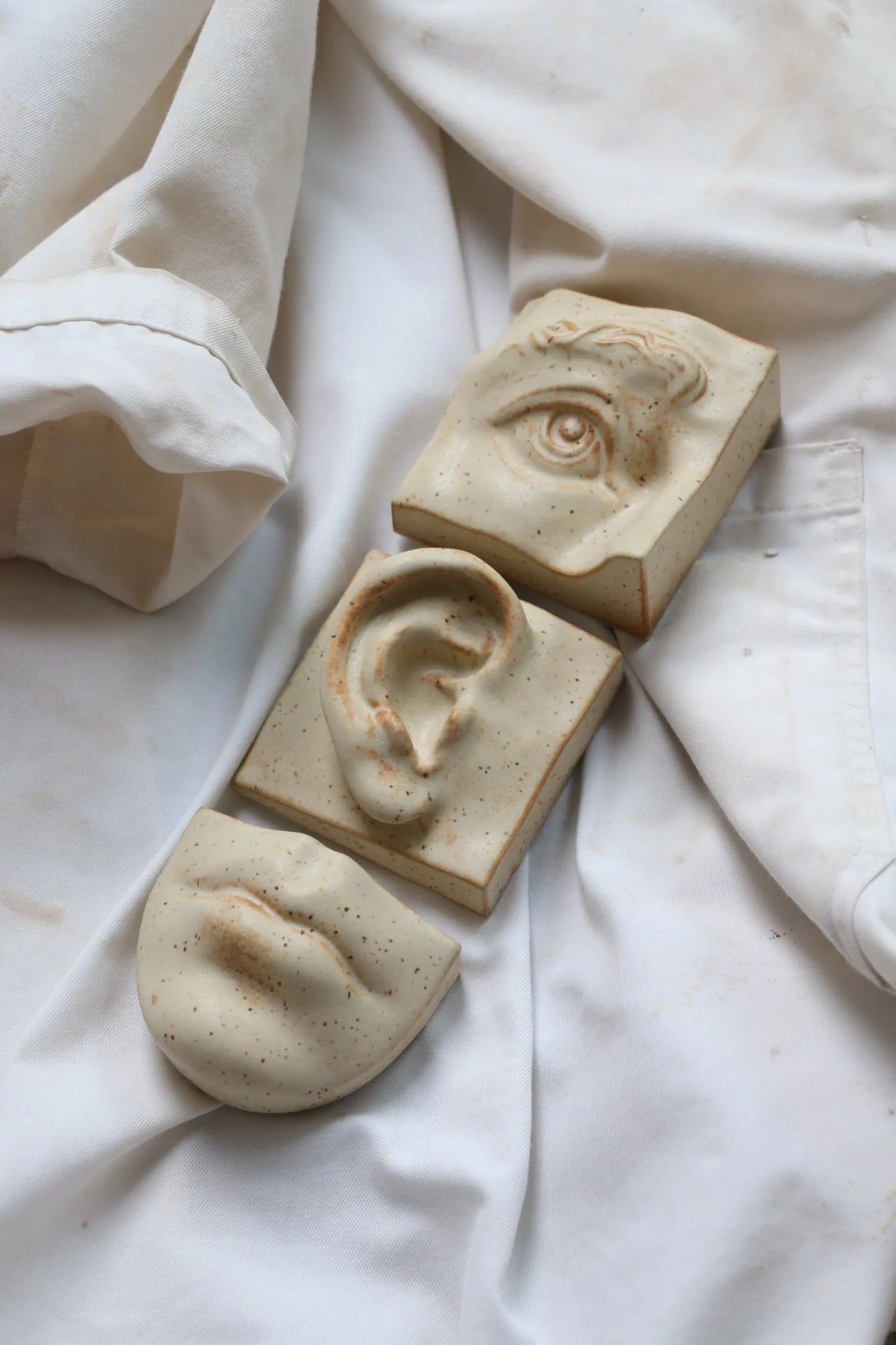 Denne unikke Kombination 8 består af tre relieffer, der repræsenterer et højre øje, et højre øre og en lille mund. Designet til vægophæng, skaber værket en harmonisk og symbolsk helhed i dit hjem. Håndlavet i Aarhus og inspireret af antikkens skulpturkunst, forener det tradition med modernitet.