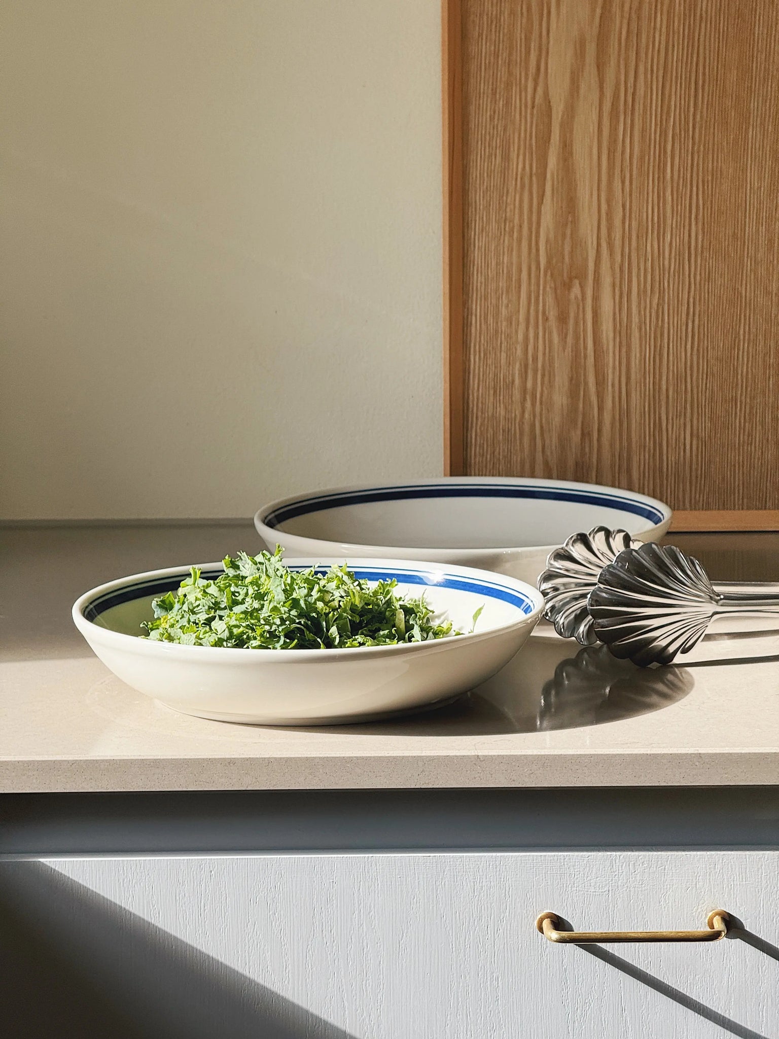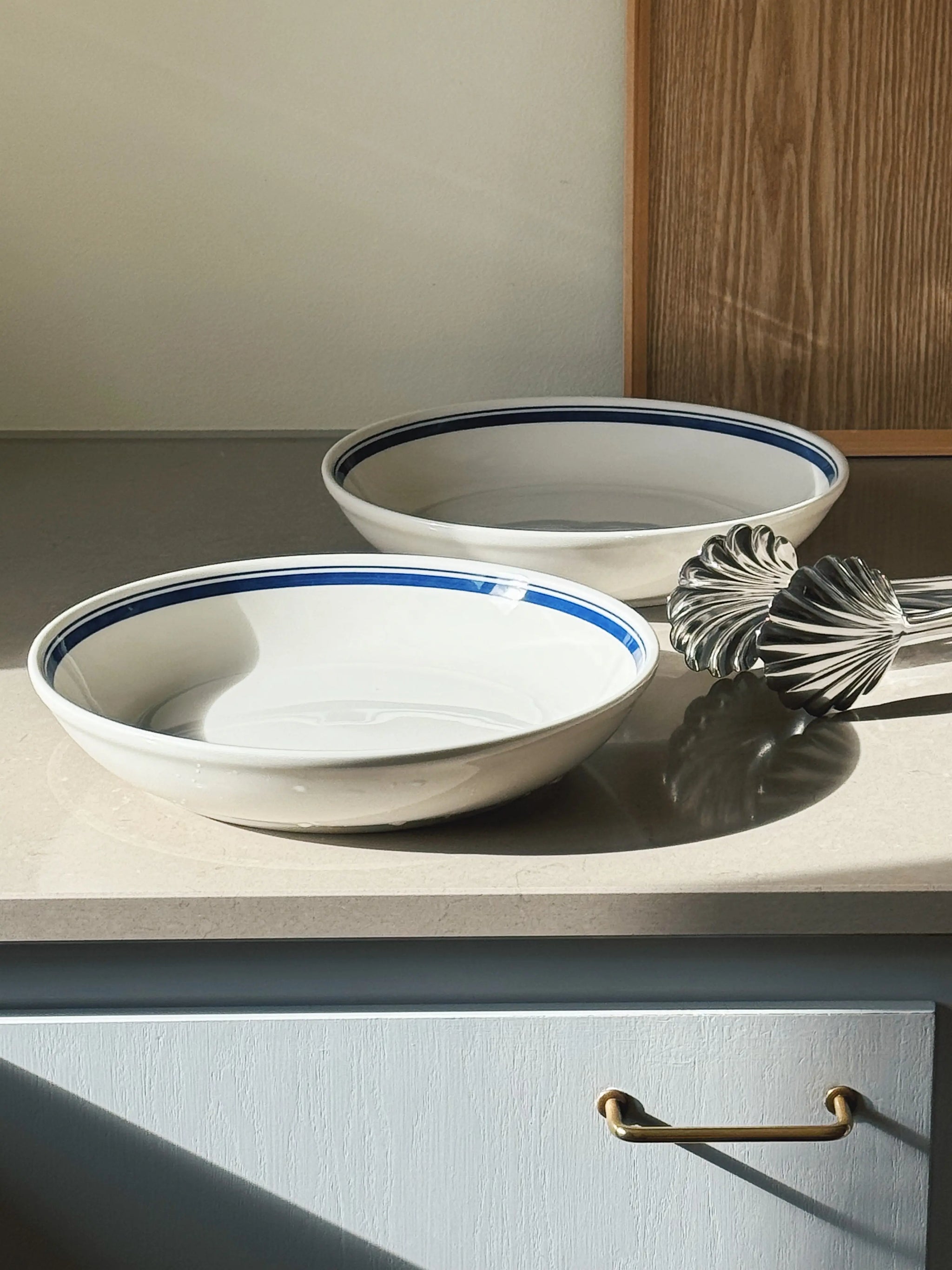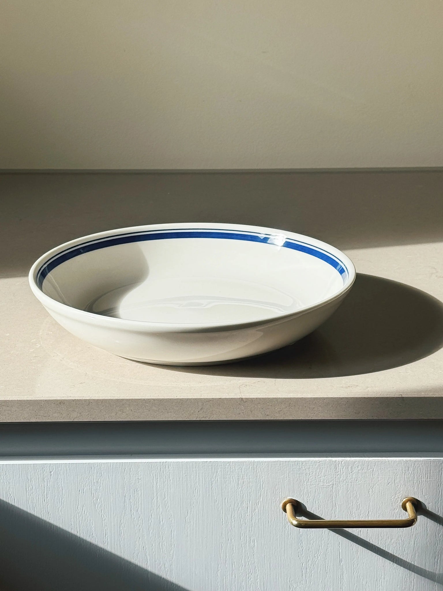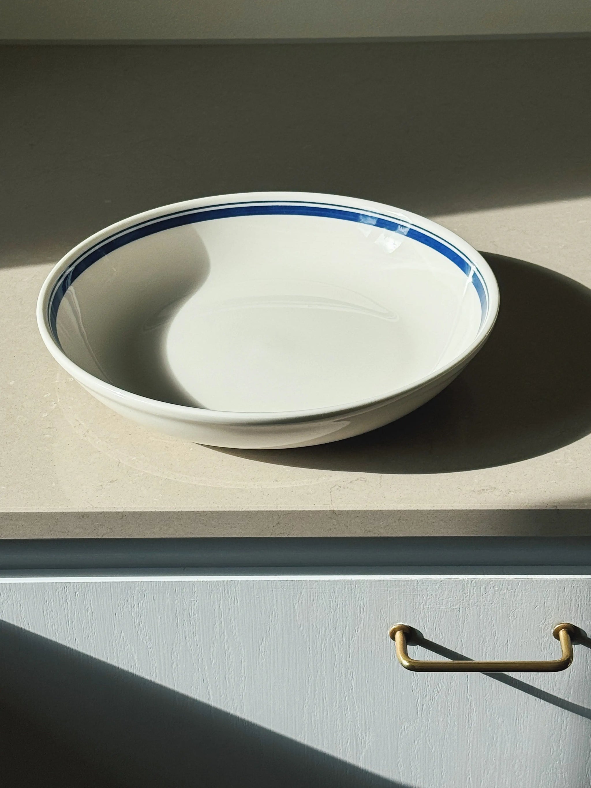 Stor, lav keramikskål i klassisk retrostil fra Japan, dekoreret med blå striber. Med sin brede form og rummelige størrelse er skålen ideel til servering af salater, pastaretter, grøntsager, snacks eller delte måltider. Et smukt og funktionelt valg, der kombinerer æstetik og praktisk brug i både hverdagen og ved gæstemiddage.
