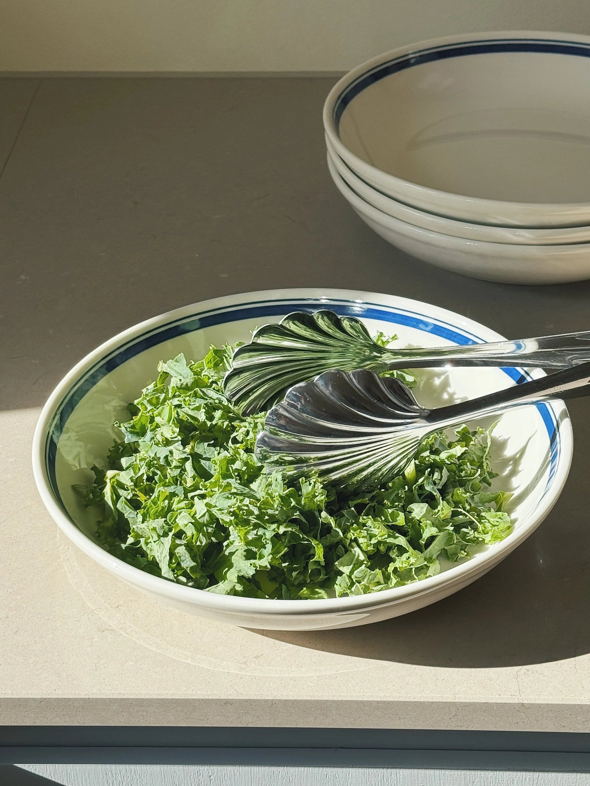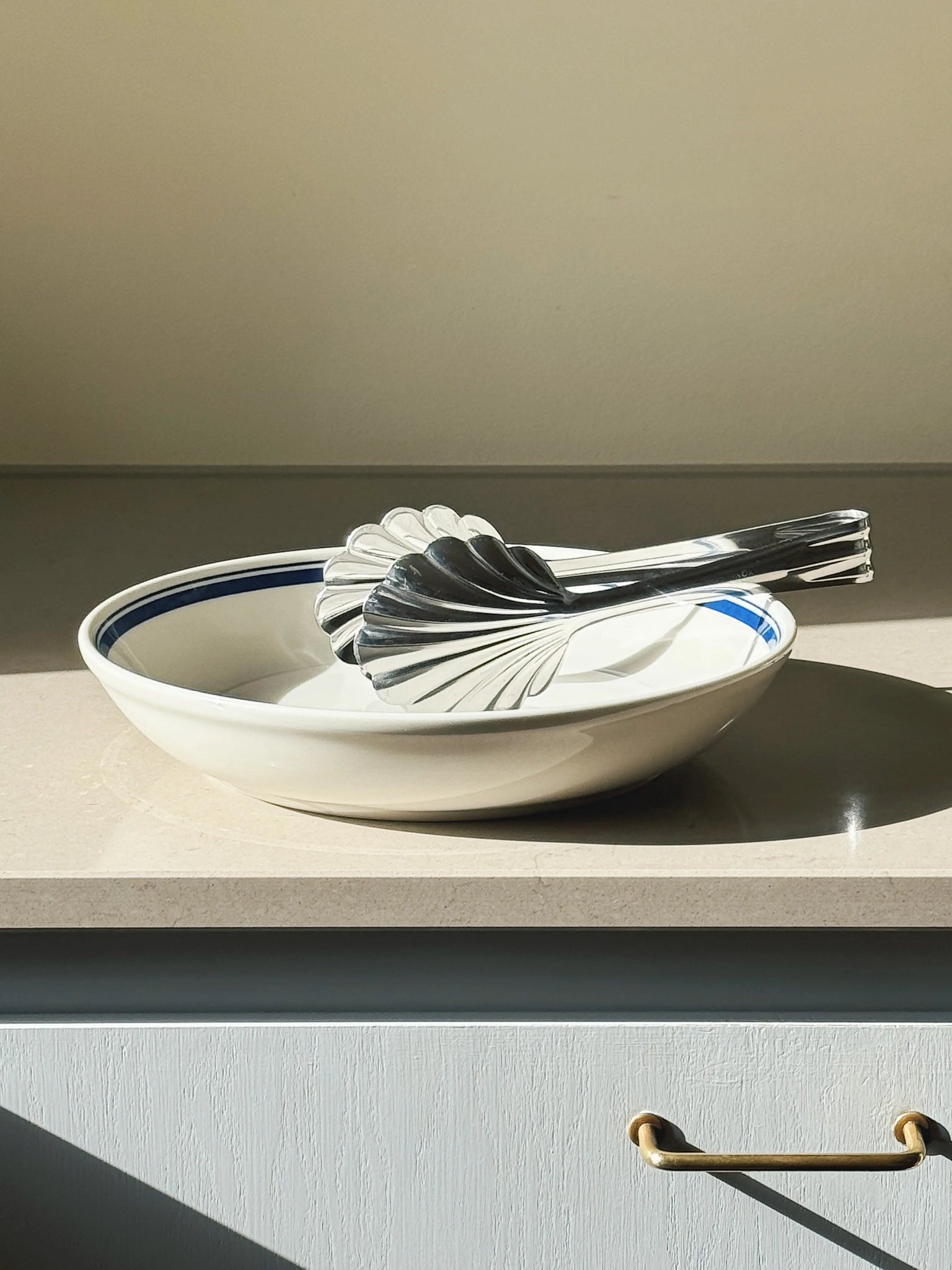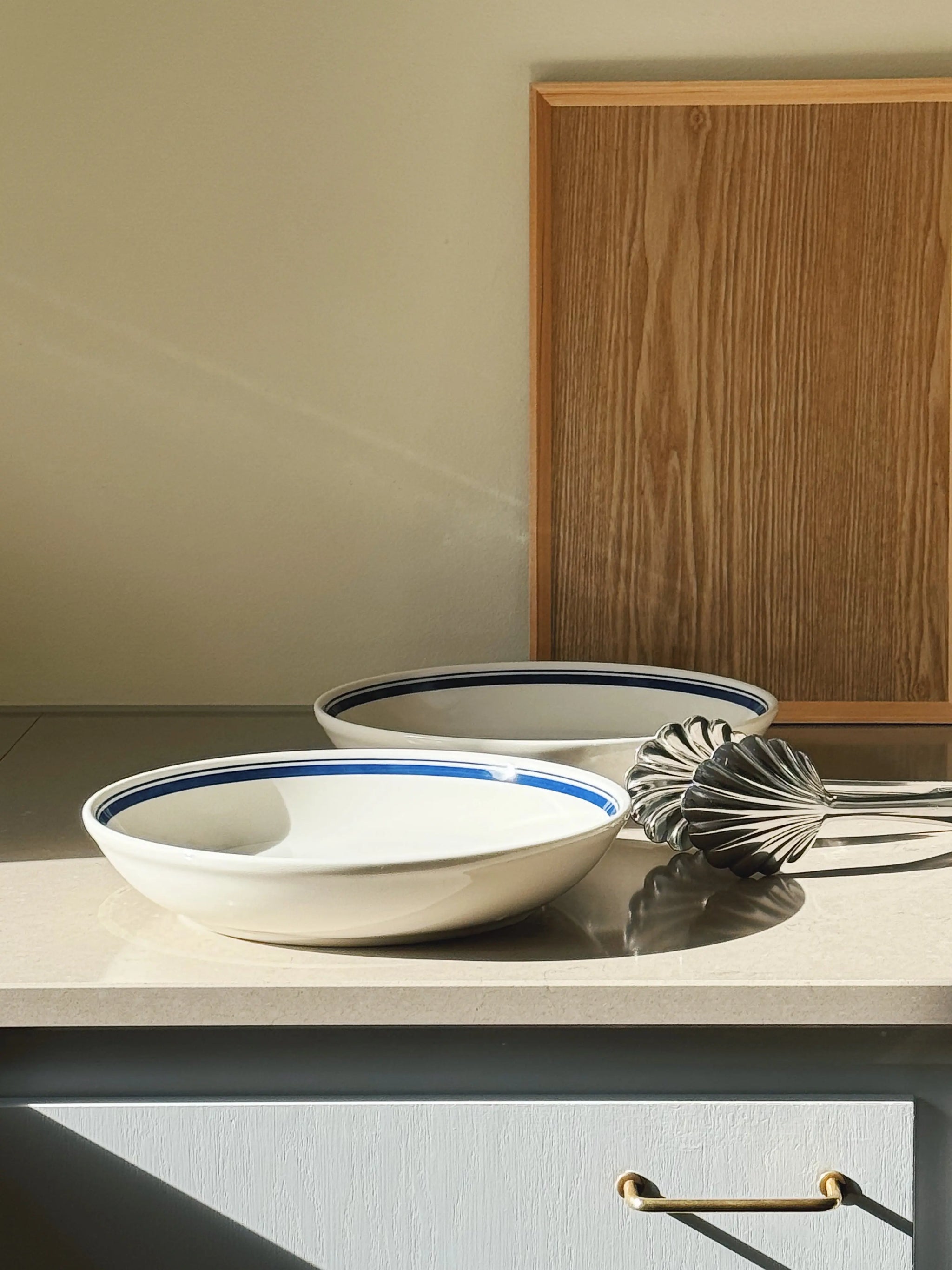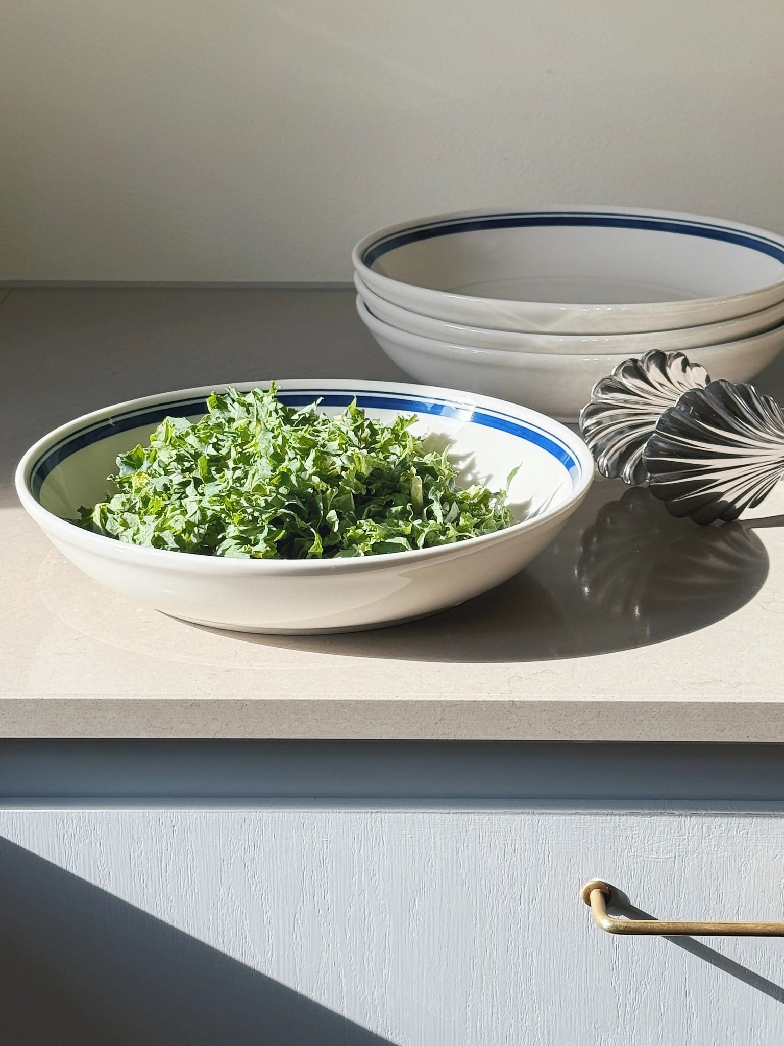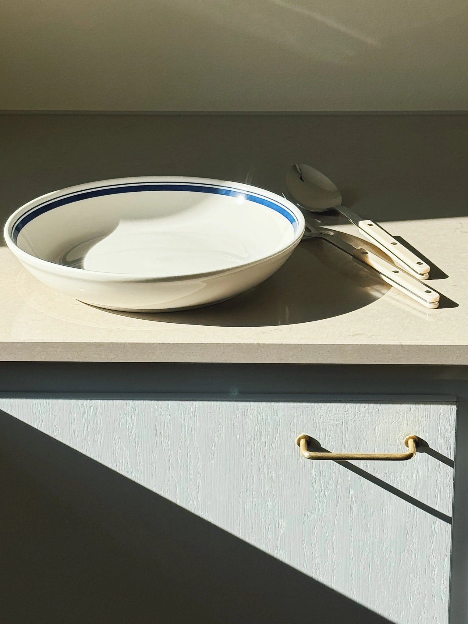 Stor, lav keramikskål i klassisk retrostil fra Japan, dekoreret med blå striber. Med sin brede form og rummelige størrelse er skålen ideel til servering af salater, pastaretter, grøntsager, snacks eller delte måltider. Et smukt og funktionelt valg, der kombinerer æstetik og praktisk brug i både hverdagen og ved gæstemiddage.