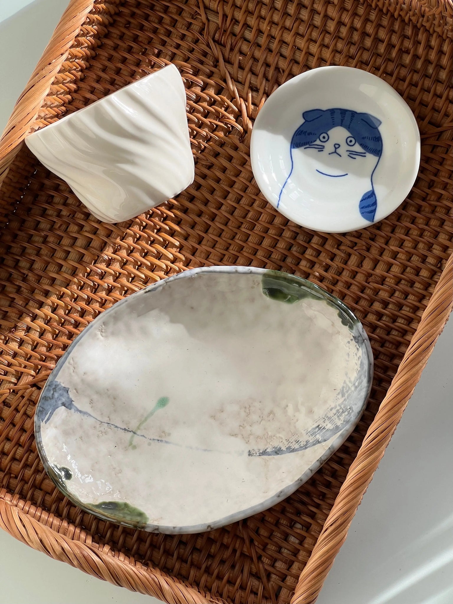 Smukt ovalt fad/tallerken fra Japan i hvid keramik med grønt og blåt mønster. Fadet findes i to størrelser, og er perfekt at bruge til sushi, små snacks, nødder, kage, frugt eller lignende, ligesom det er fint at have stående til pynt med smykker og nipsting på.