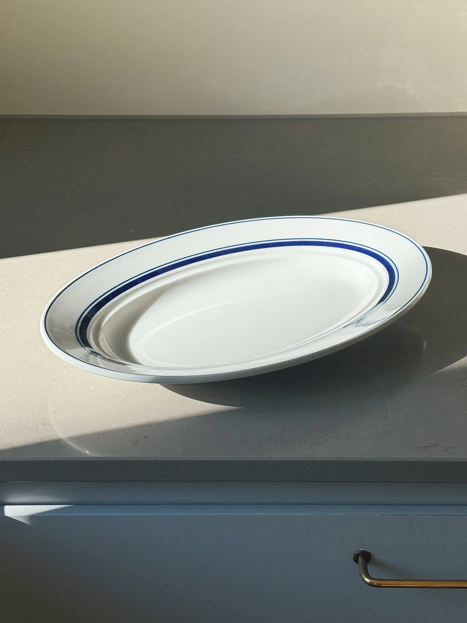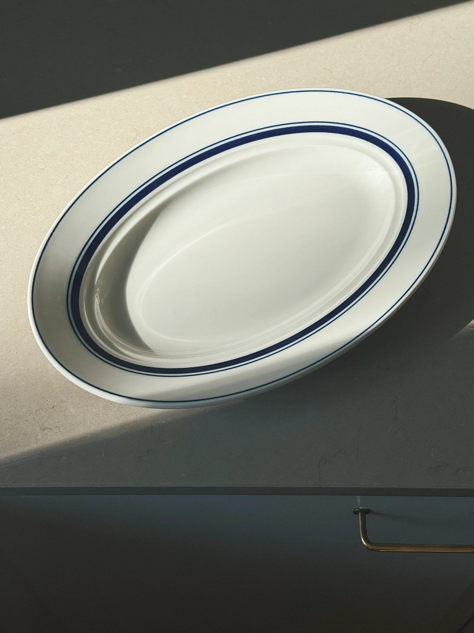 Smuk retro serveringsfad i hvid keramik med blå striber fra Japan. I samme serie findes også tallerken, dyb tallerken og skål. Serveringsfadet er perfekt at bruge til forret, dessert, kage og lignende, ligesom det kan bruges til servering af pasta, frugt, grøntsager, fisk m.m. Fadet findes også i en mindre størrelse (29 x 20.1 cm x H3.6 cm).