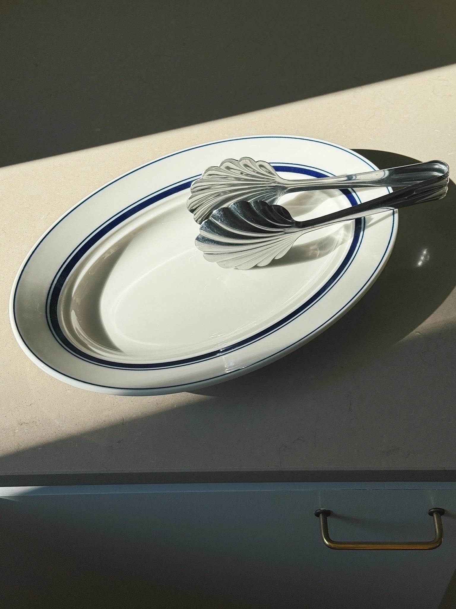 Hvidt serveringsfad med blå striber i keramik fra Japan | 32.6 cm