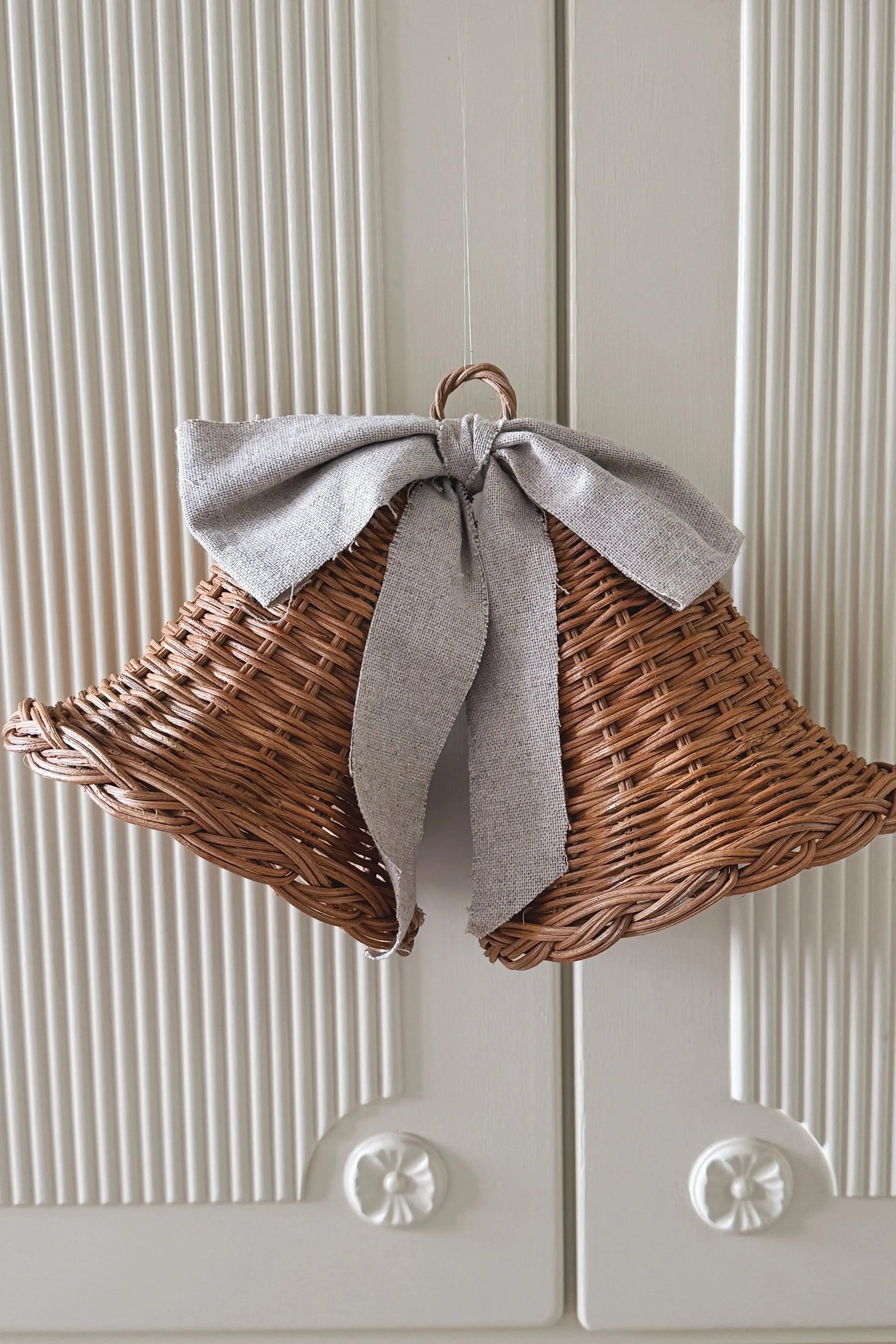 Tilføj et roligt og naturligt udtryk til din julepynt med dette sæt af to store hængende juleklokker i håndflettet rattan – samlet med en lys, naturfarvet sløjfe i grov vævning.