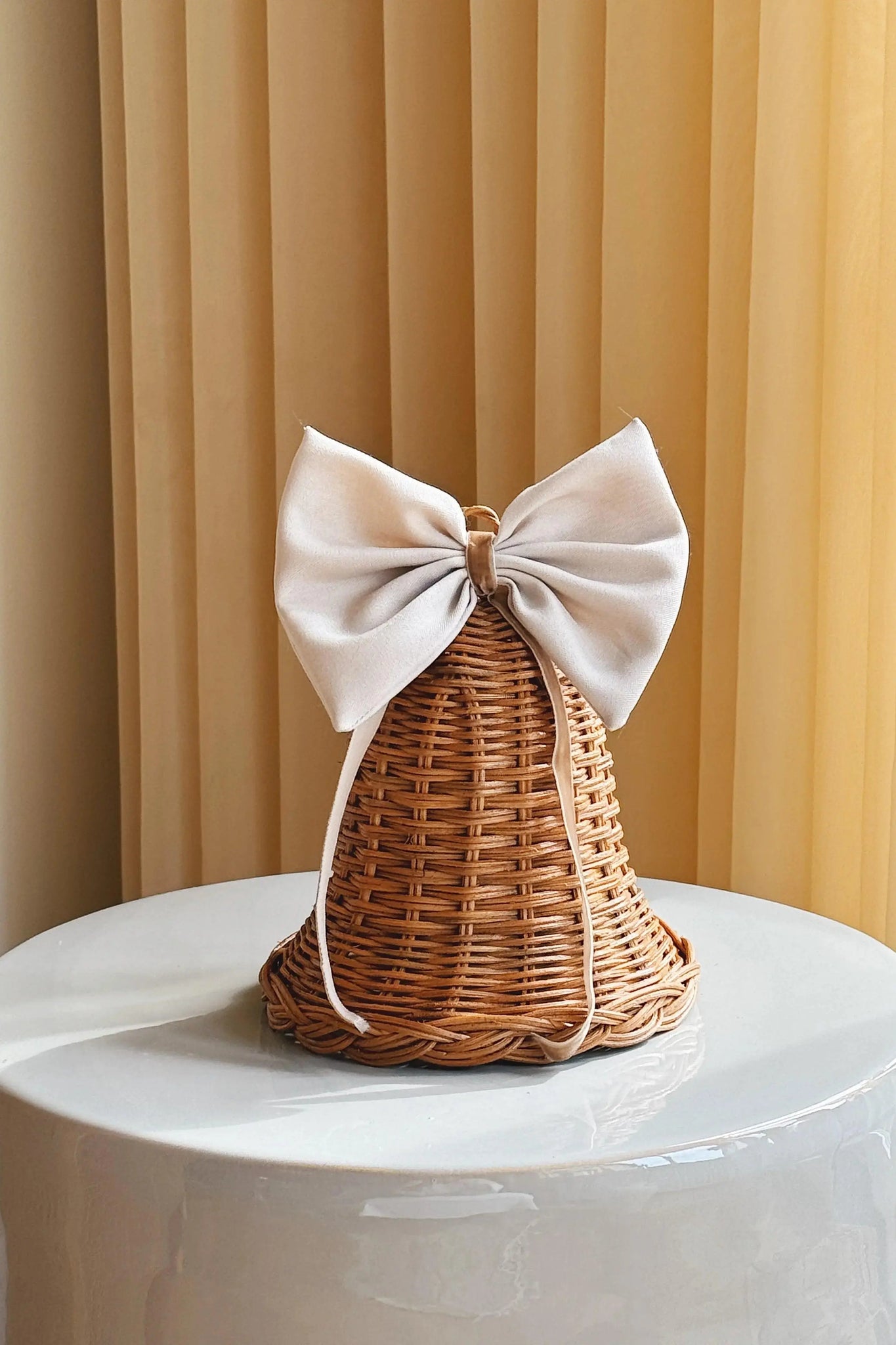 Tilføj varme, tekstur og naturlig elegance til din juleudsmykning med denne store, håndlavede juleklokke i rattan. Klokken er smukt pyntet med en stor, lys sløjfe i glat bomuldsstof med bløde velourbånd som afslutning – en enkel og stemningsfuld kontrast til det flettede naturmateriale.