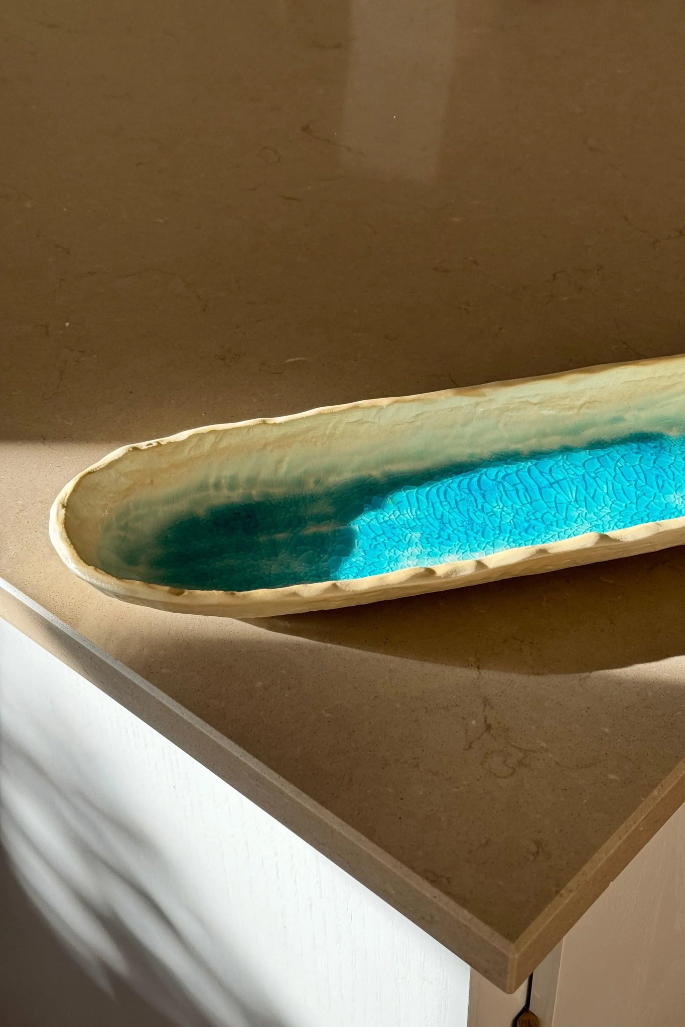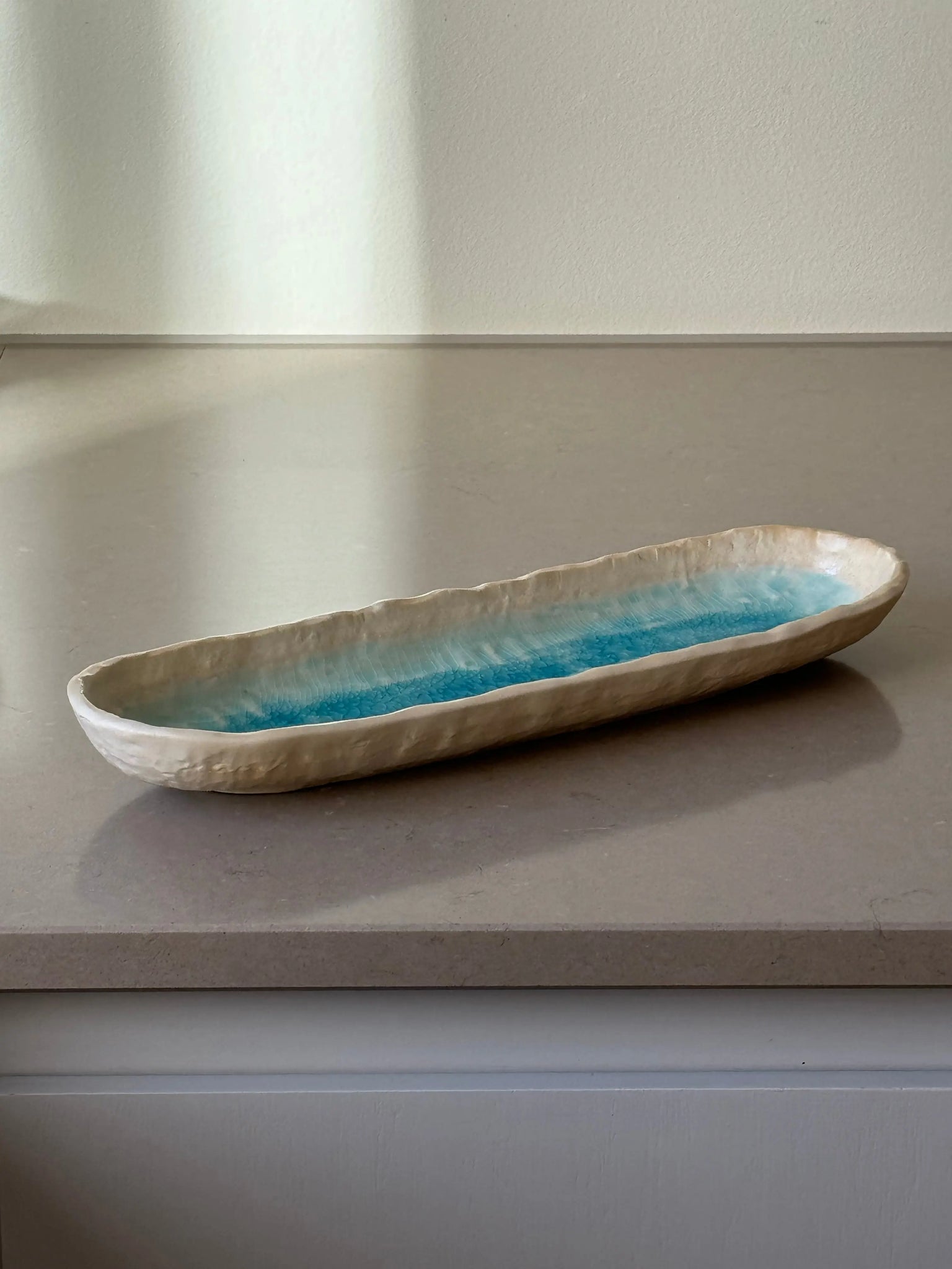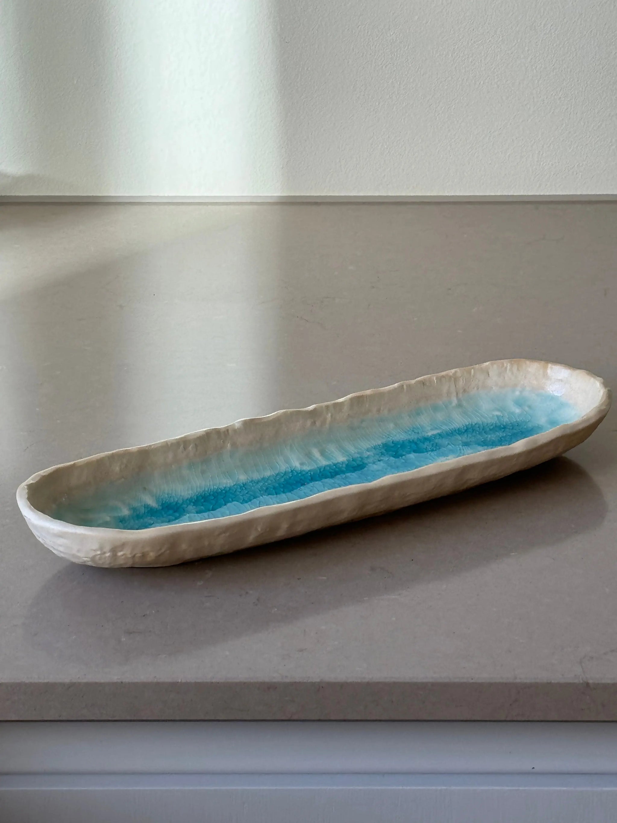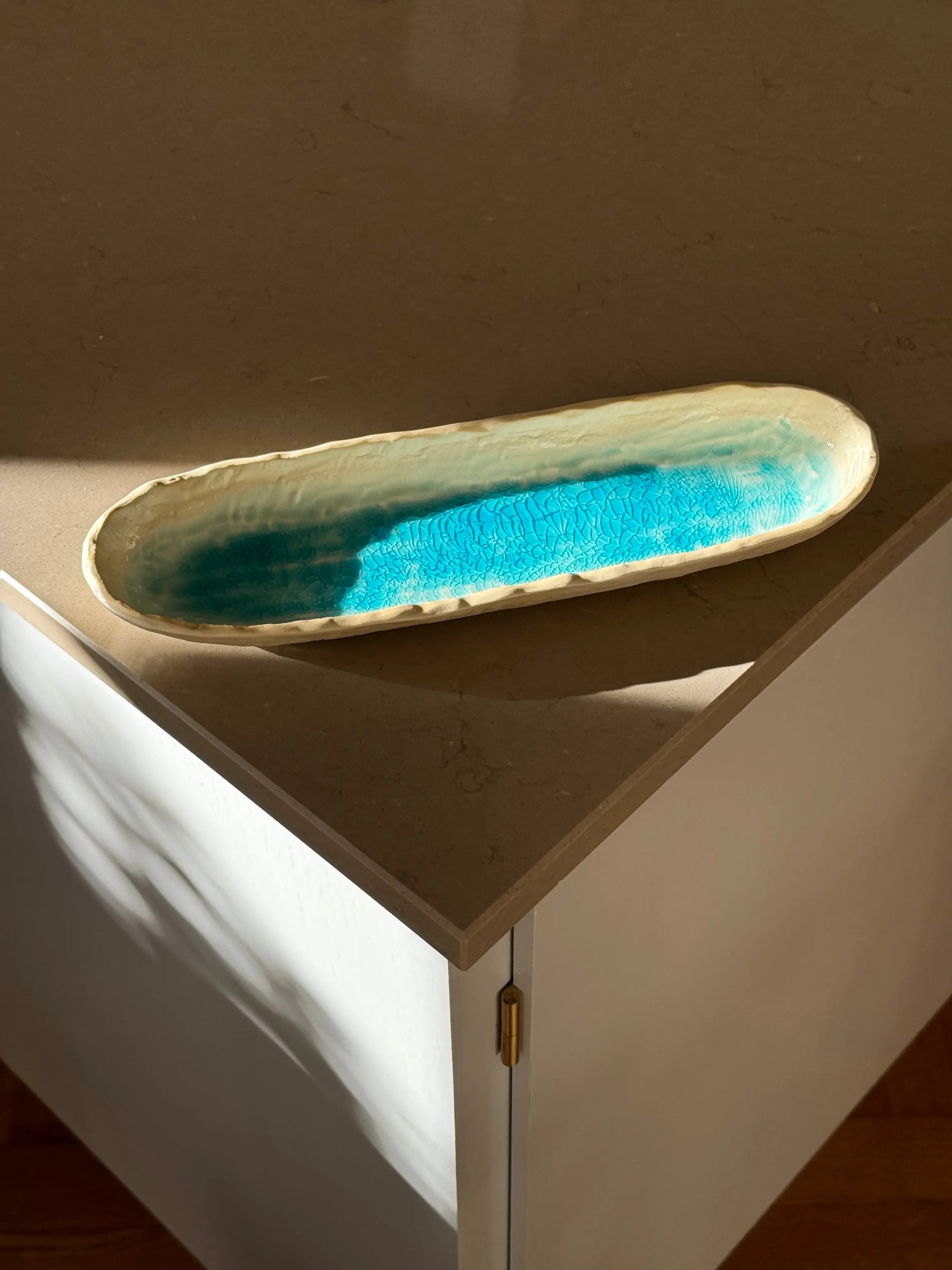 Aflangt ovalt fad/tallerken fra Japan i turkis og sand keramik
