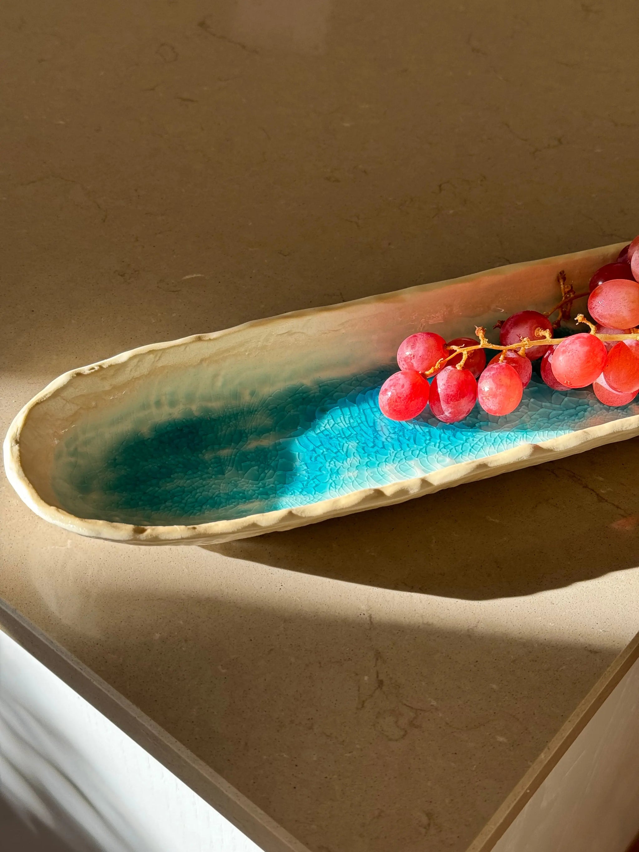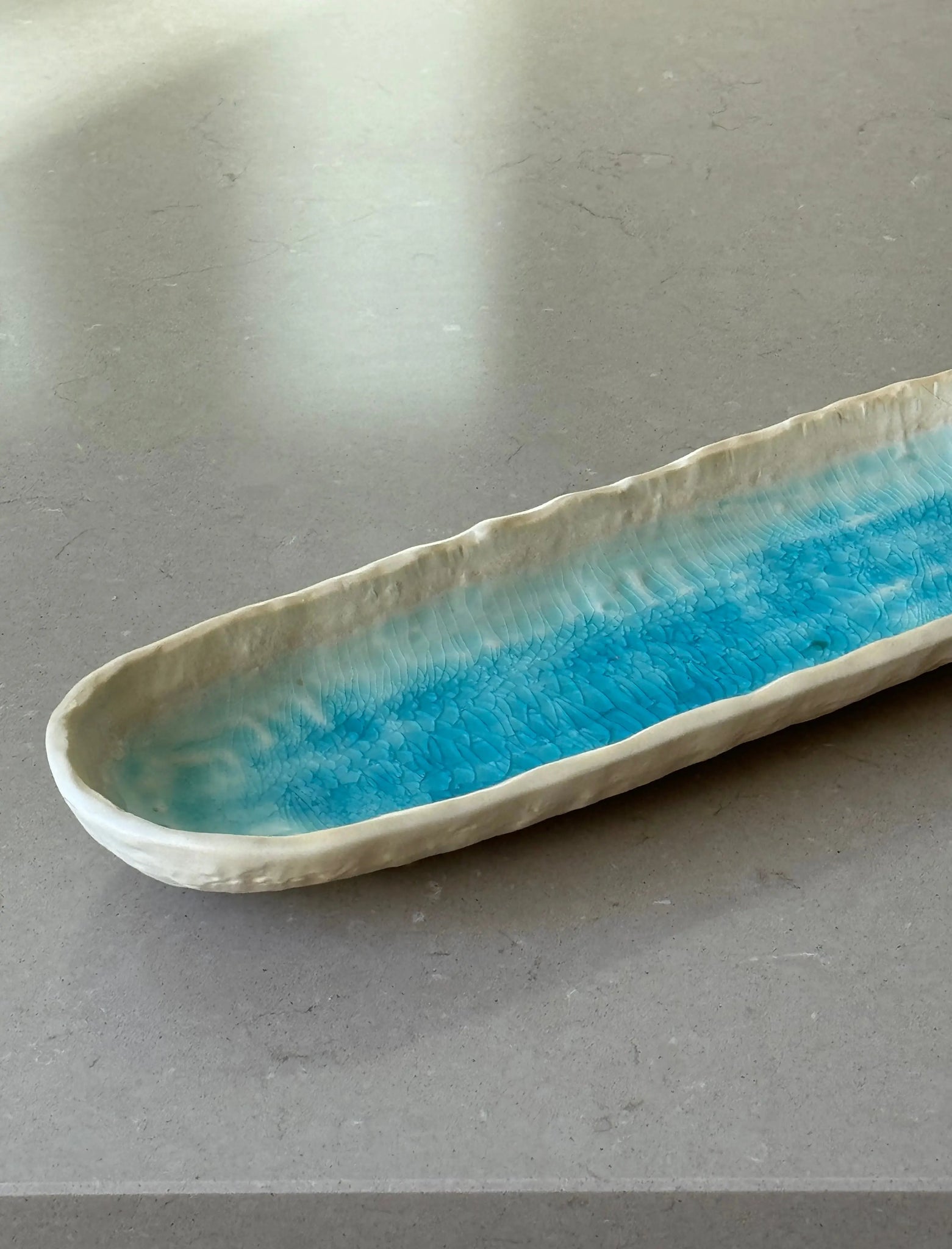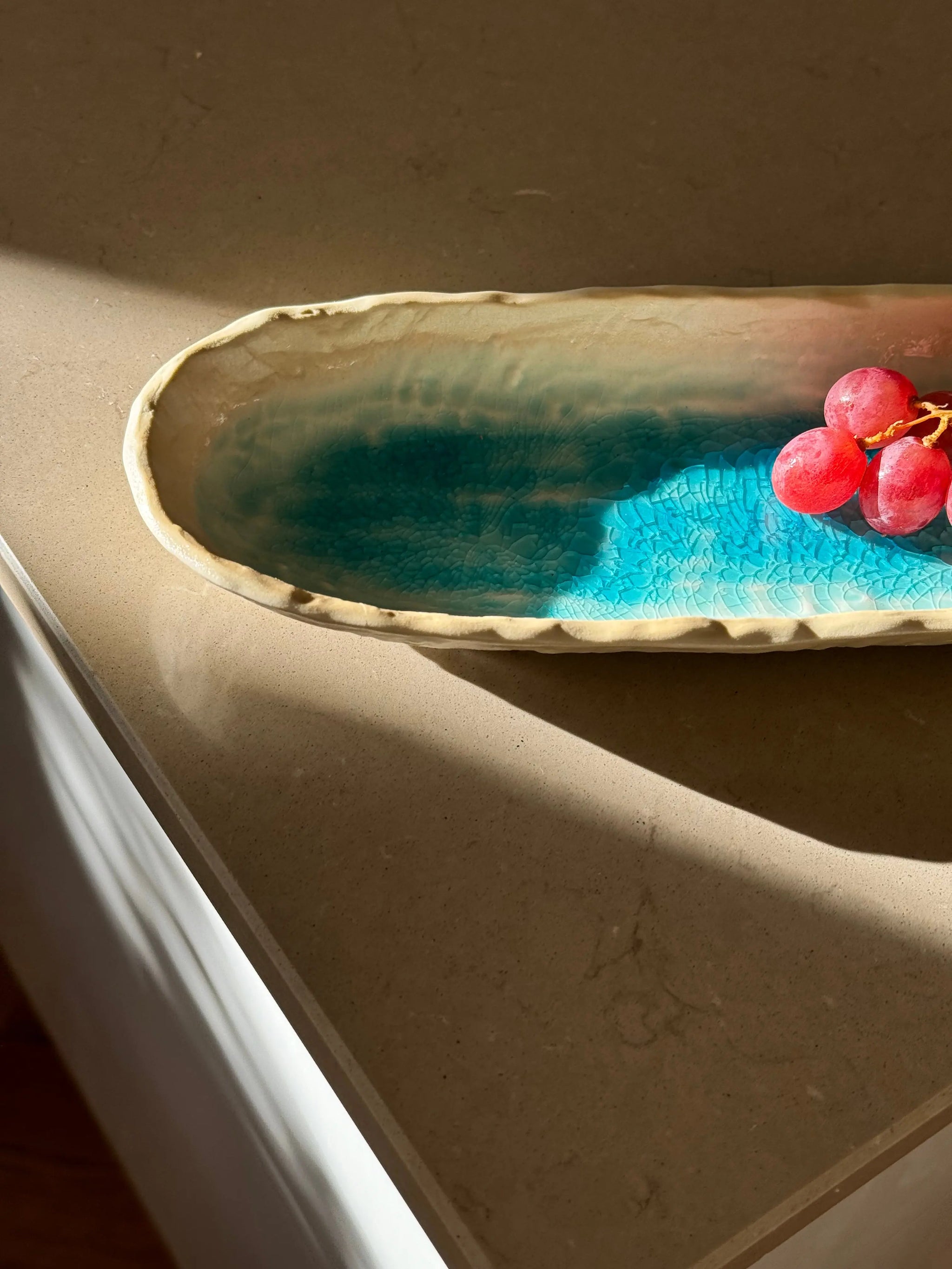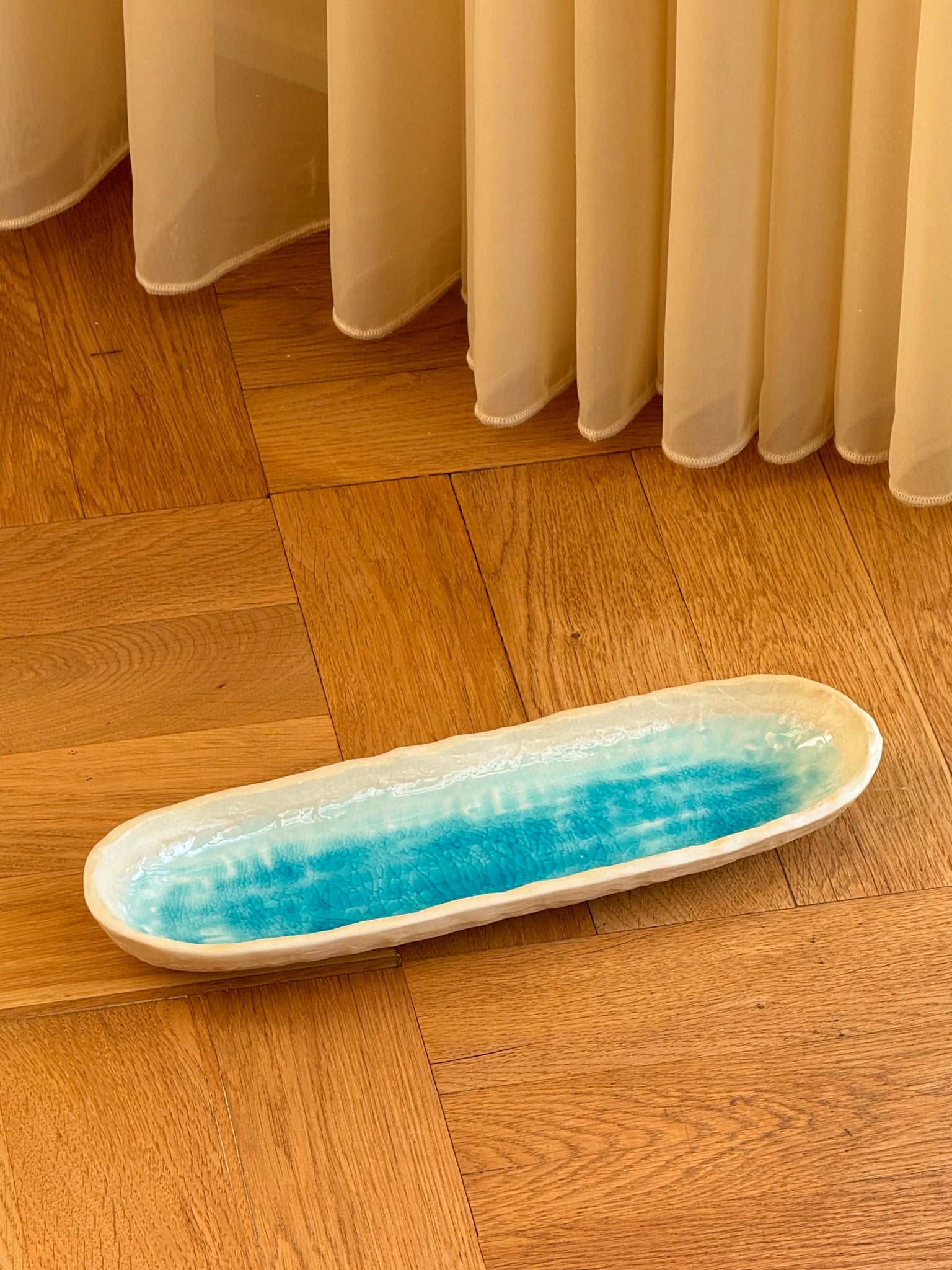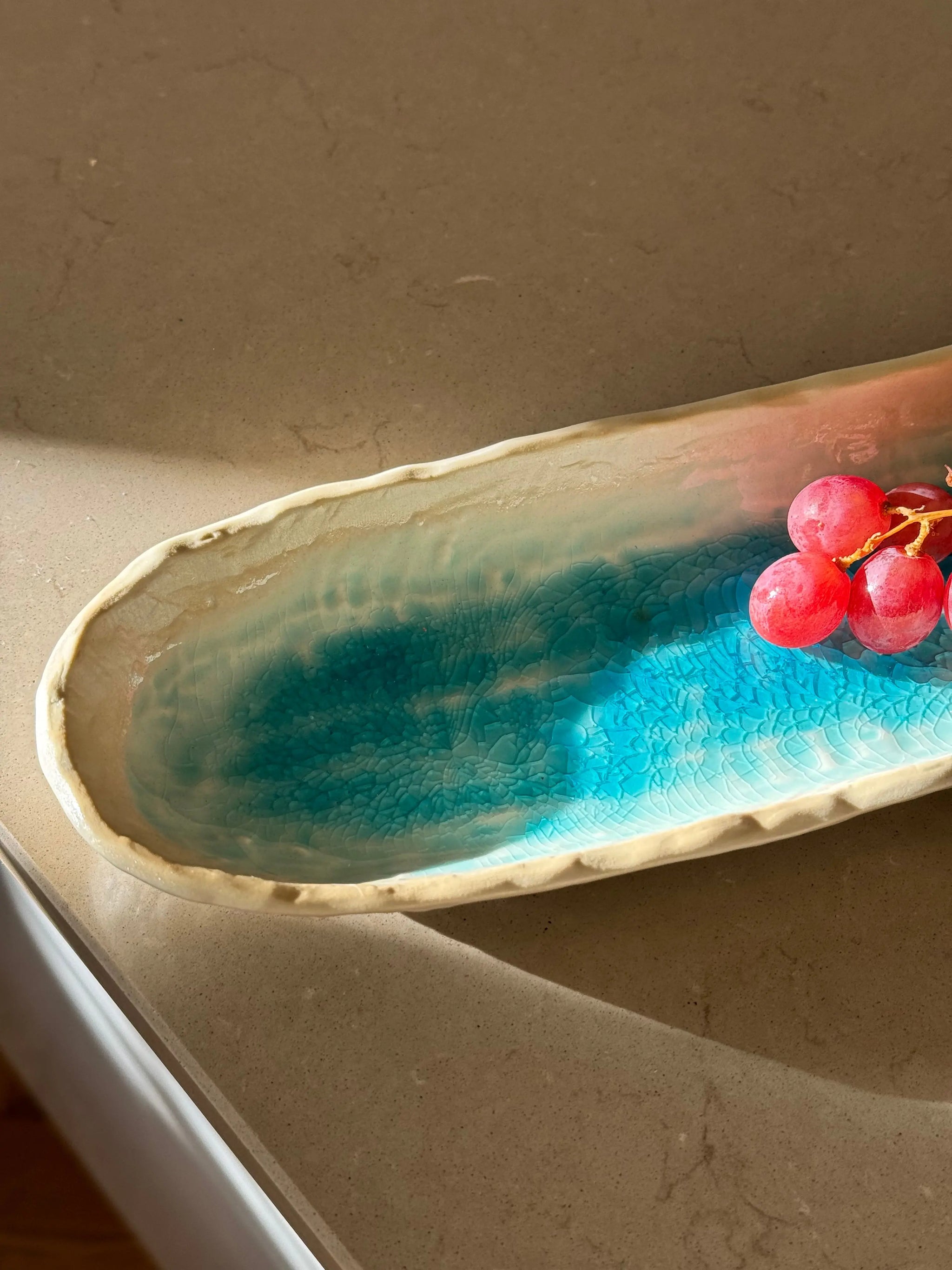 Aflangt ovalt fad/tallerken fra Japan i turkis og sand keramik