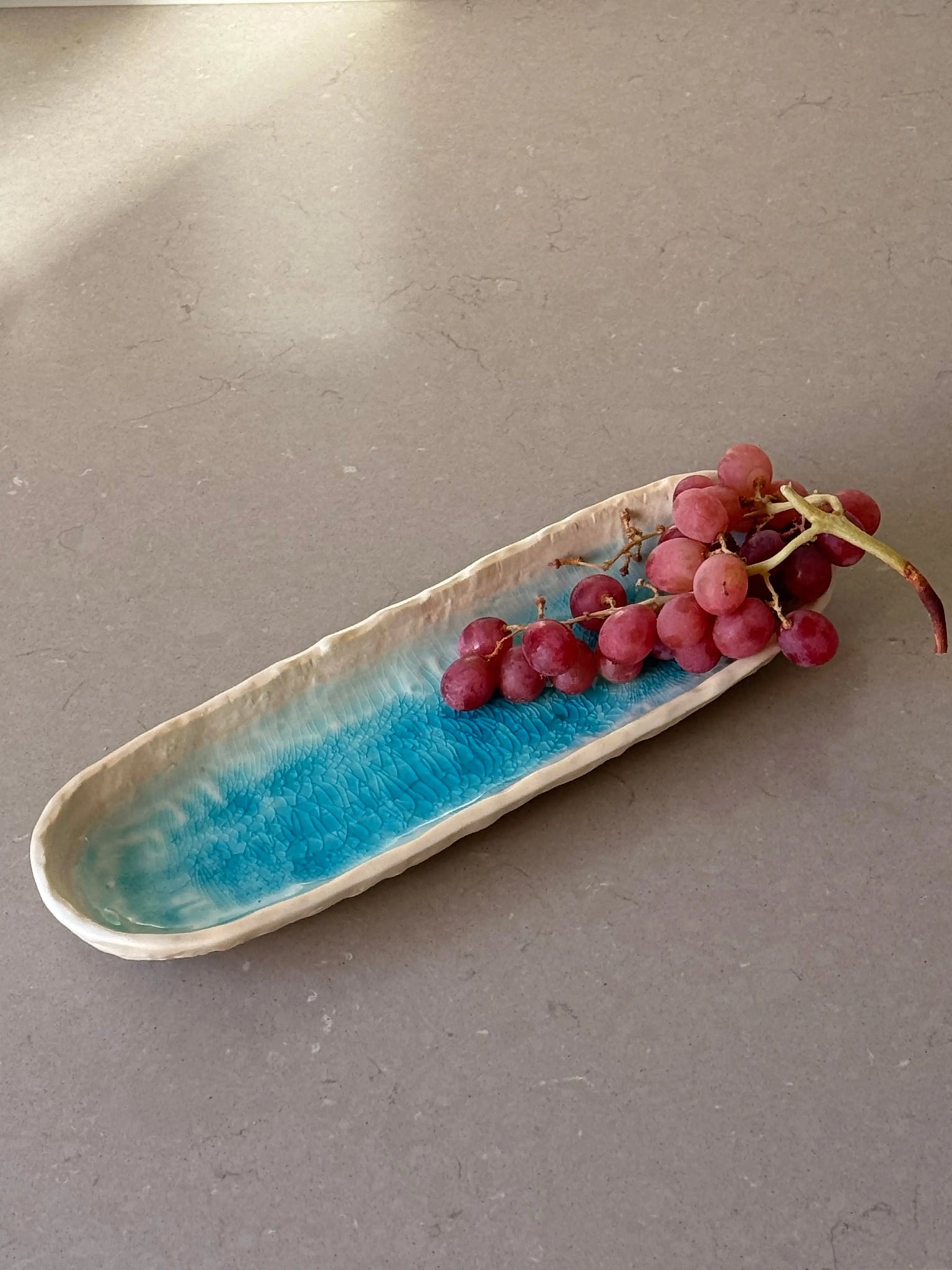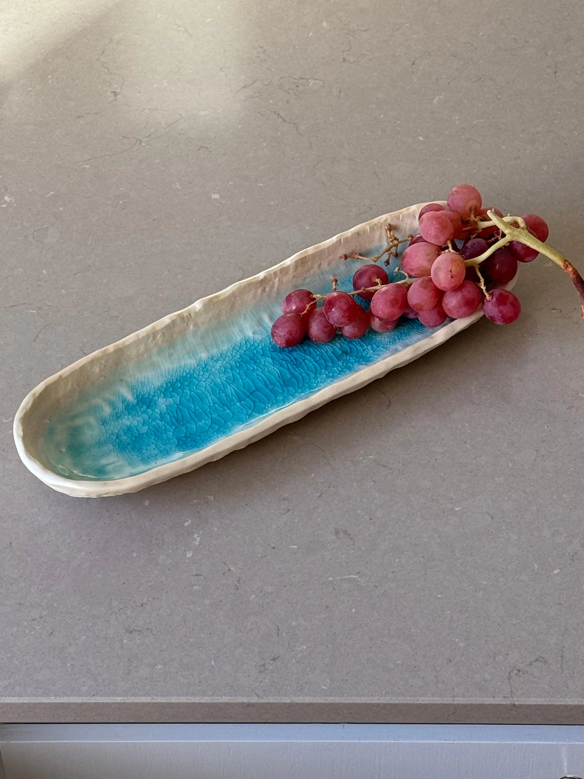 Dette elegante, håndlavede fad fra Japan kombinerer traditionelt japansk håndværk med et moderne udtryk. Fadet har en smuk turkis glasering på indersiden, der minder om farven på havet, mens den ydre sandfarvede finish tilføjer en naturlig og autentisk stil. Med målene L30.5 x B10 x H3 cm er fadet perfekt til servering af småretter, snacks, sushi eller friske salater.