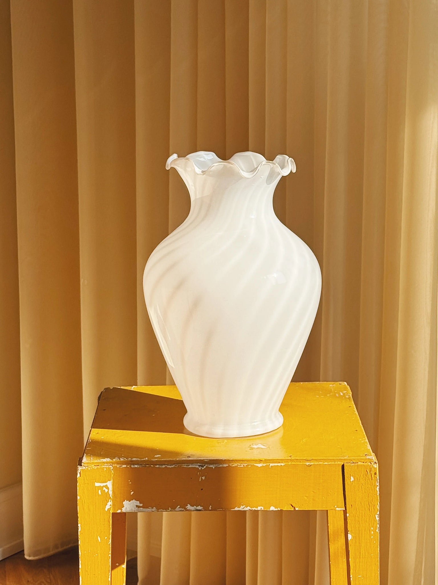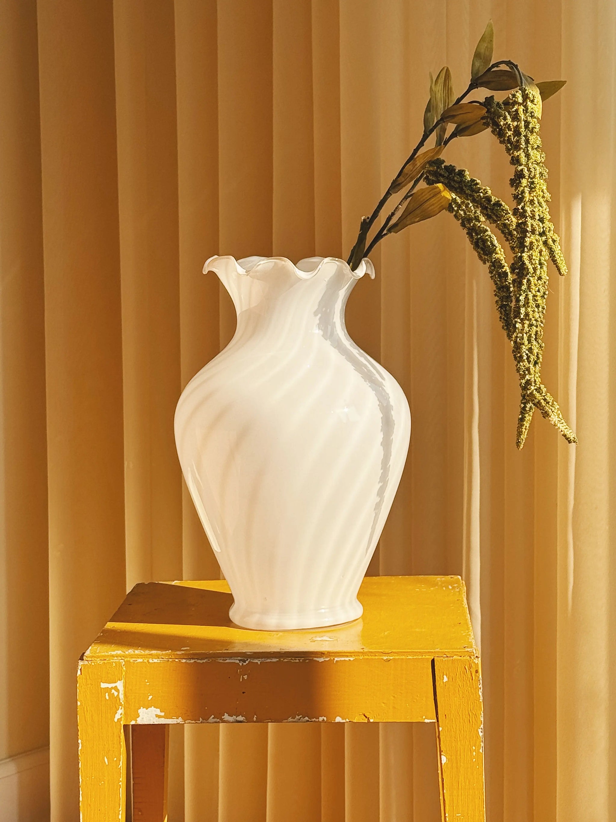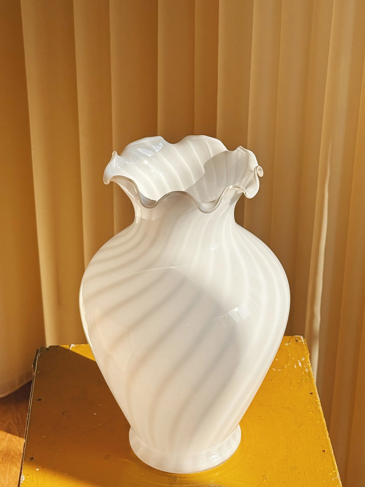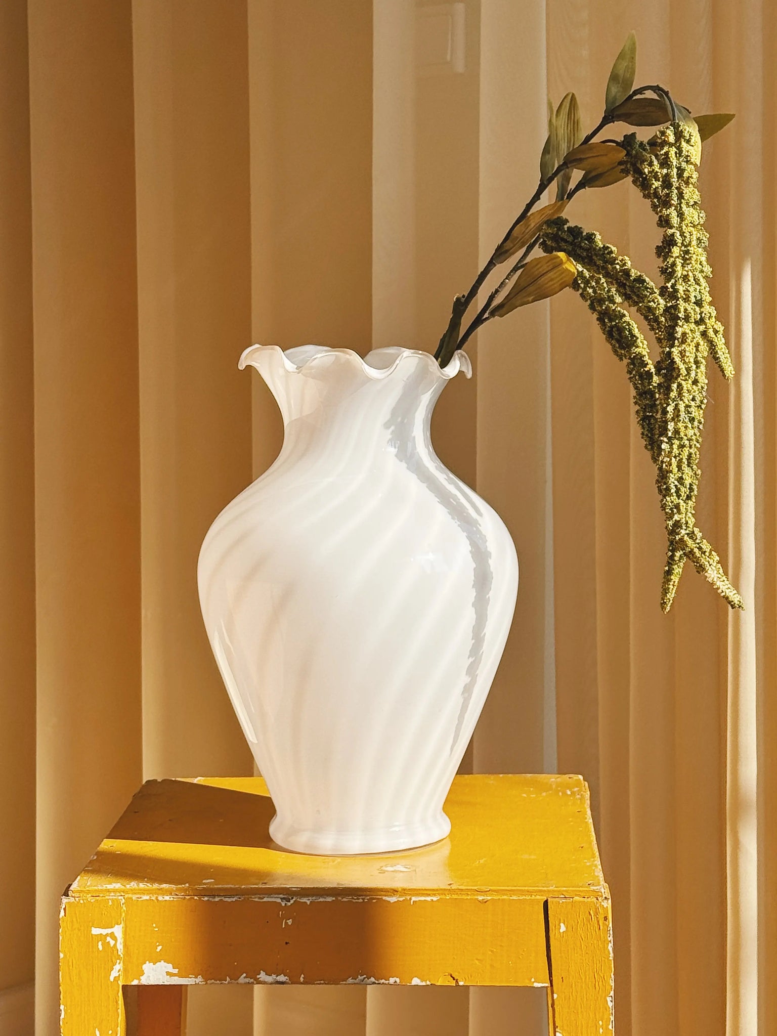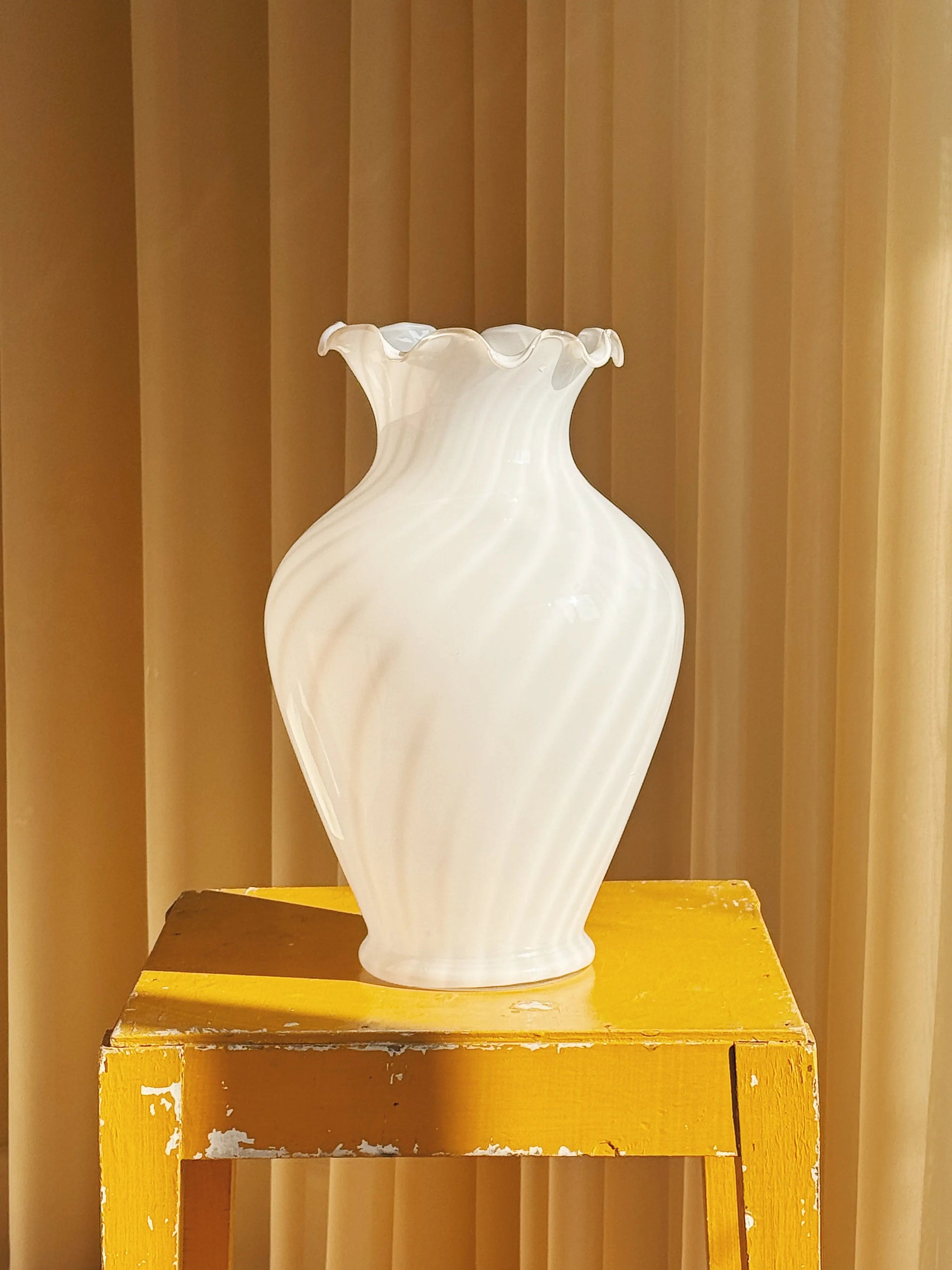 Smuk vintage Murano vase med swirl i hvid opal glas, håndlavet i Italien i 1970'erne. Vasen har den perfekte størrelse til at fremhæve en smuk buket blomster og tilføje et elegant touch til dit hjem. Den er i rigtig god stand og et unikt fund.