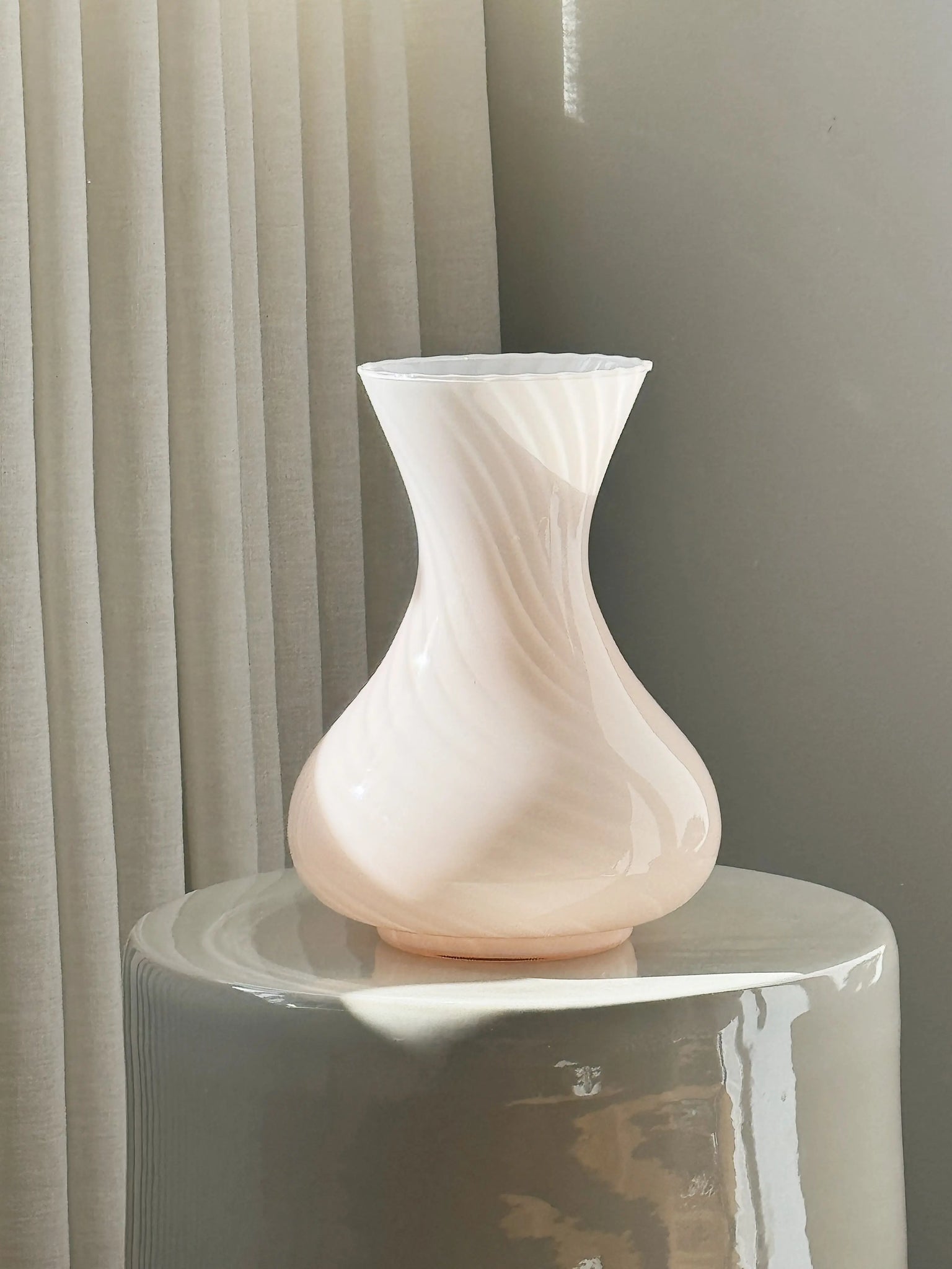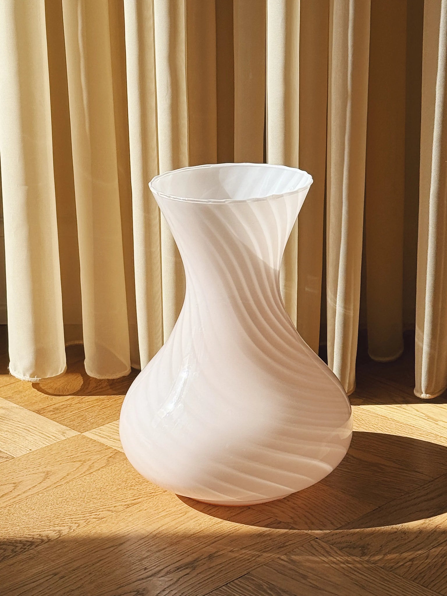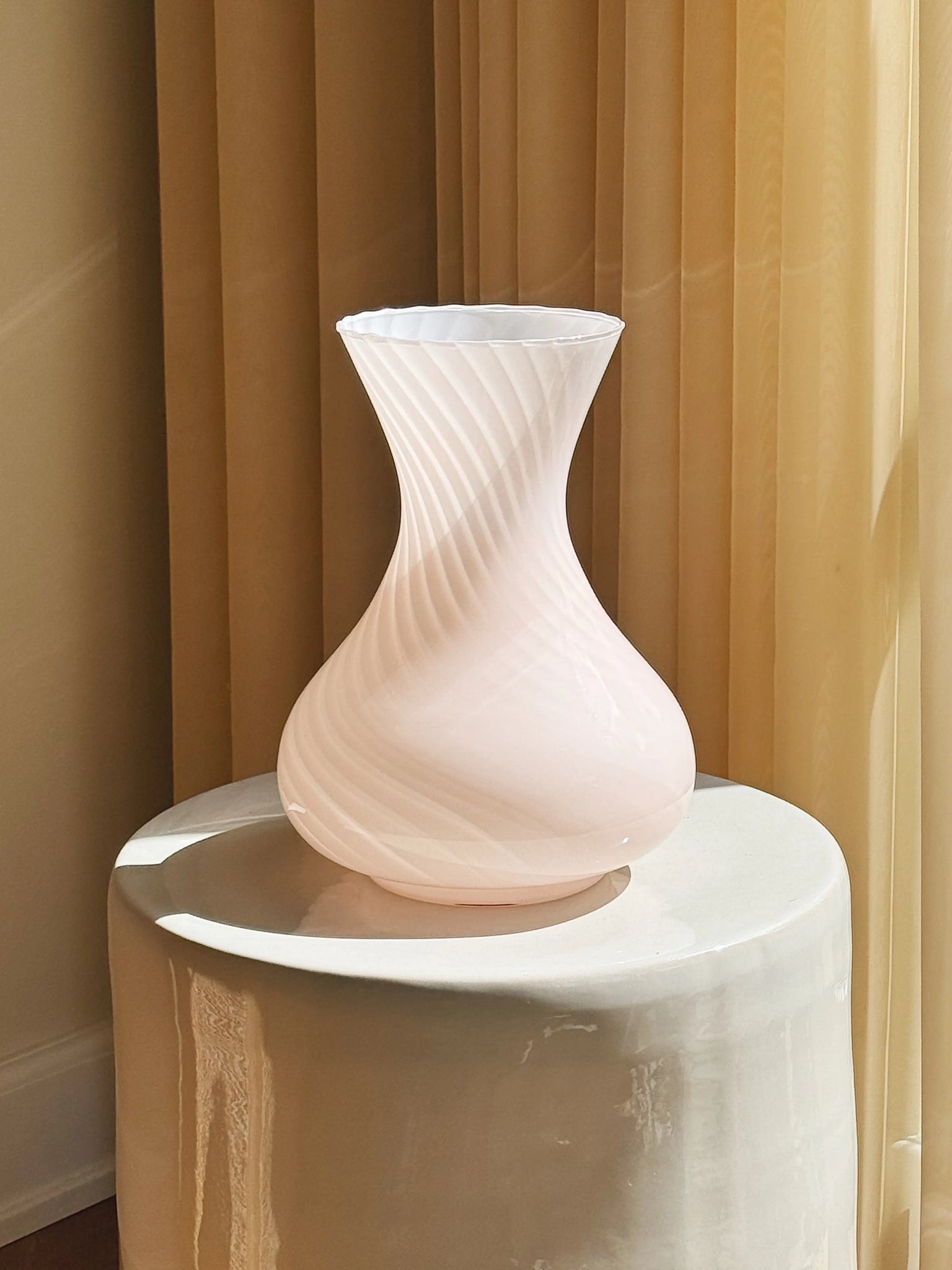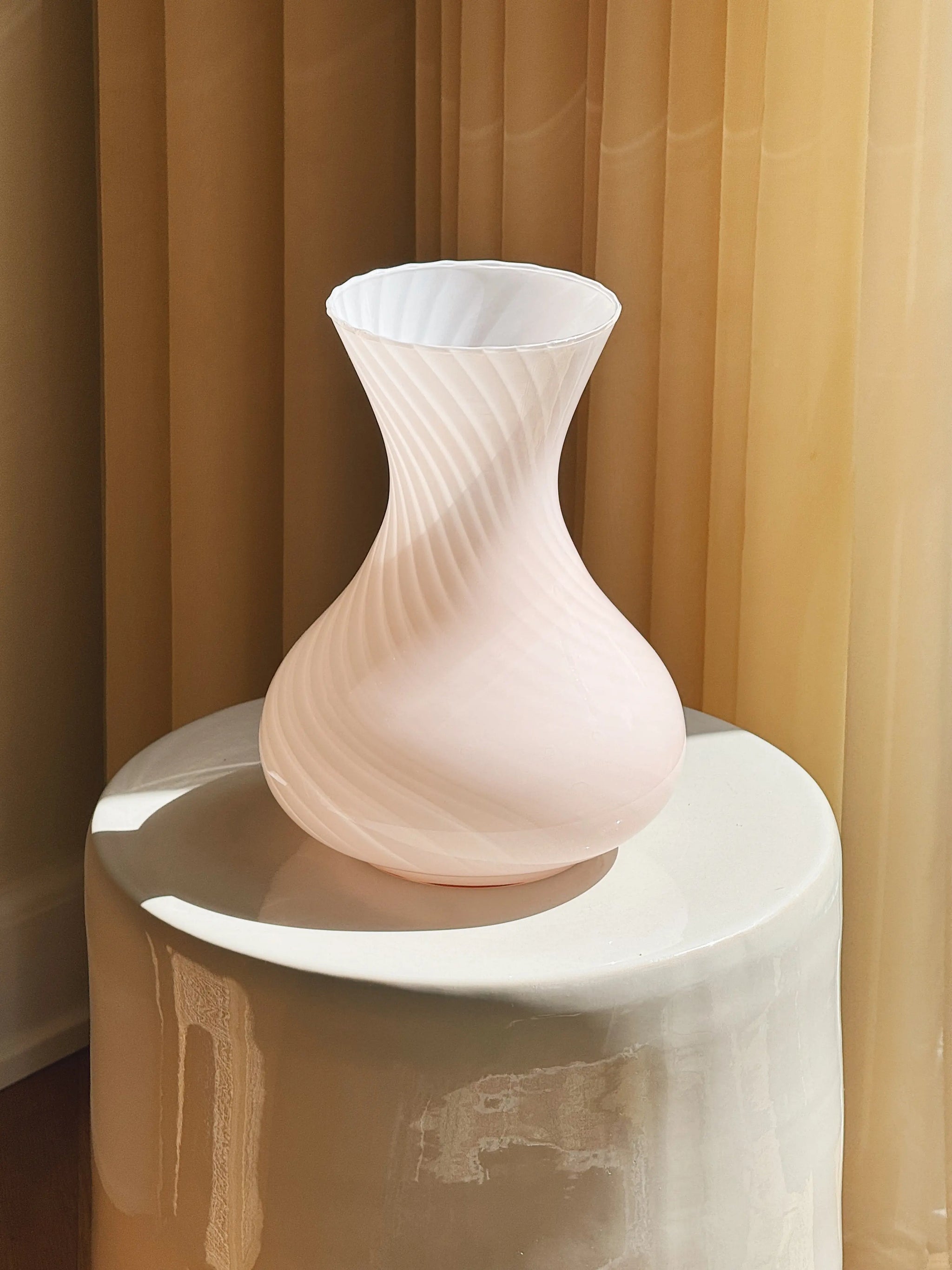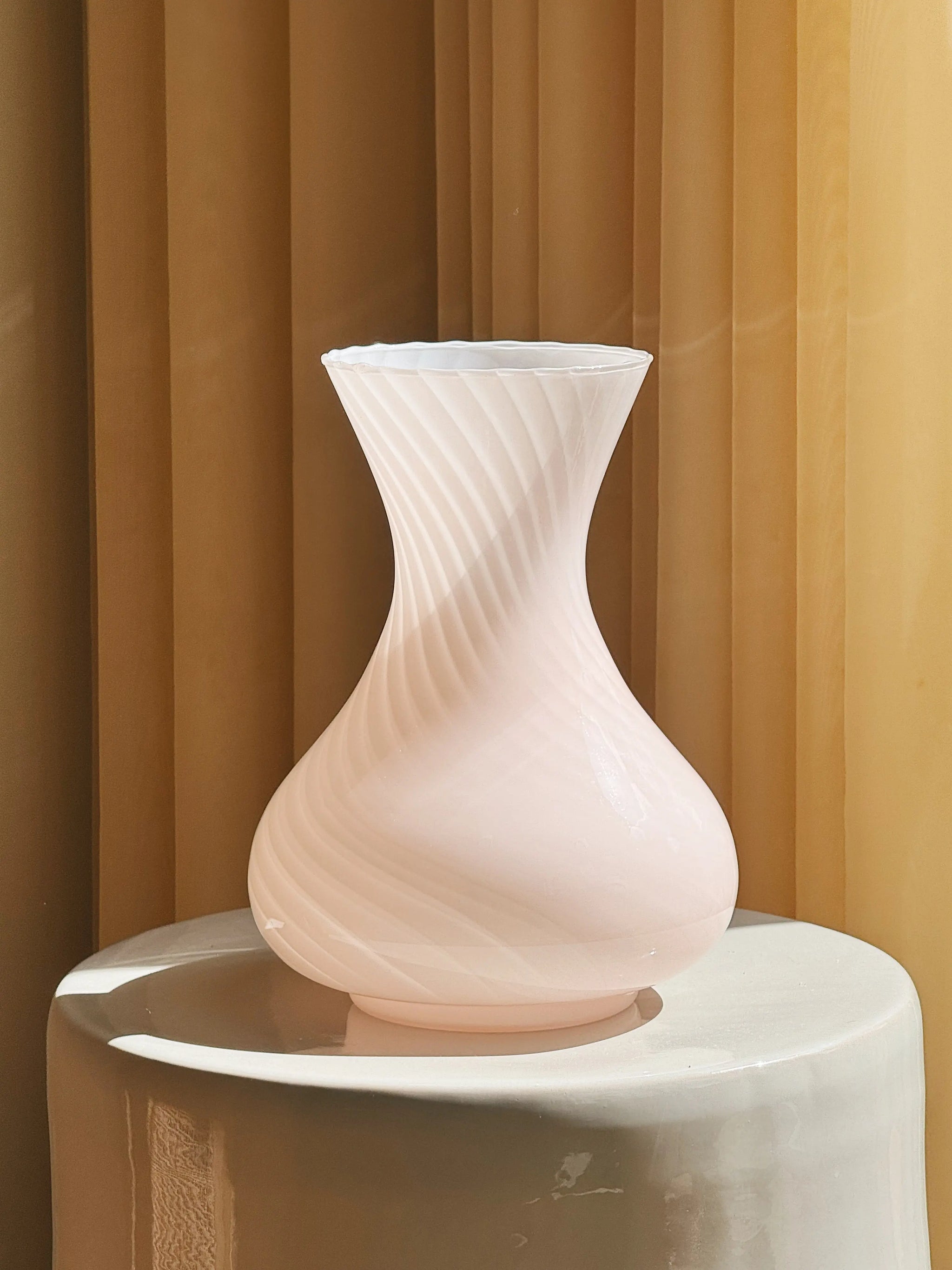 Smuk vintage Murano-vase i mundblæst glas med en blid, lys pink farvetone og et elegant spiralformet swirl-mønster, der slynger sig i glasset. Den organiske form og den let matte overflade giver vasen et sofistikeret, skulpturelt udtryk, der gør den til et dekorativt statement – uanset om den står alene eller med blomster.