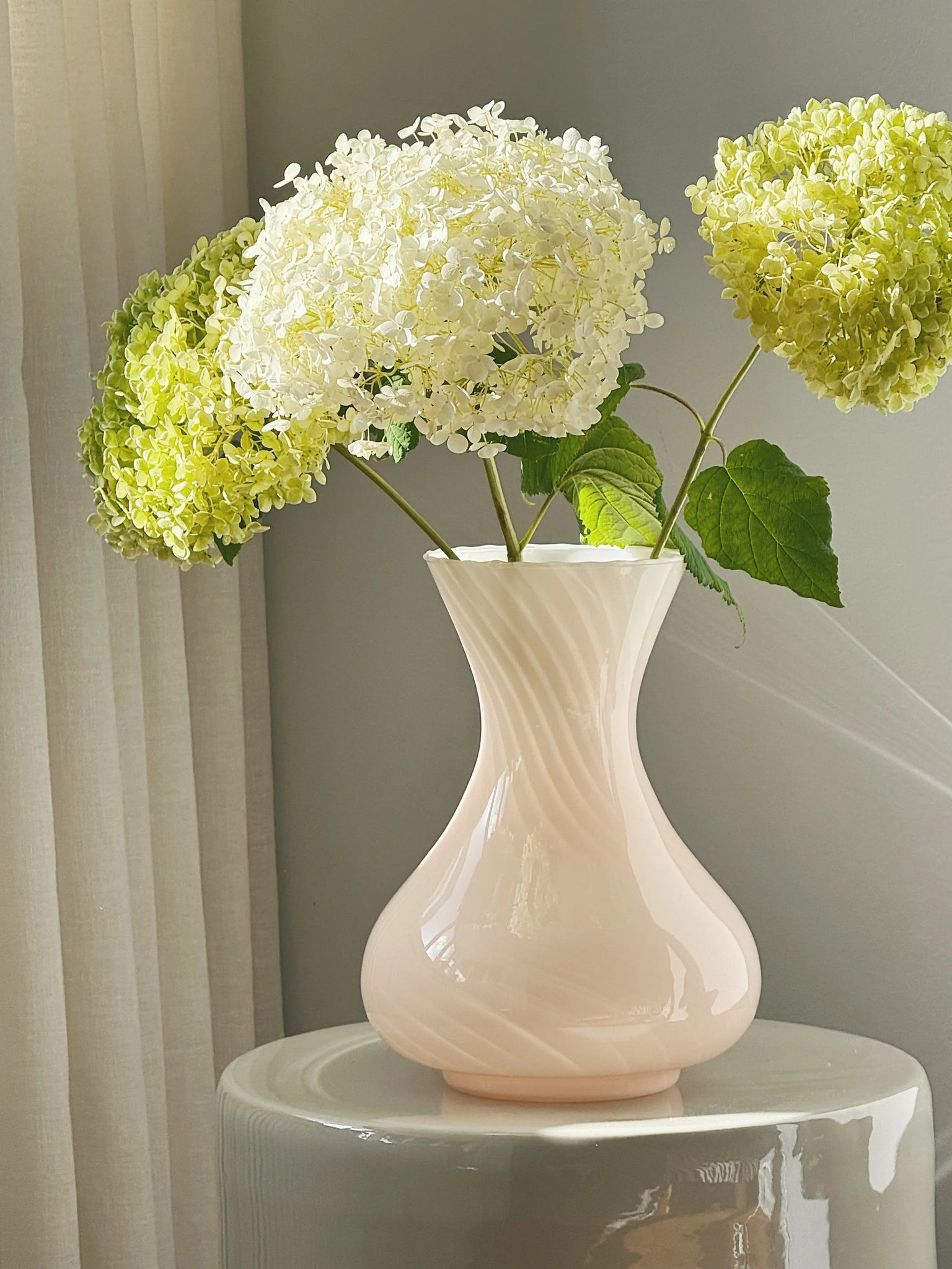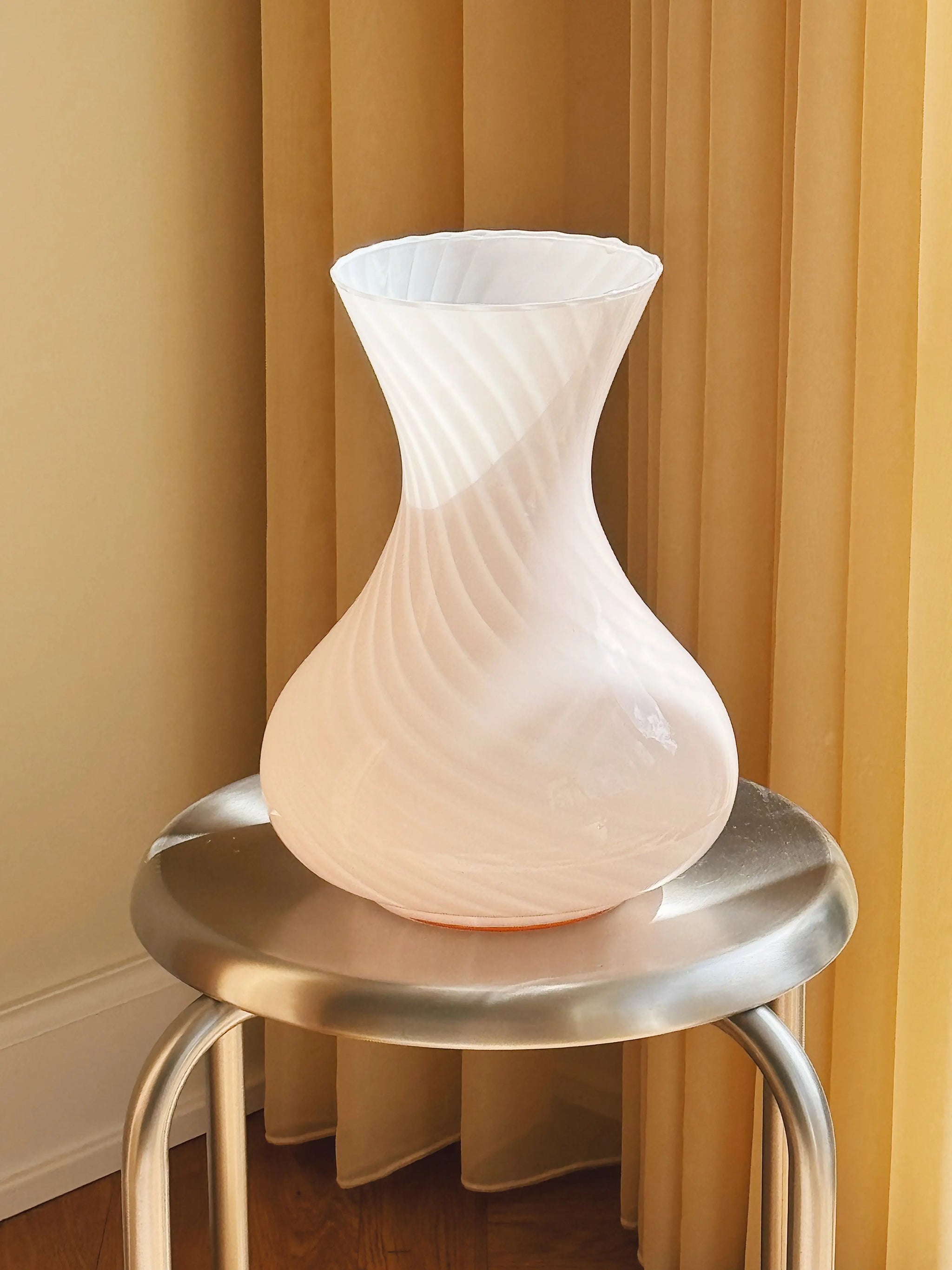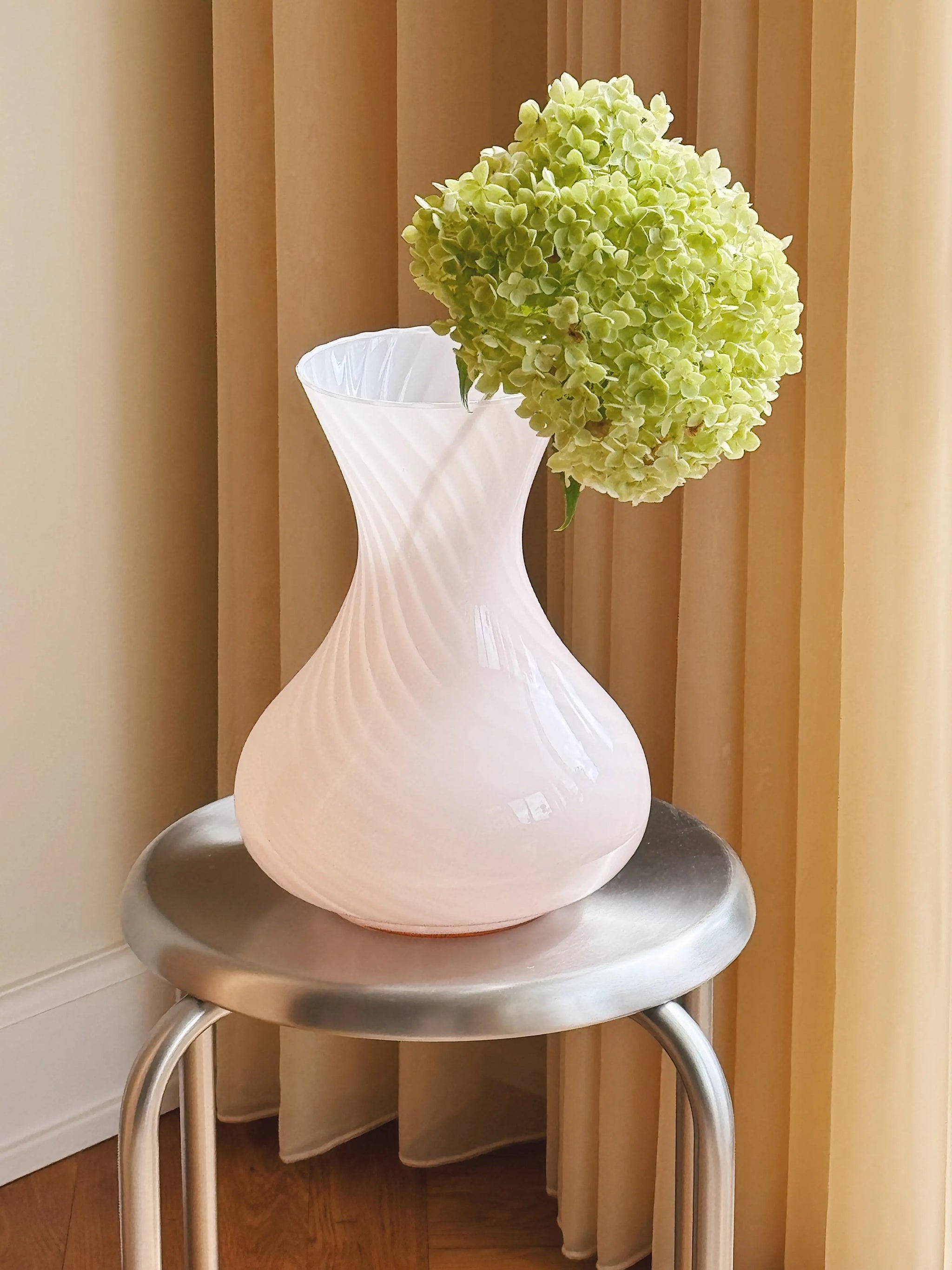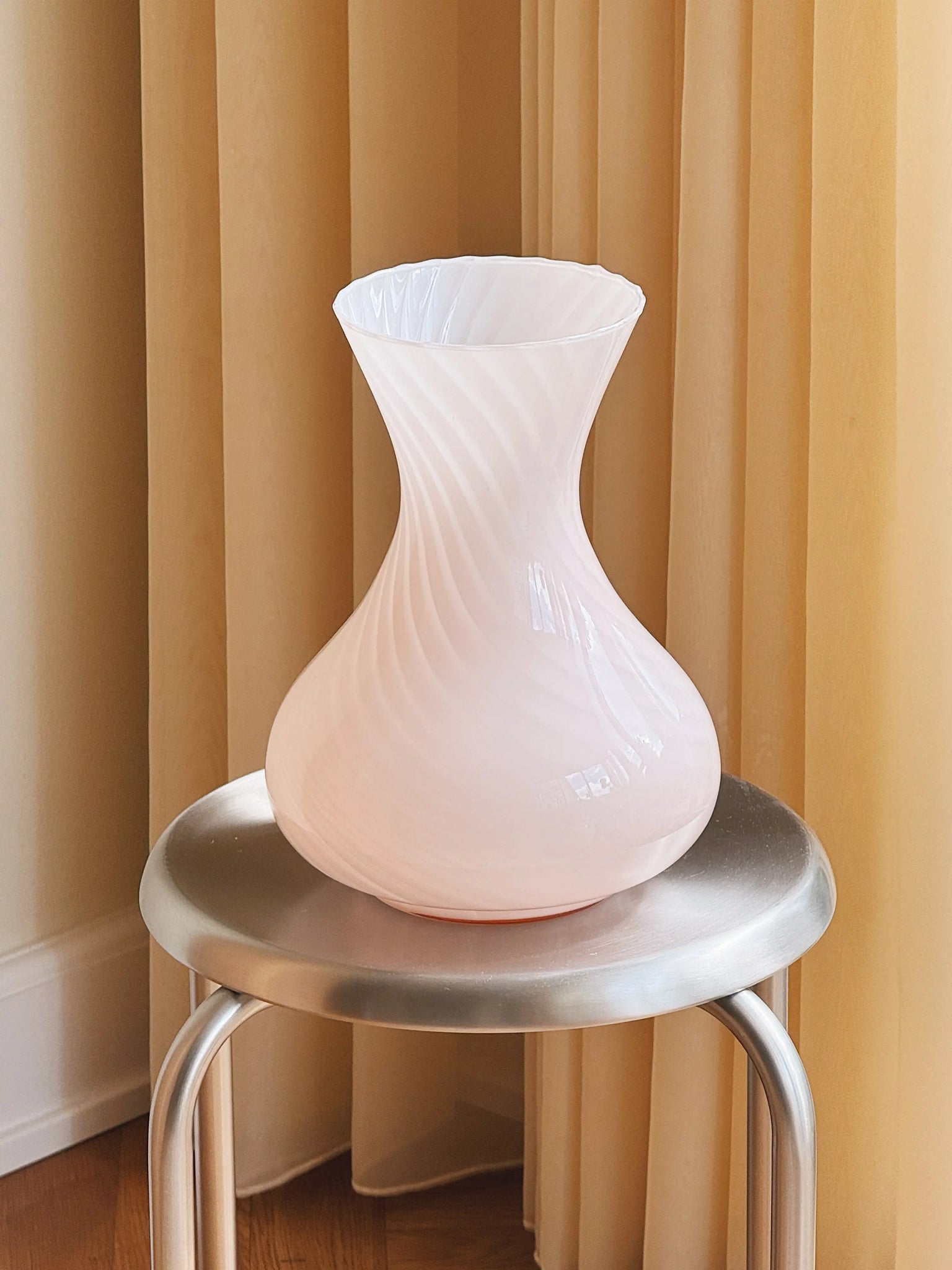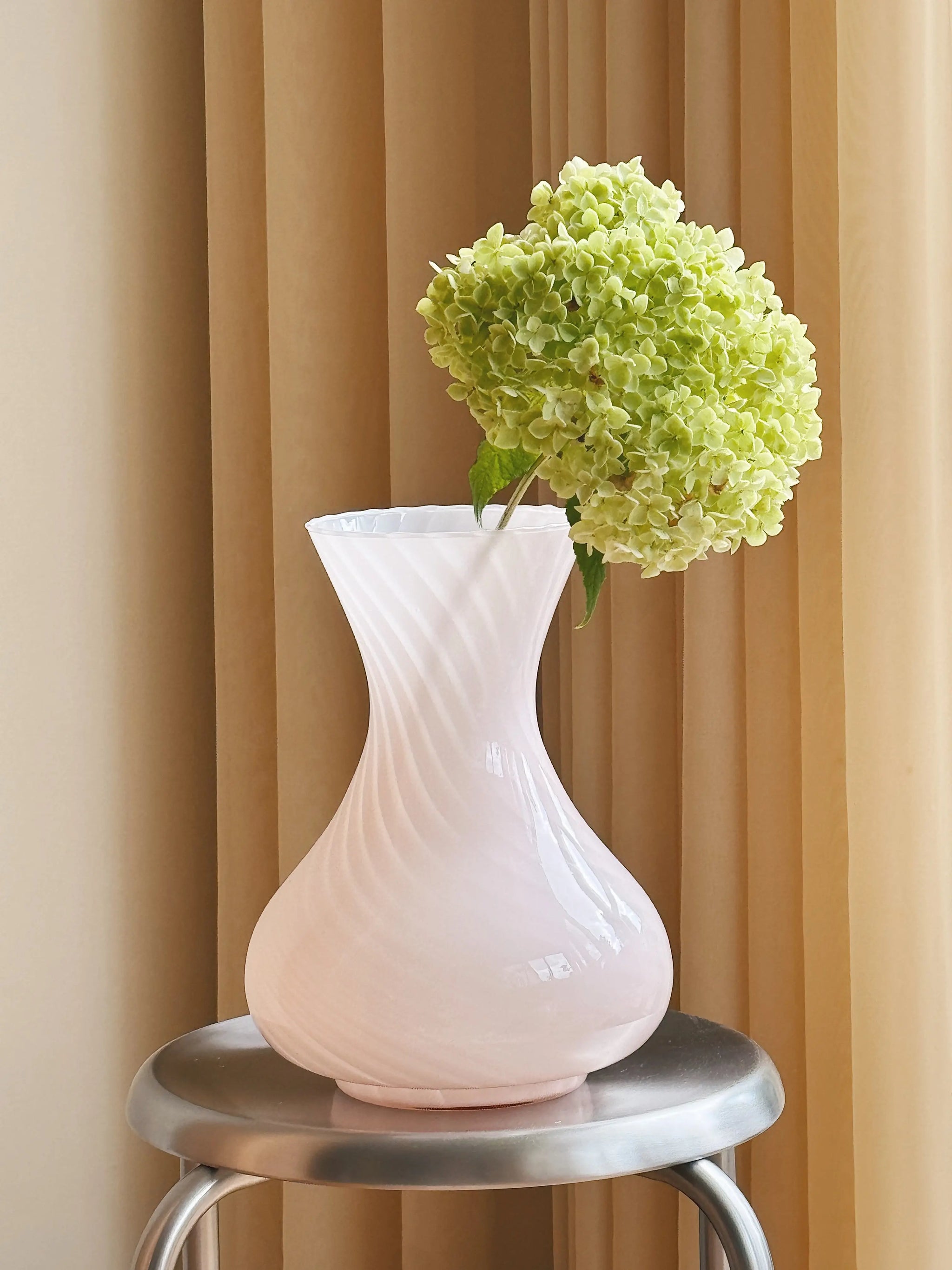 Smuk vintage Murano-vase i mundblæst glas med en blid, lys pink farvetone og et elegant spiralformet swirl-mønster, der slynger sig i glasset. Den organiske form og den let matte overflade giver vasen et sofistikeret, skulpturelt udtryk, der gør den til et dekorativt statement – uanset om den står alene eller med blomster.