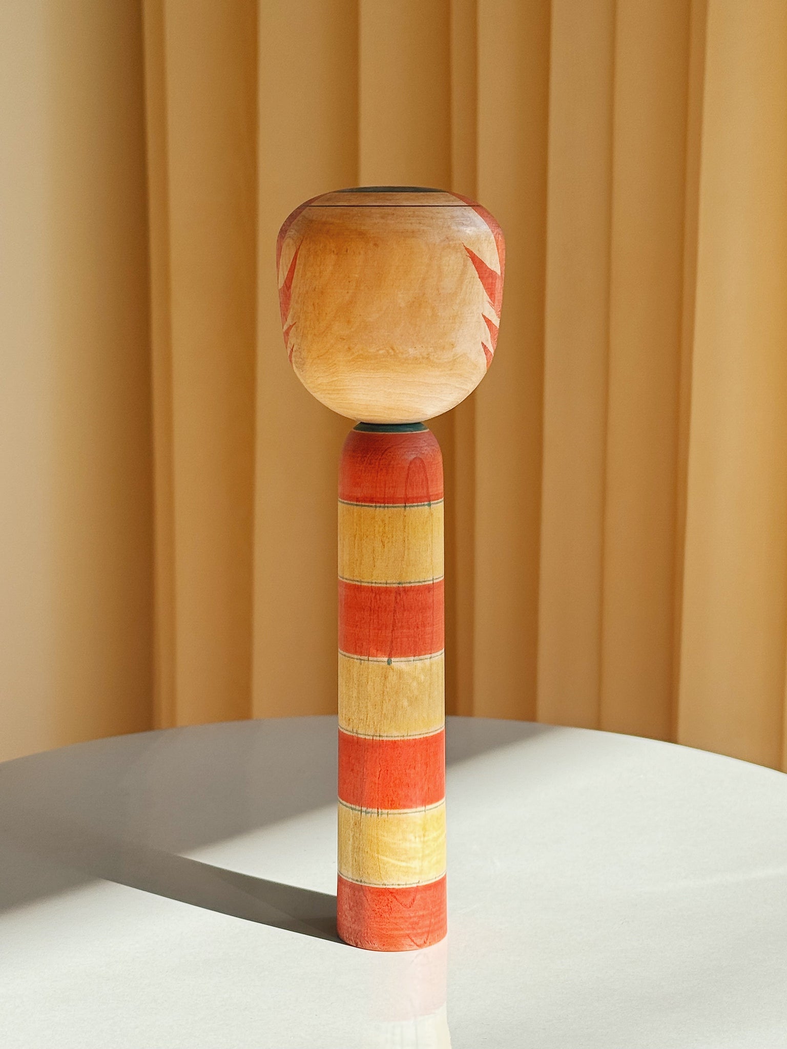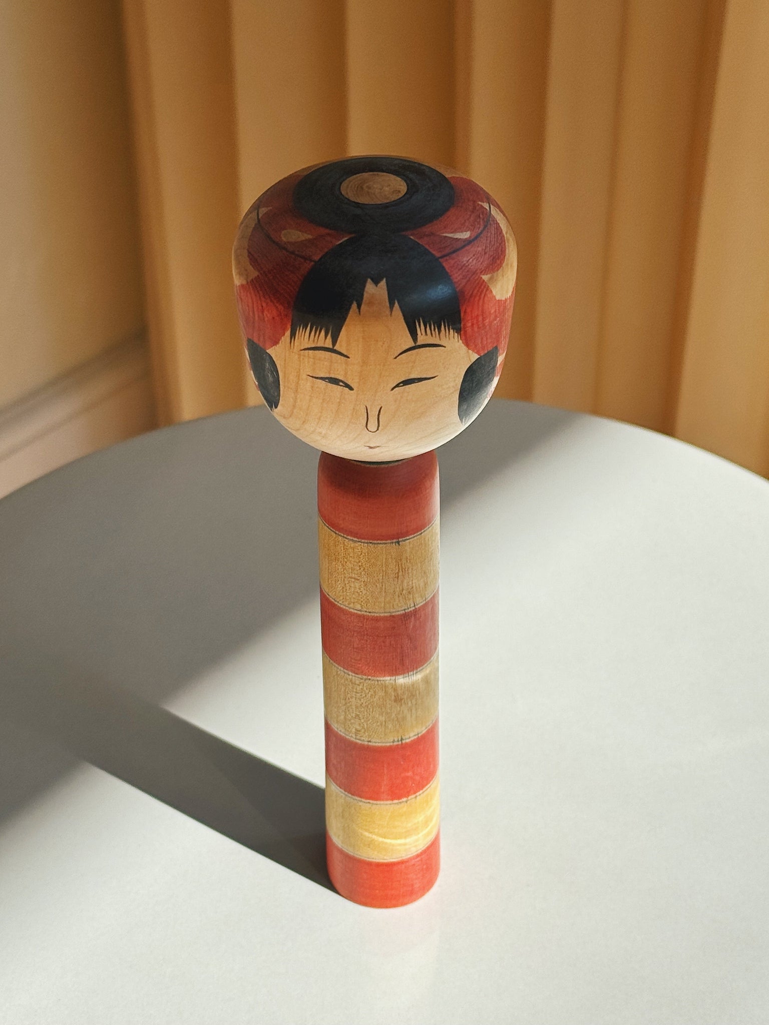 En enkel og stilfuld Kokeshi-dukke, der forener traditionelt formsprog med markant stribemønster – ideel både til samlere og som dekorativt indslag i hjemmet.