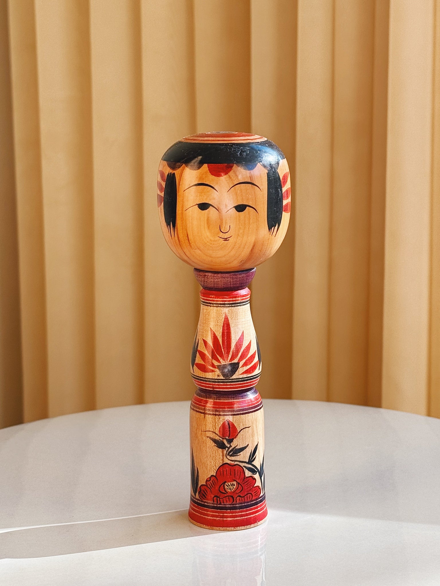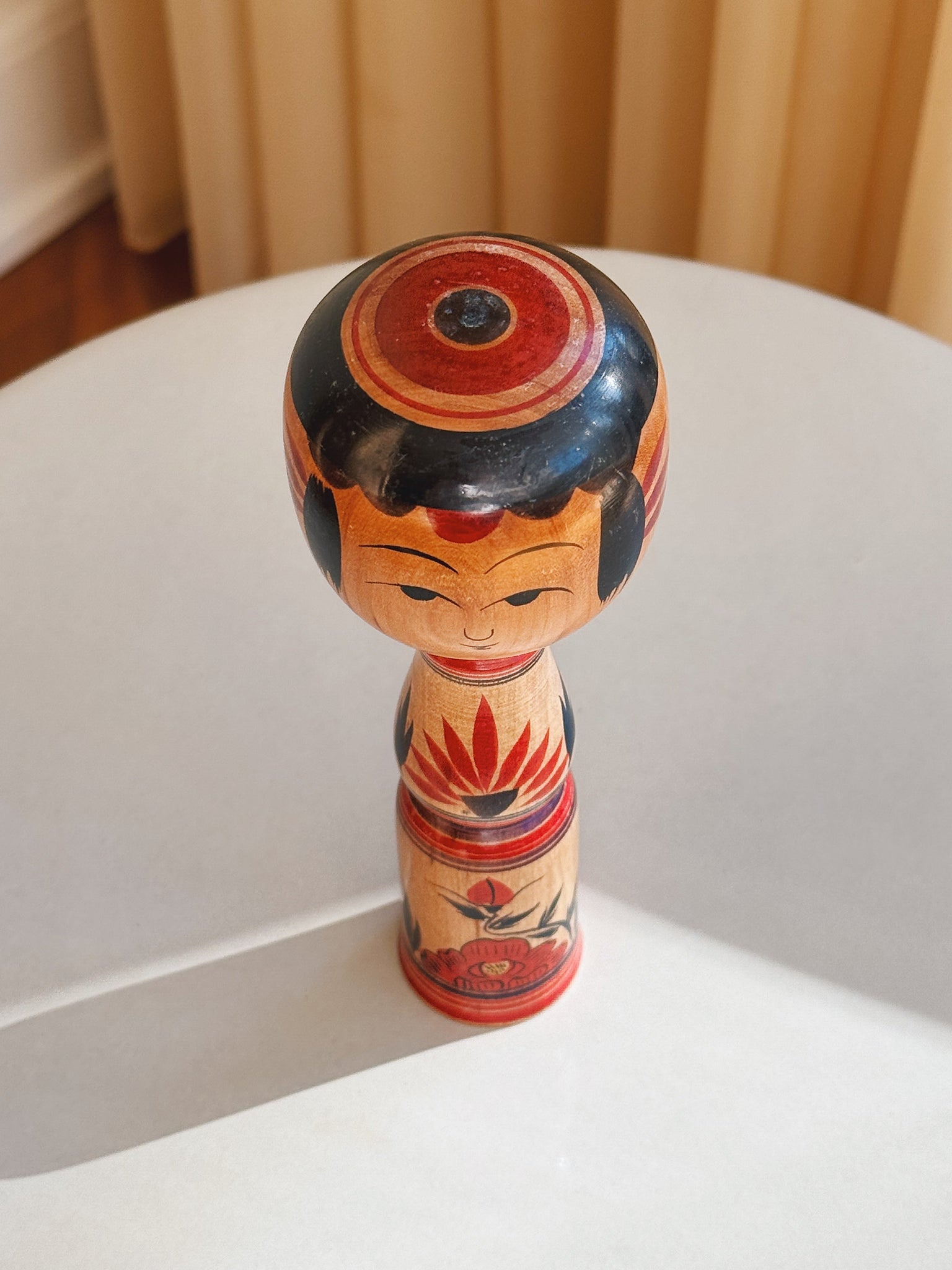 En yderst dekorativ vintage Kokeshi, der forener tradition og kunstnerisk udtryk, og som vil være et attraktivt indslag både for samlere og som dekorativ figur i hjemmet.