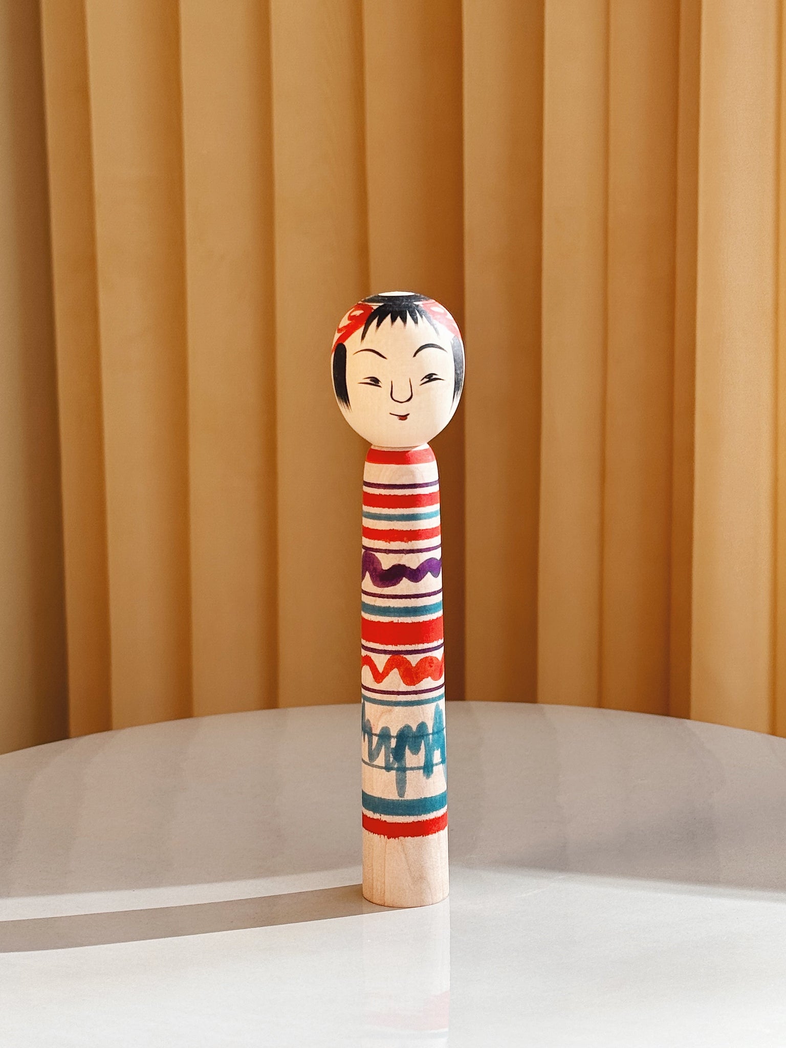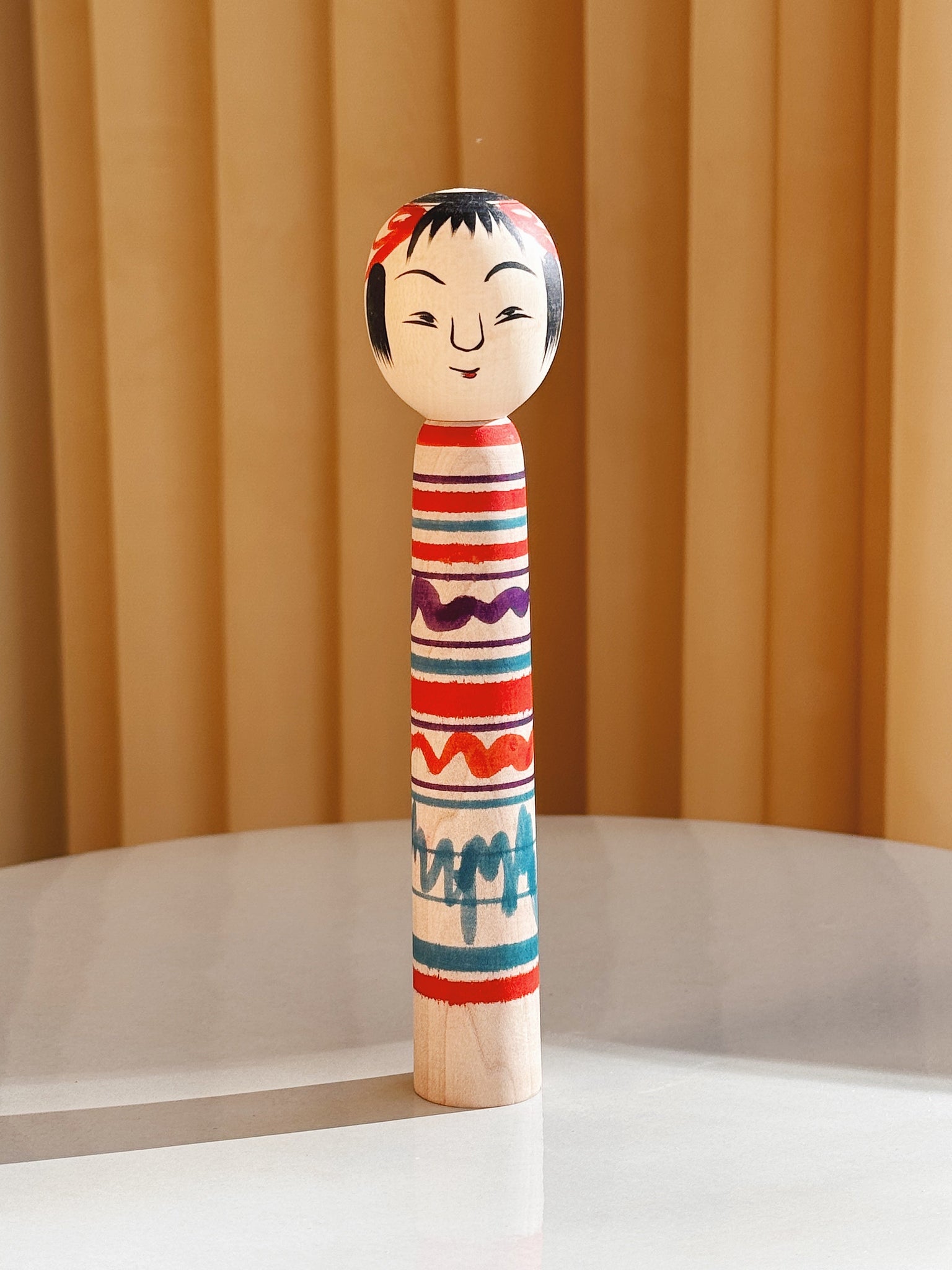 En charmerende og farverig Kokeshi, der kombinerer traditionel enkelhed med et legende mønster.