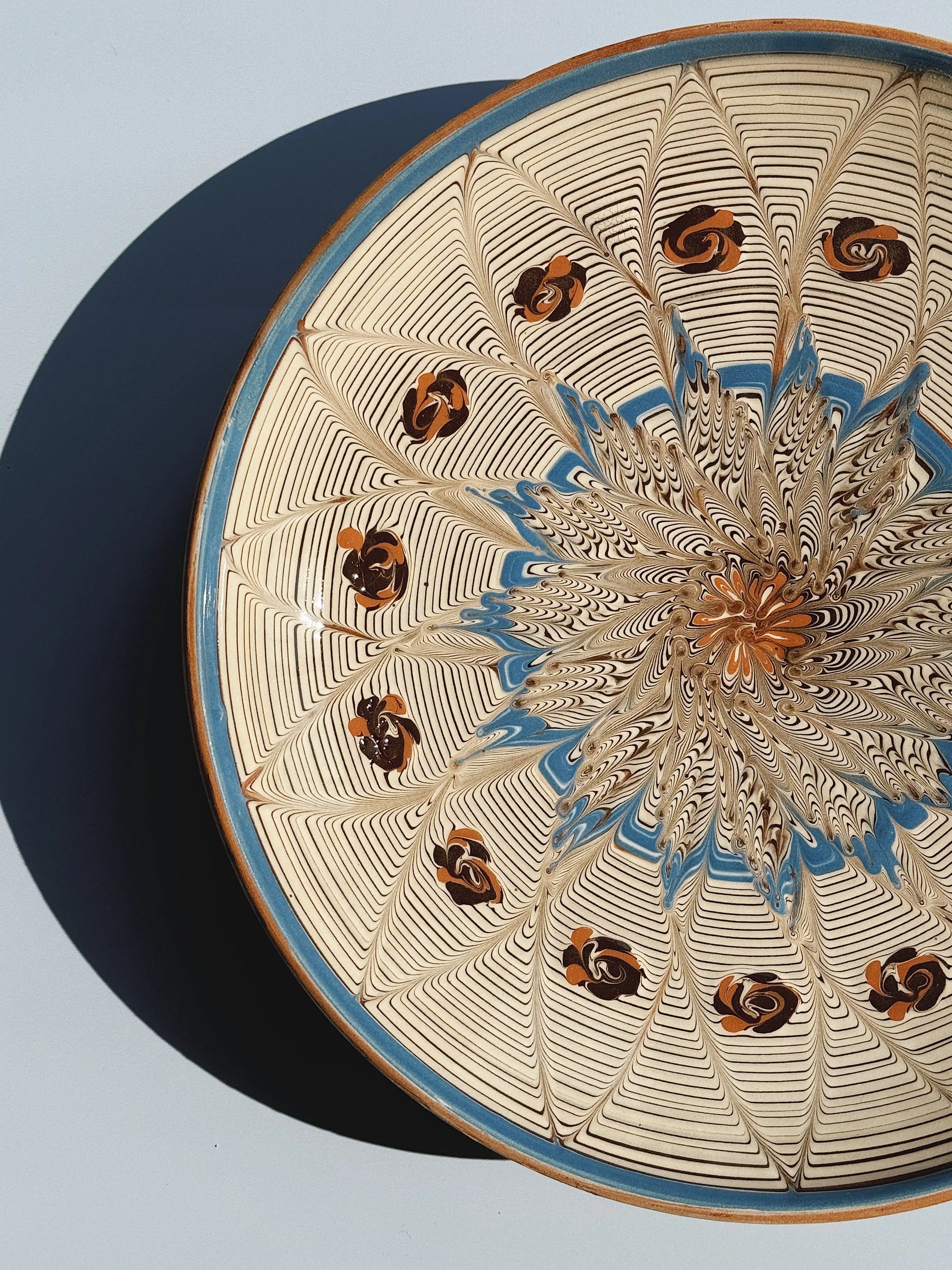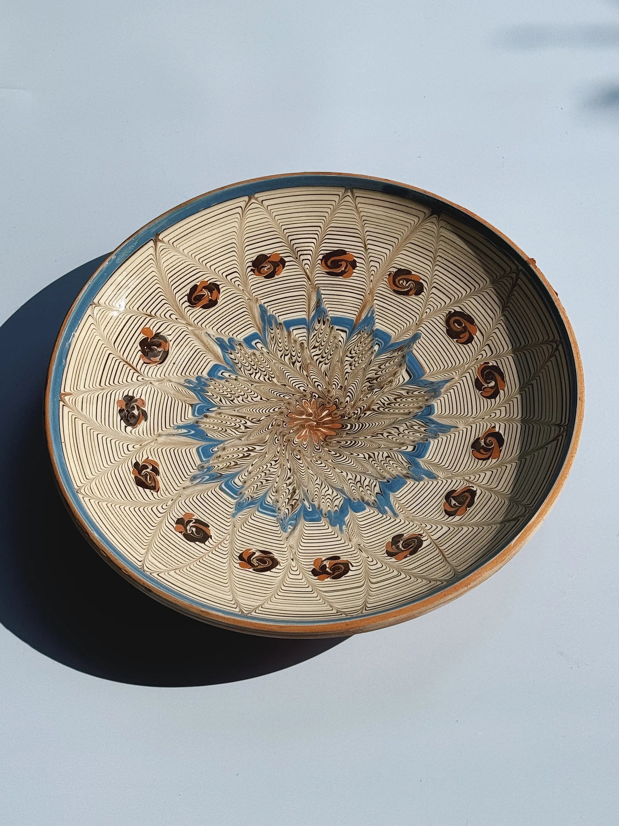 Bemærk: Hver tallerken er et unikt stykke kunsthåndværk – formet, malet og glaseret i hånden efter traditionelle metoder. Det betyder, at variationer i størrelse, farve og mønster er en del af charmen og ikke fejl. Mødet mellem ler og de mange lag farve kan skabe små sprækkelignende linjer i glasuren. Disse er naturlige og påvirker ikke funktionaliteten.