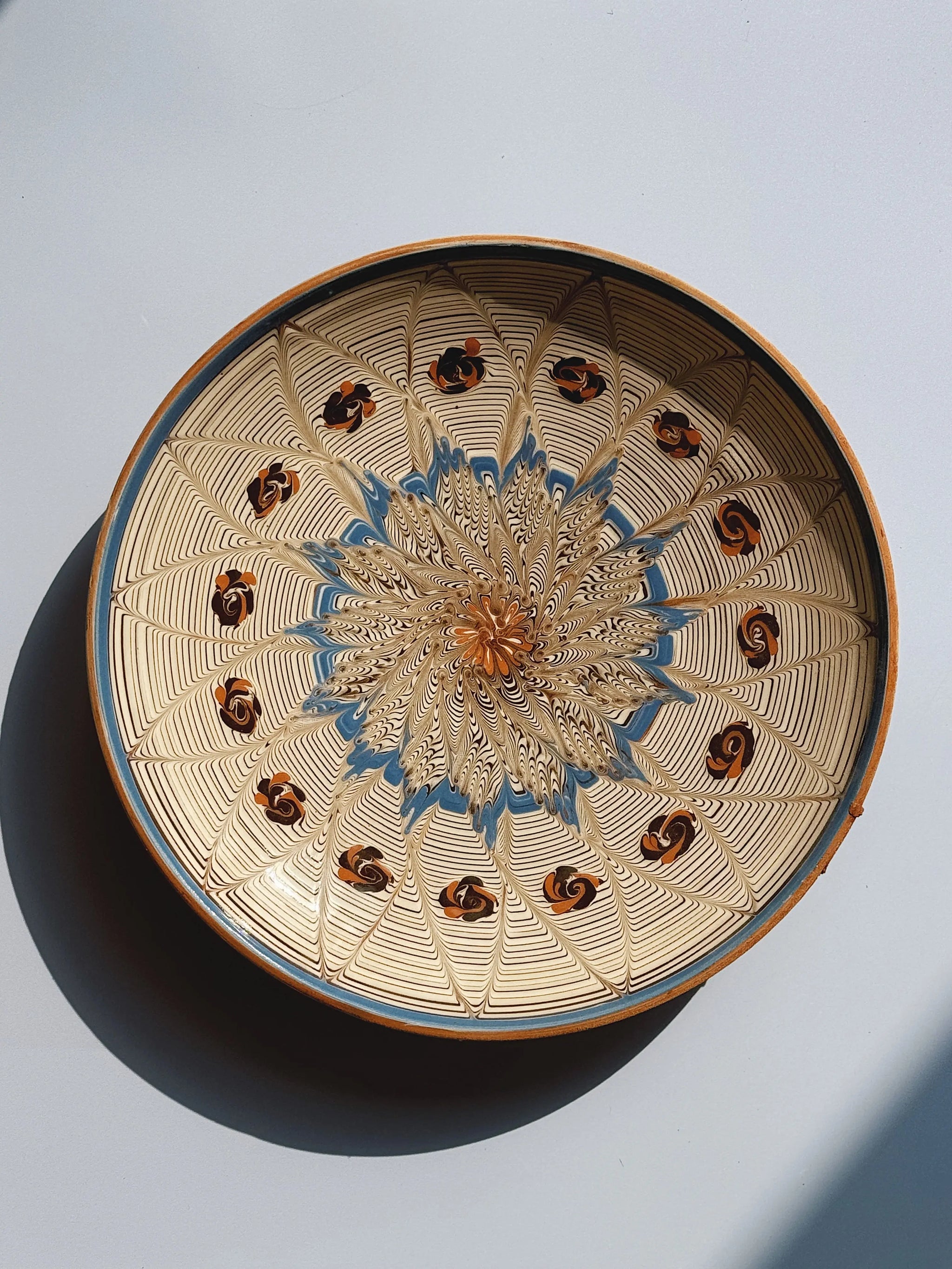 Smuk og dekorativ keramik tallerken/fad fra den rumænske by Horezu. Tallerkenen er skabt af dygtige lokale håndværkere og er omhyggeligt hånddrejet og håndmalet, hvilket giver den en unik karakter og skønhed. Ikke to tallerkener er helt ens, og teknikken er så enestående, at den er blevet optaget som en del af UNESCO’s verdensarv.