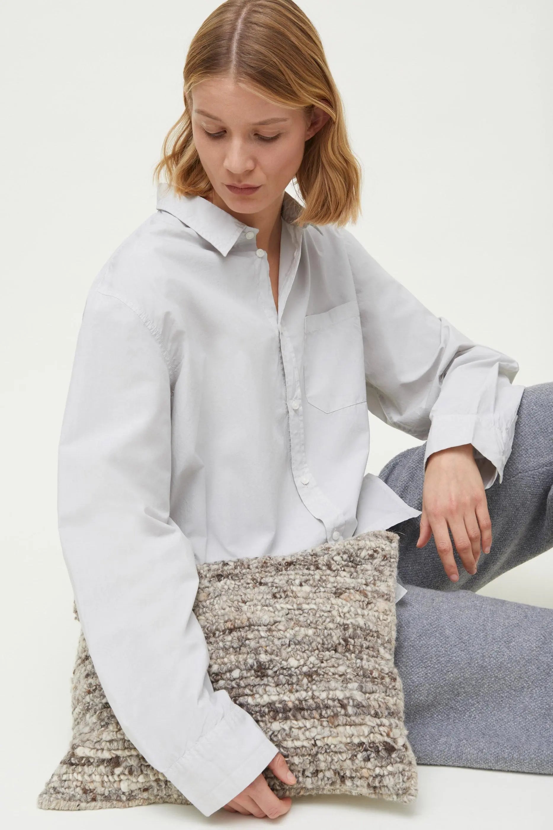 The Texture Nepal cushion closes with a discreet zipper hidden in overlapping fabric and features a hand-embroidered Aiayu logo on the back. This cushion is perfect for adding a sophisticated touch to your sofa, chair or bed
