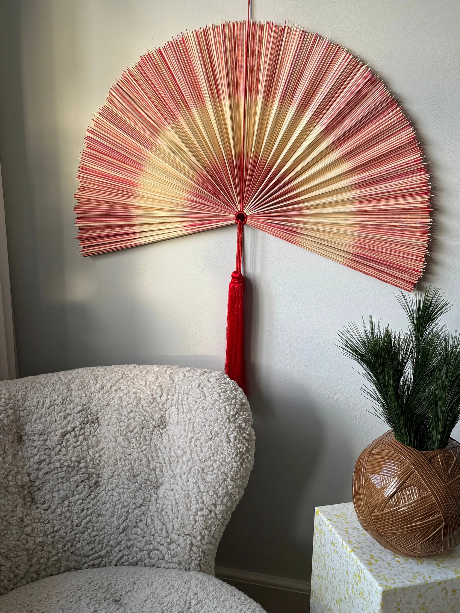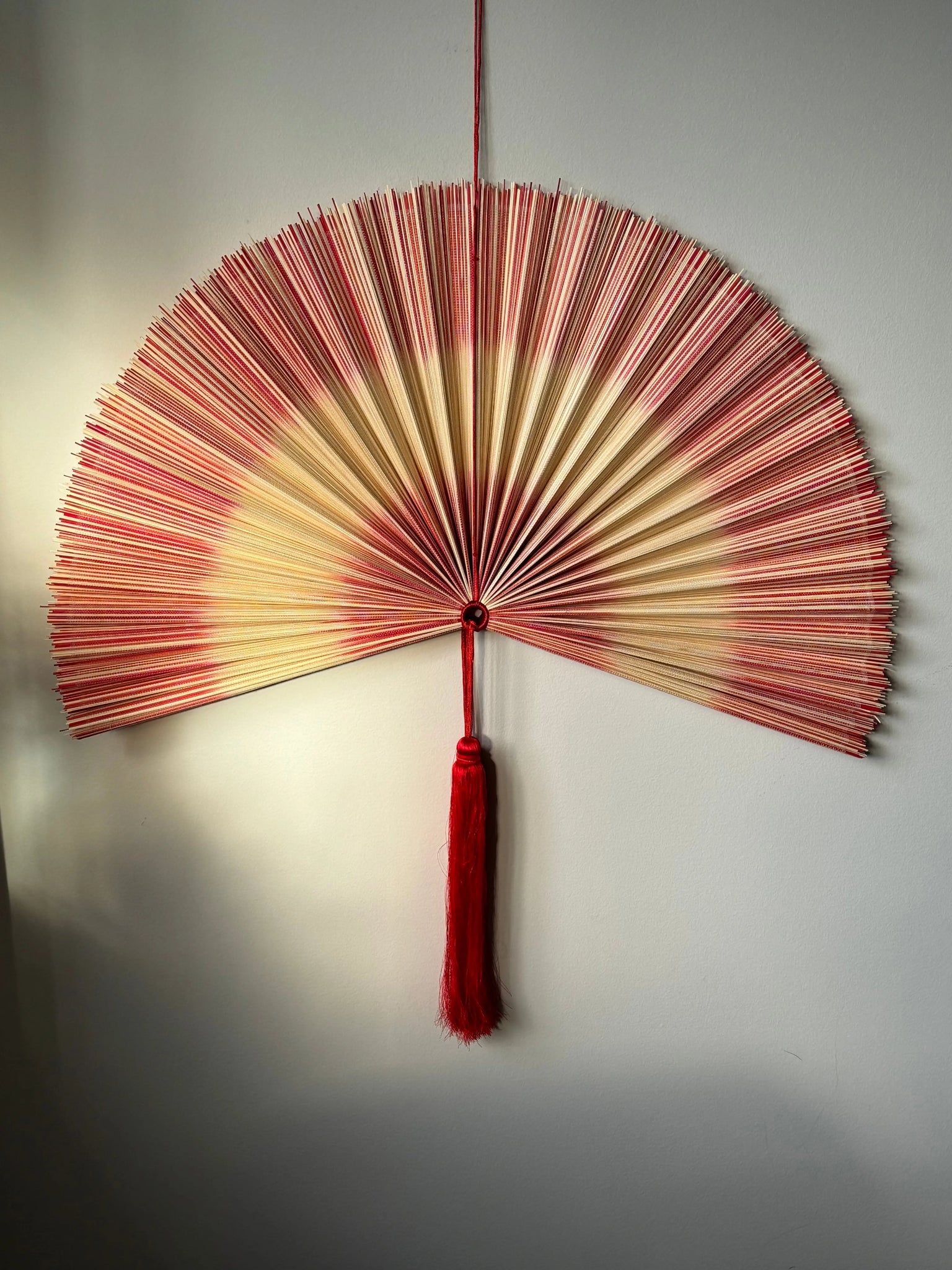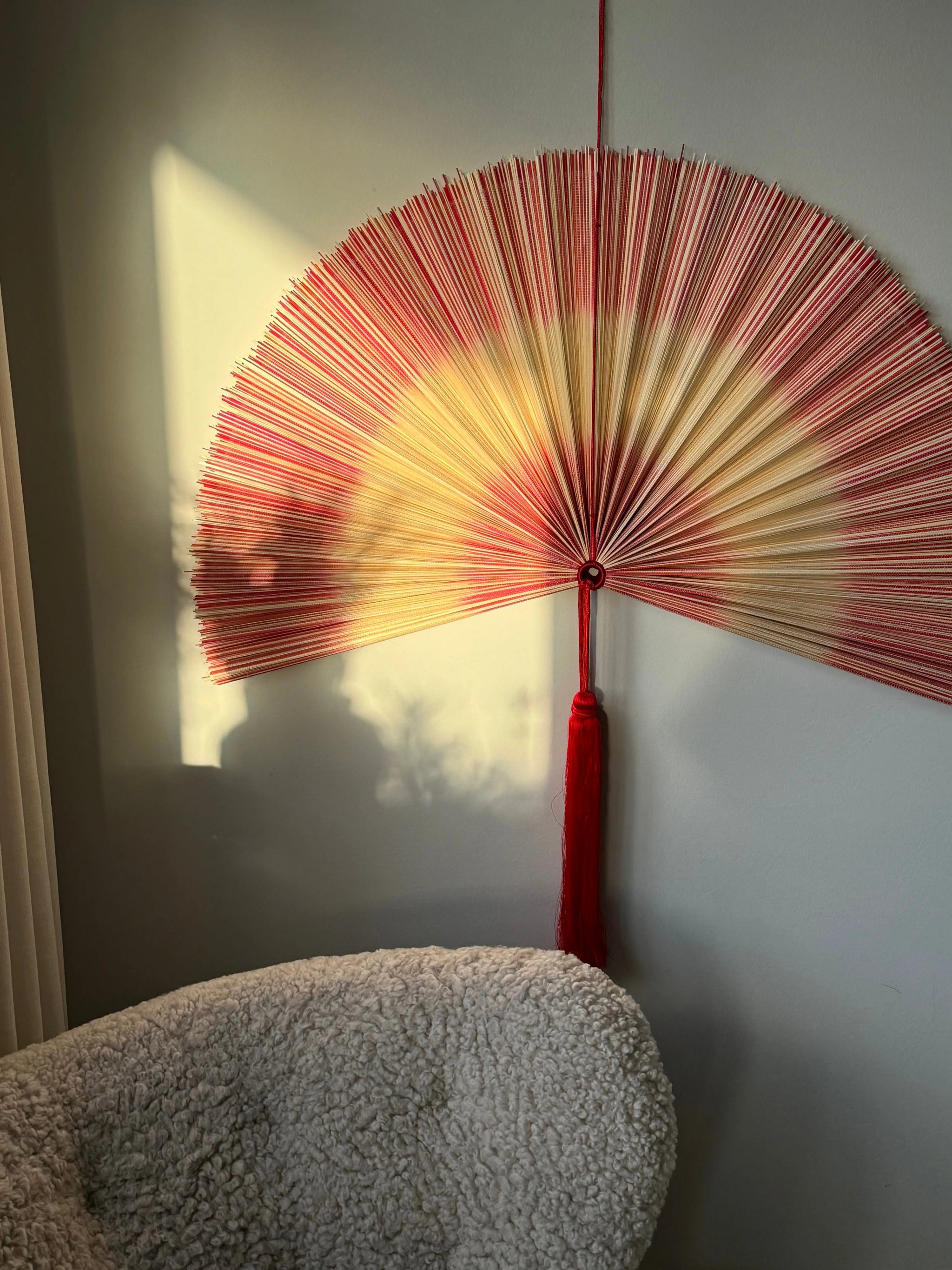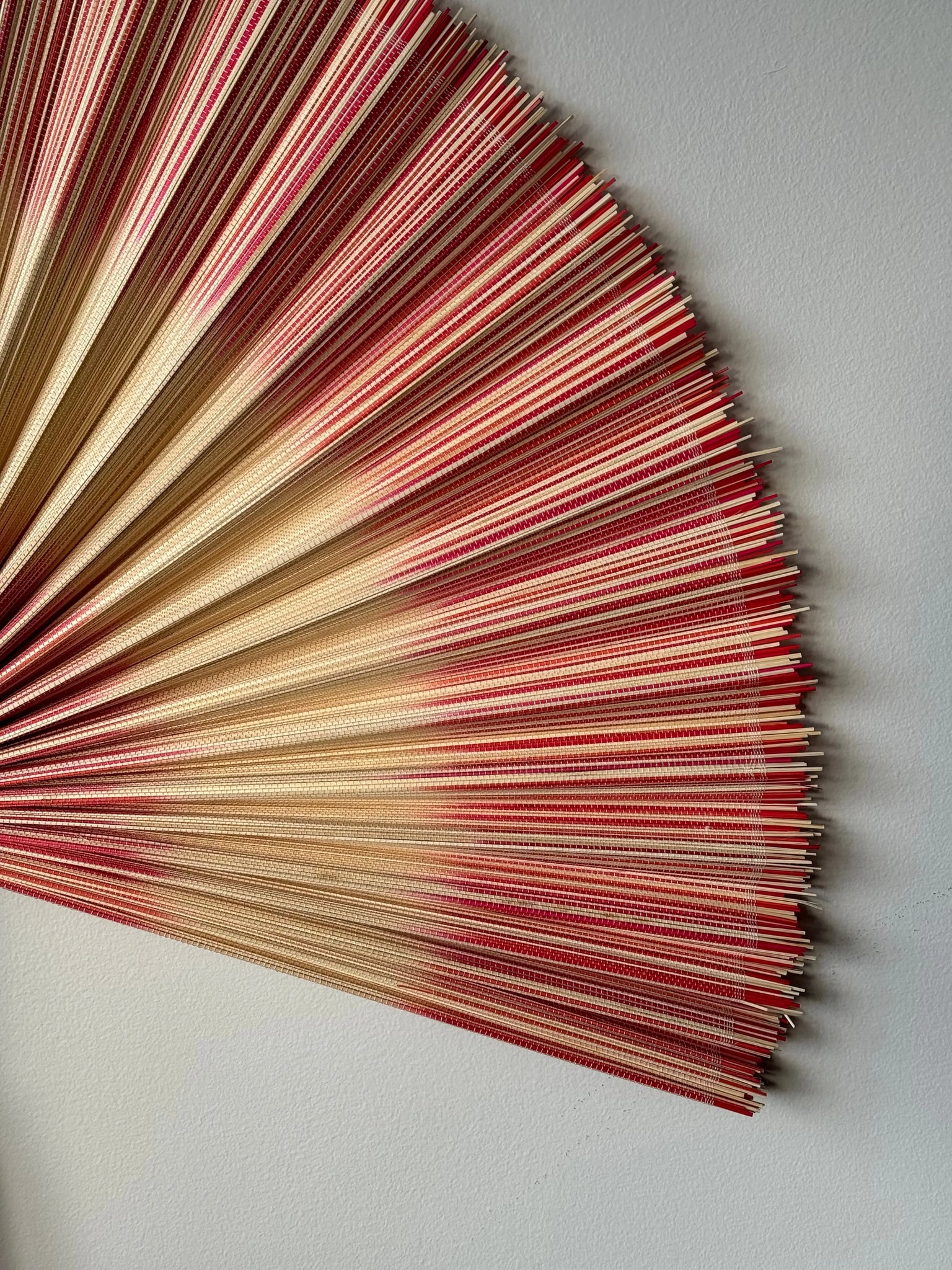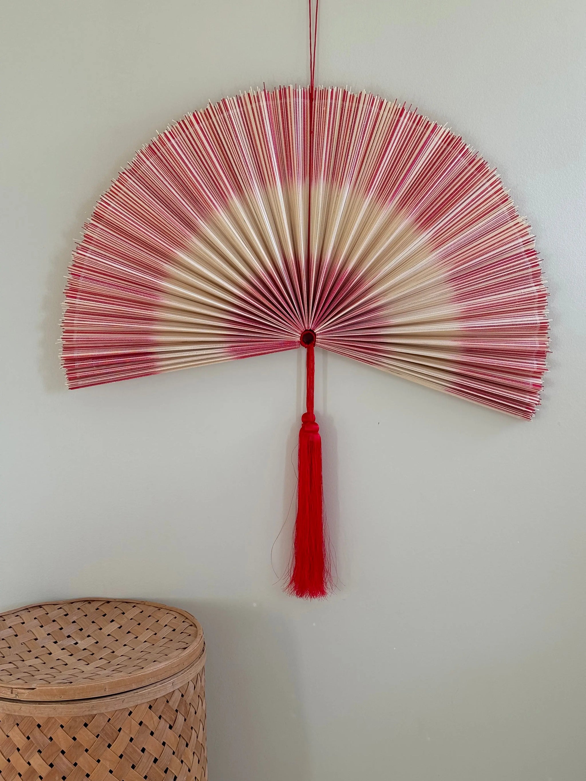 Discover our unique handmade bamboo fan from Vietnam in a beautiful combination of natural and red shades. The fan is adorned with two elegant red stripes and two decorative knobs, as well as a practical hanger that makes assembly easy. This stylish fan is available in three sizes: 80 cm, 100 cm and 120 cm, and it is available in several colors, so you can find the perfect fit for your interior.