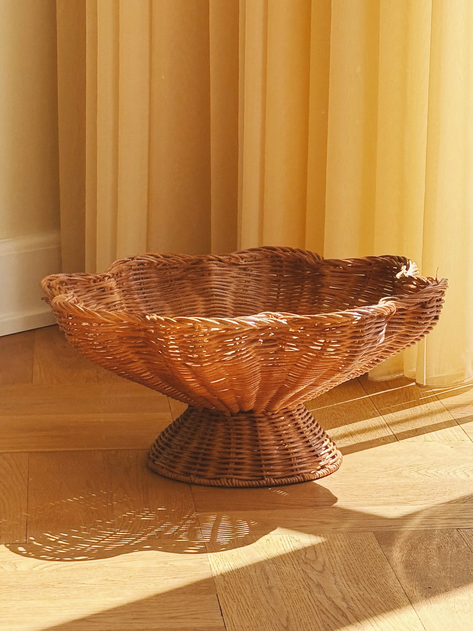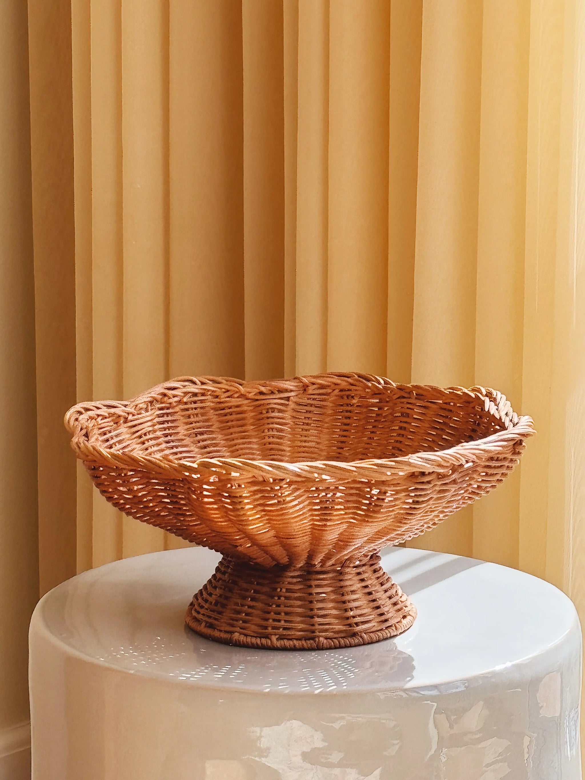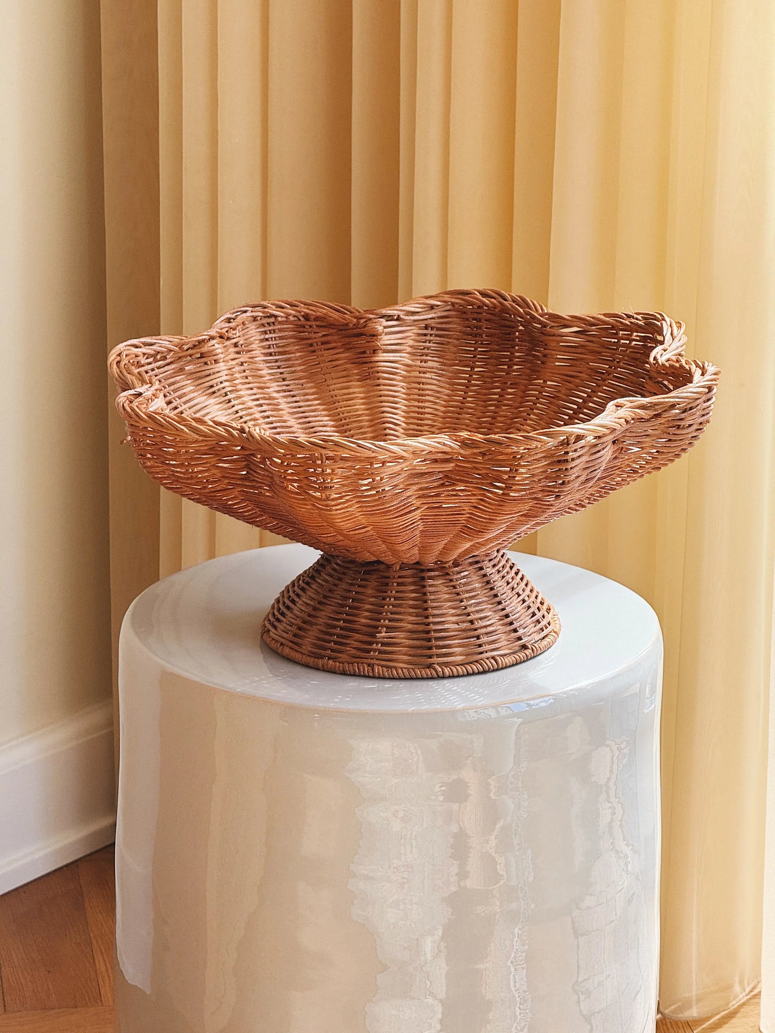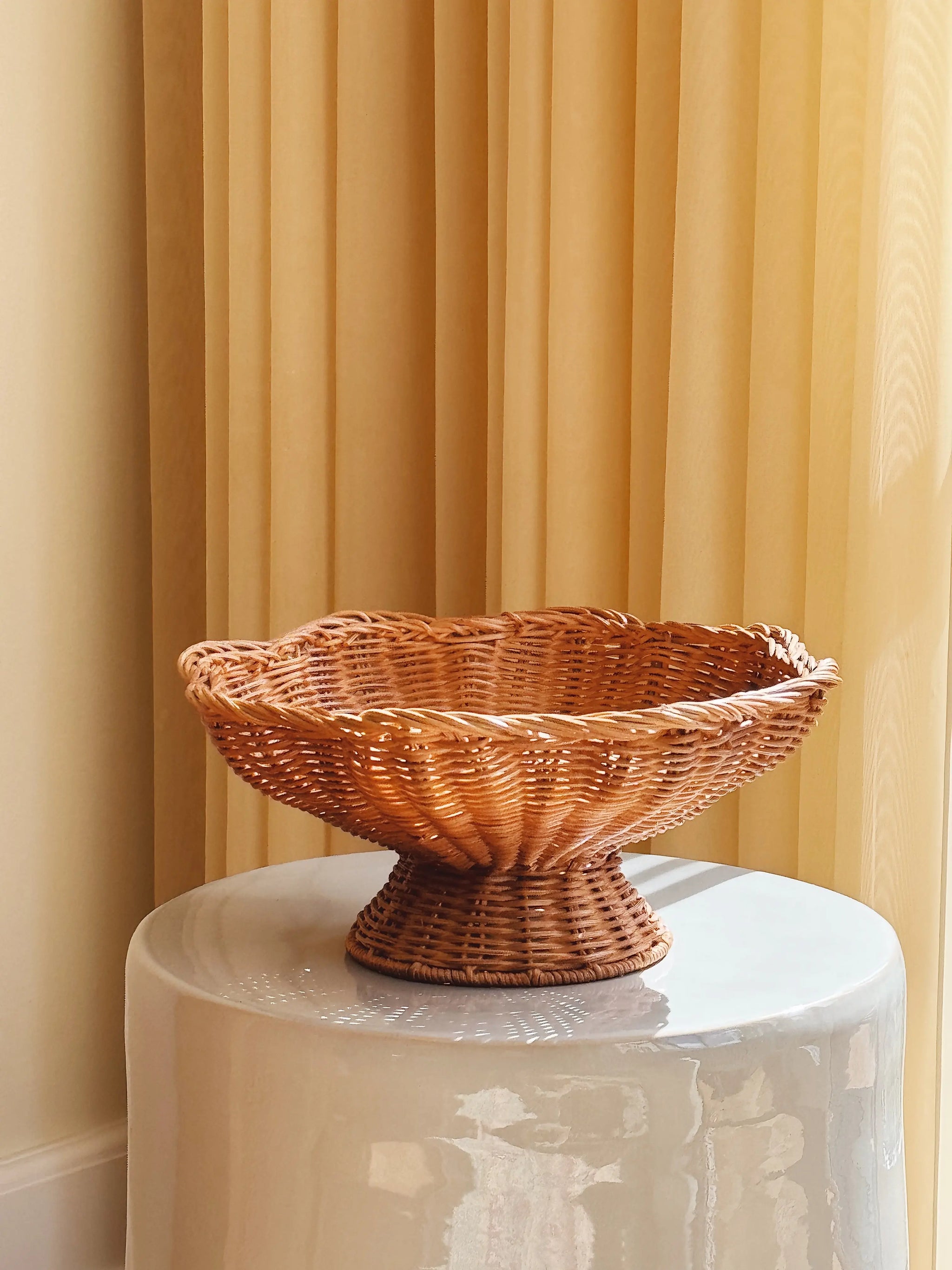 Bring texture and warmth into your home with our handwoven rattan pedestal bowl. Designed with a flared, scalloped edge and elevated base, this airy yet sculptural piece works beautifully as a fruit bowl, centrepiece, or decorative storage.