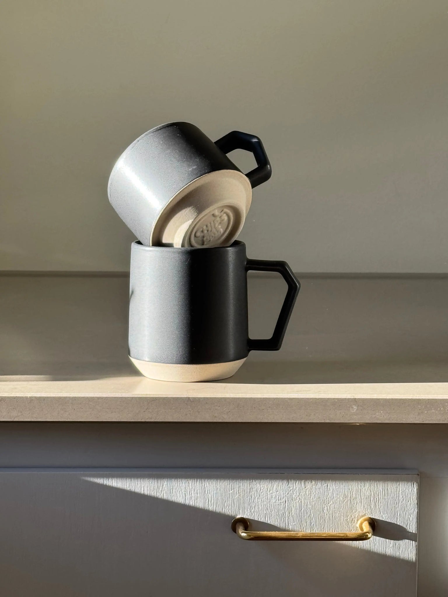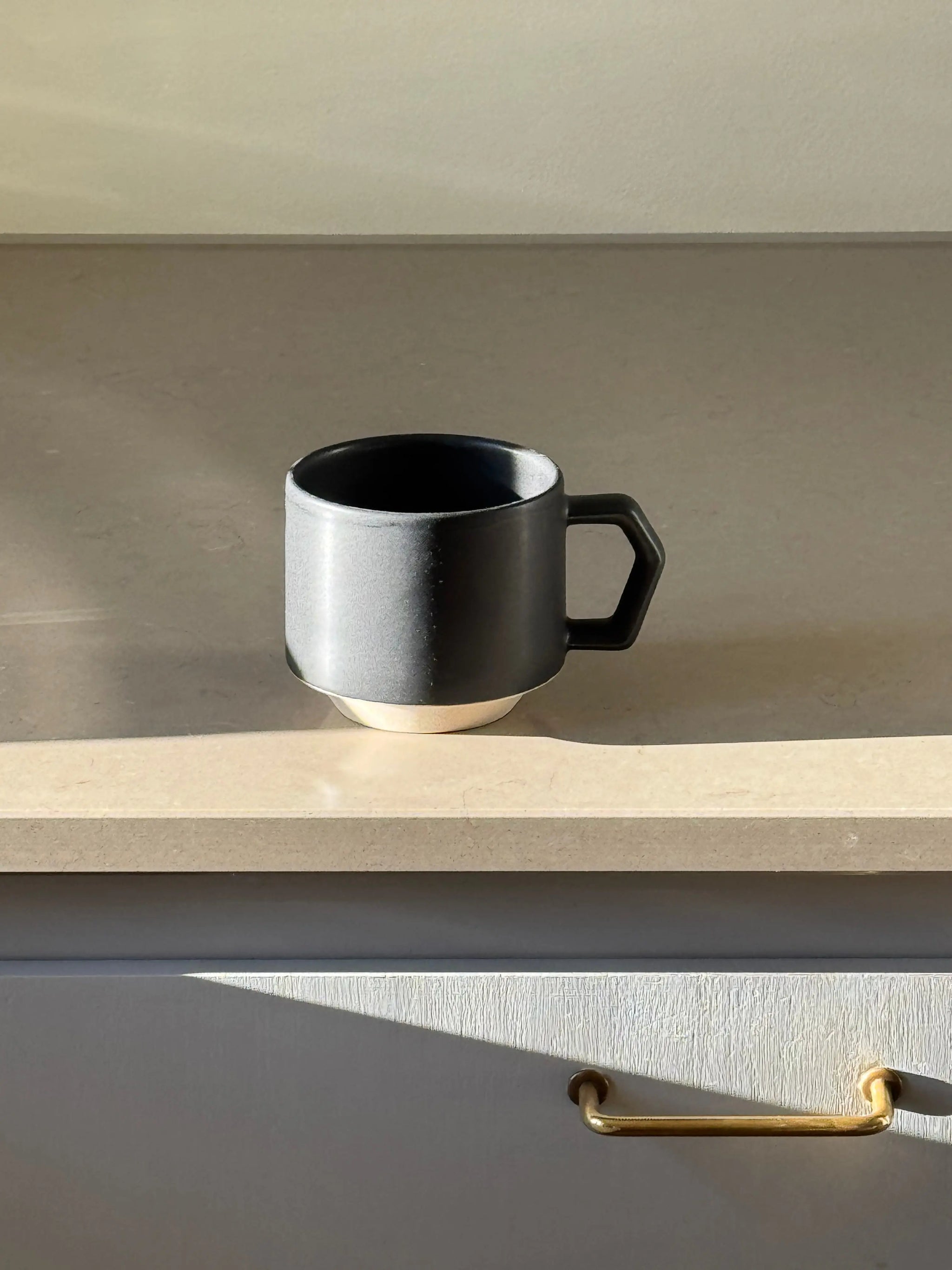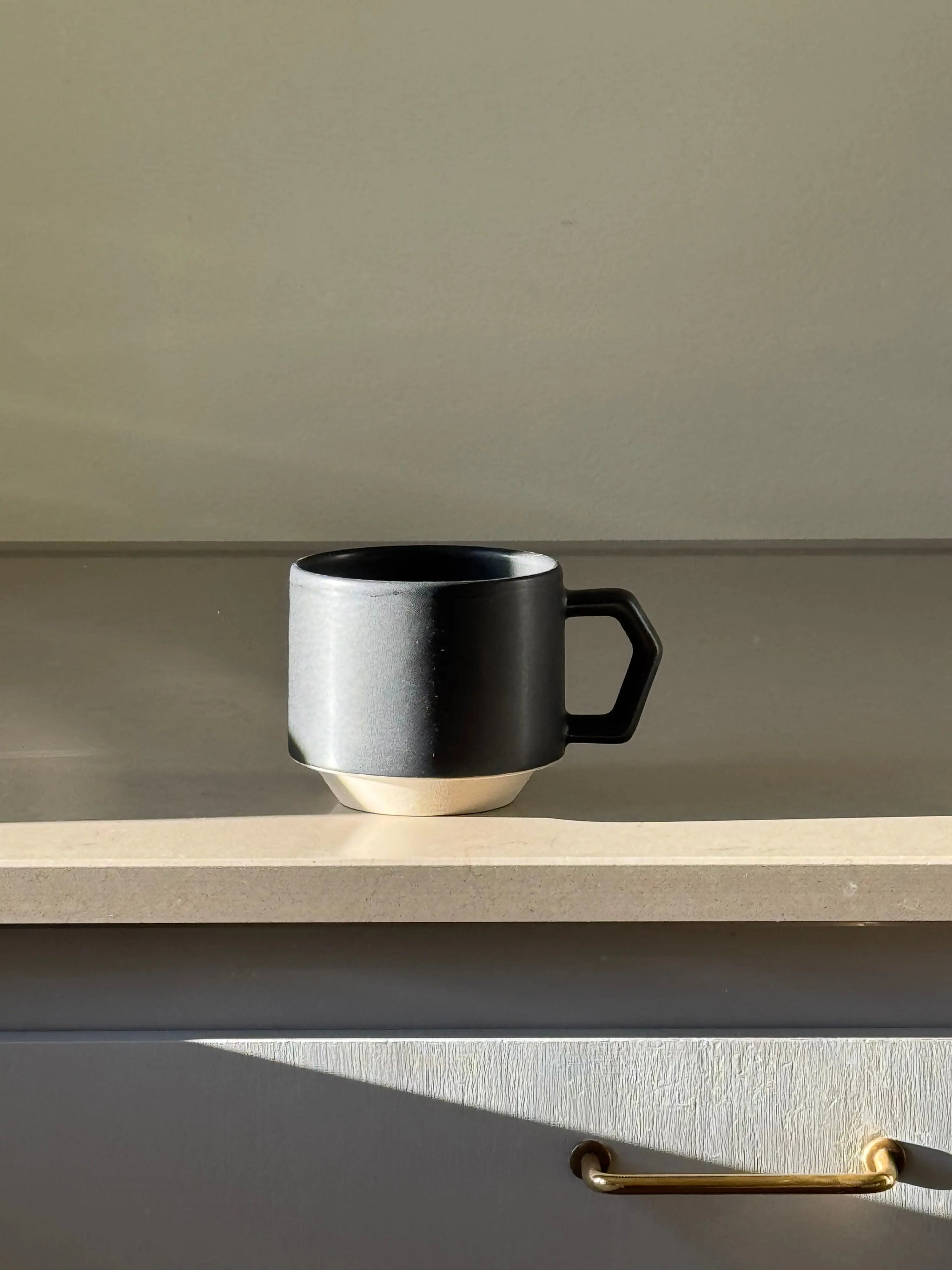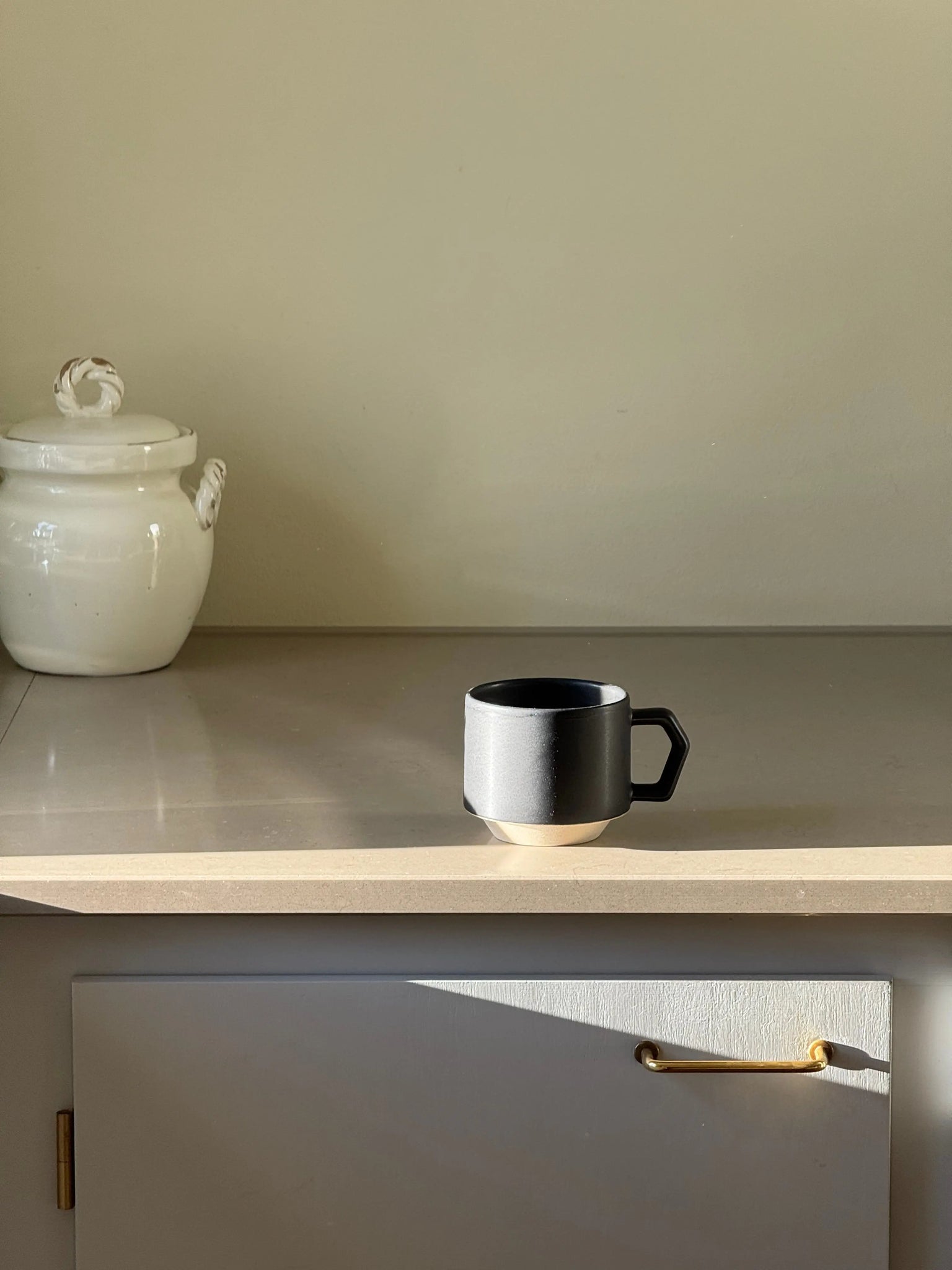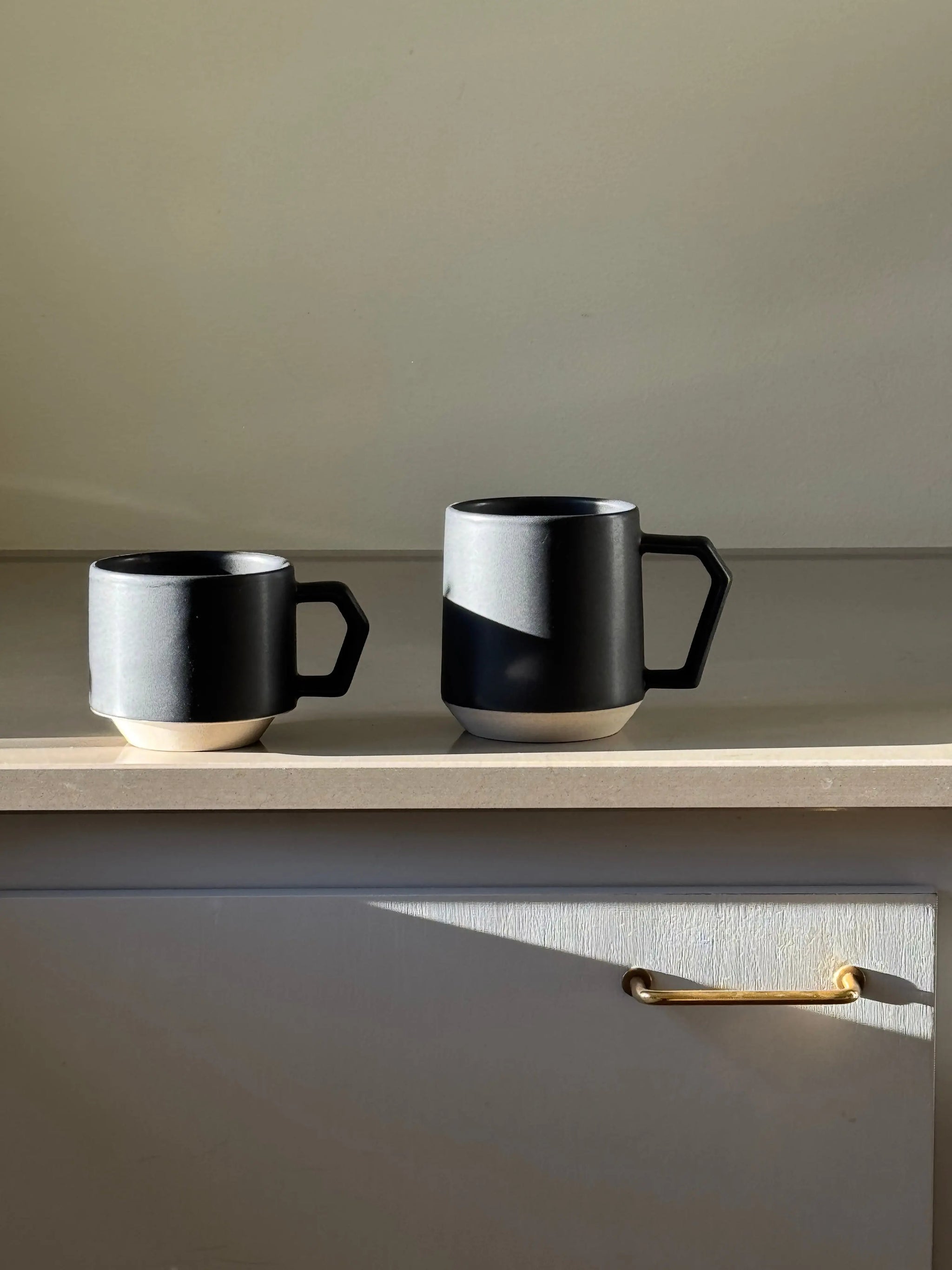 Chips mug in matte black with a light gray base, handcrafted in Japan. The unique handle is designed for a comfortable and easy grip. The mug is stackable, making it practical and space-saving in the cupboard. Also available in a larger 380 ml version.