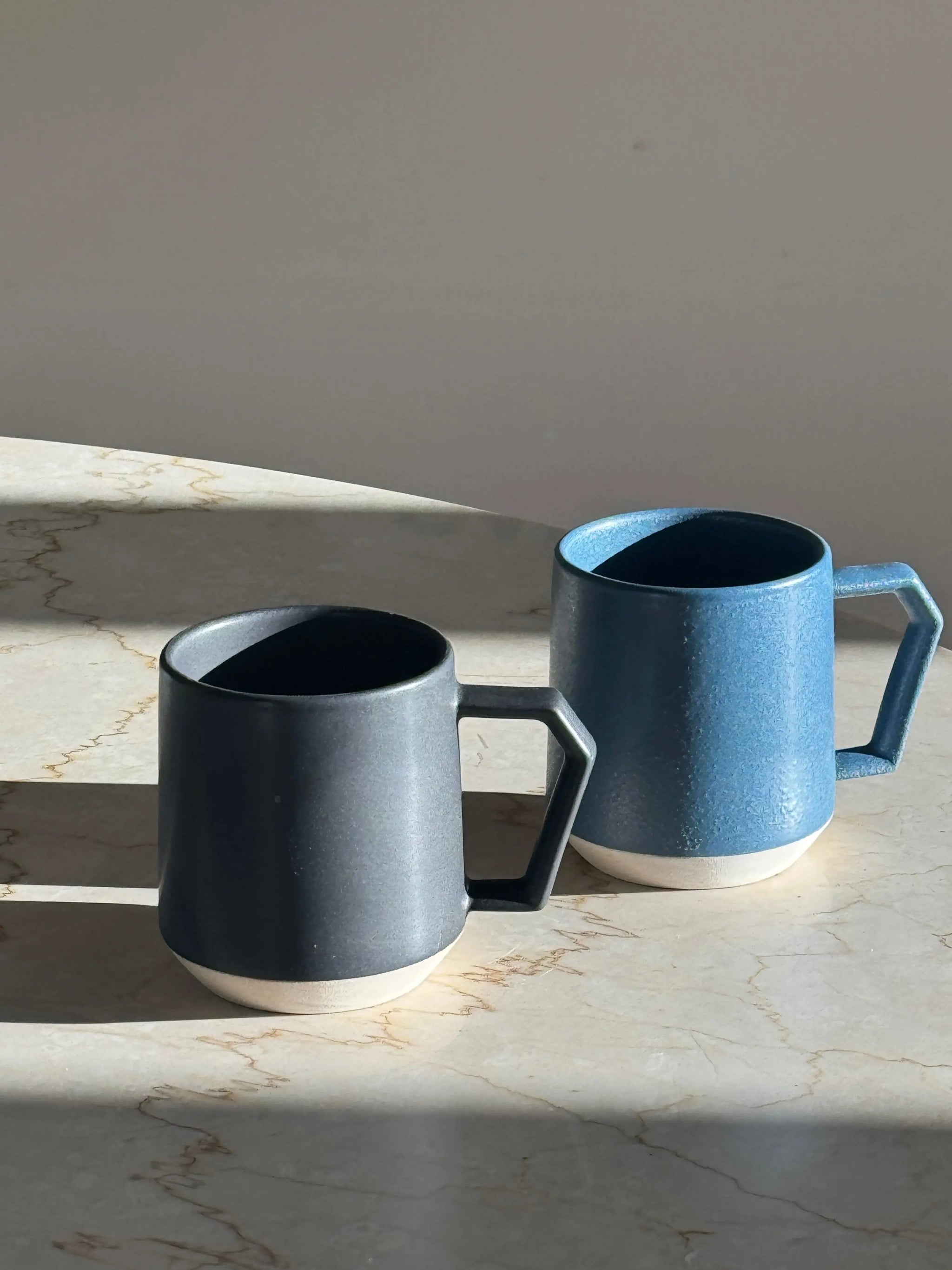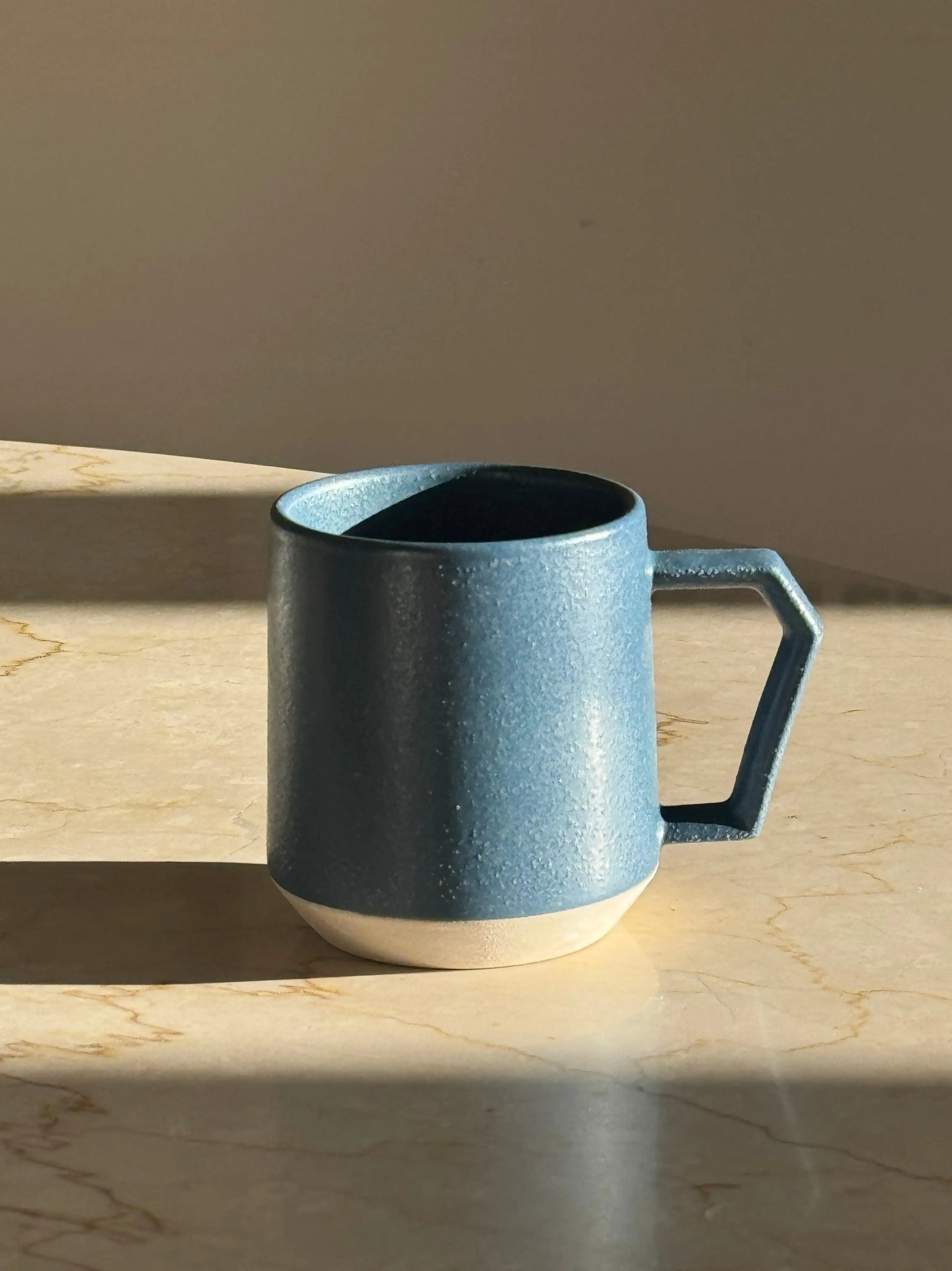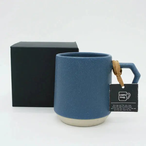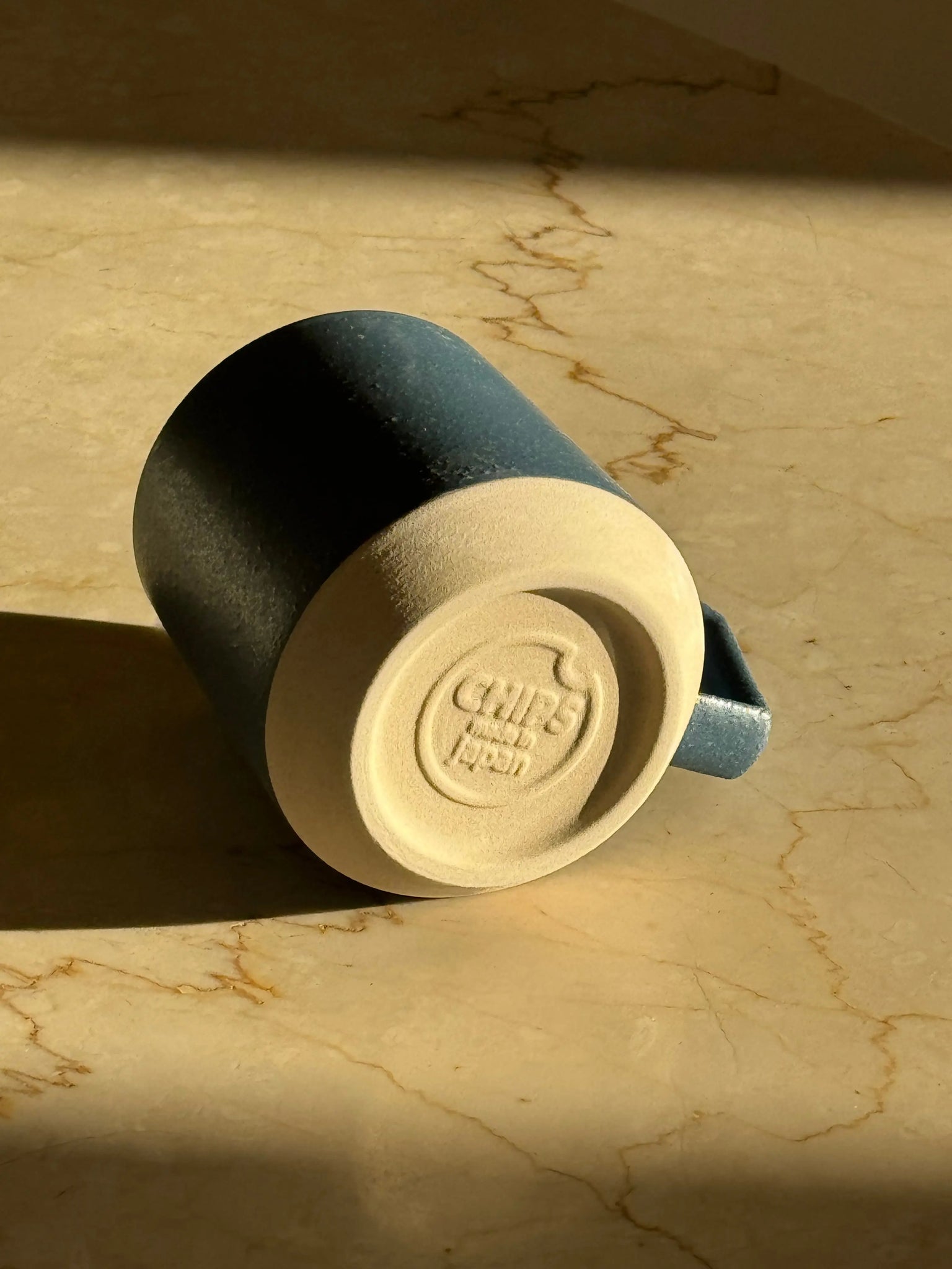 Chips mug in a beautiful matte blue color with a beige/white base. The unique handle is designed for a comfortable grip and ease of use.