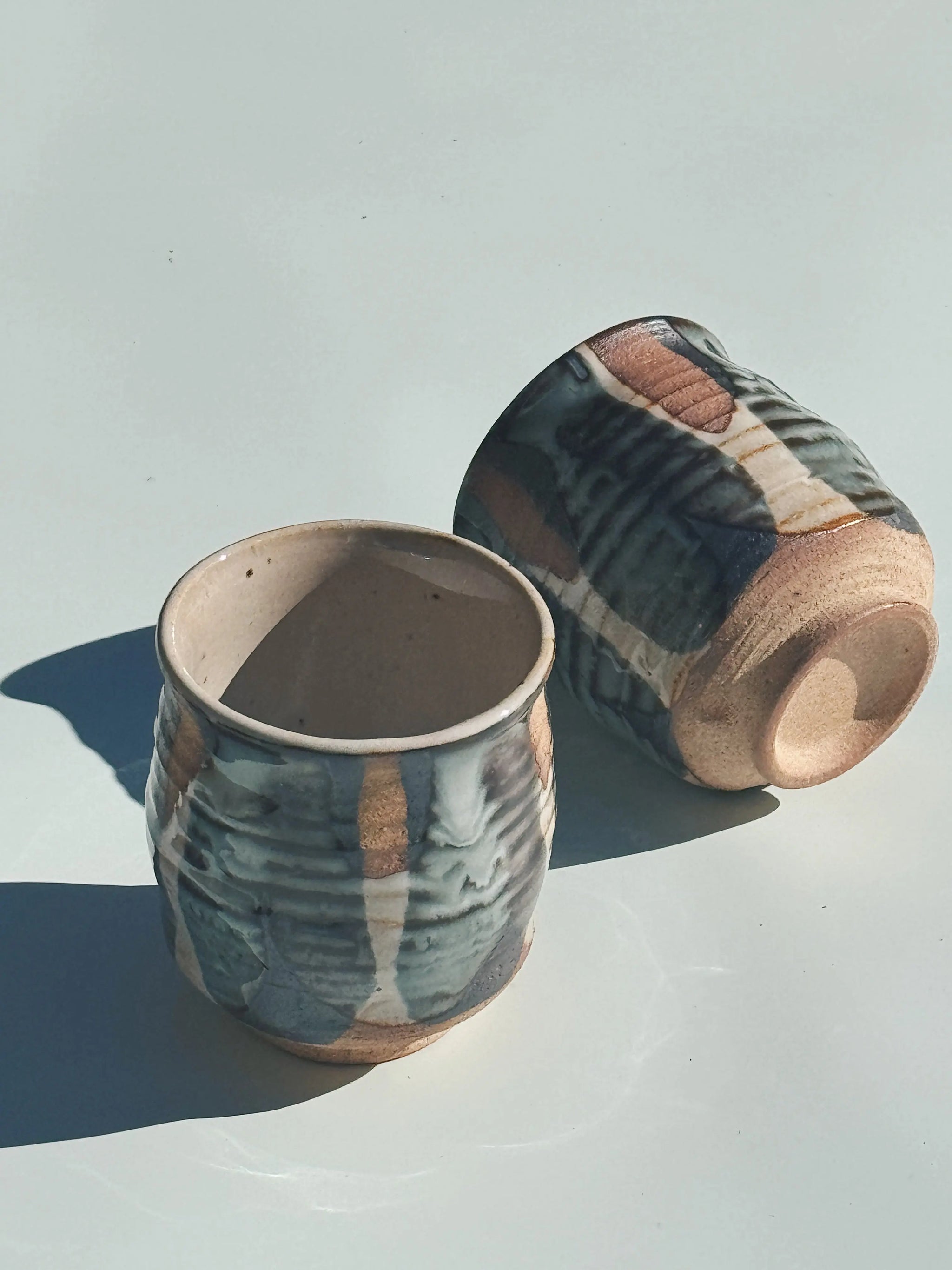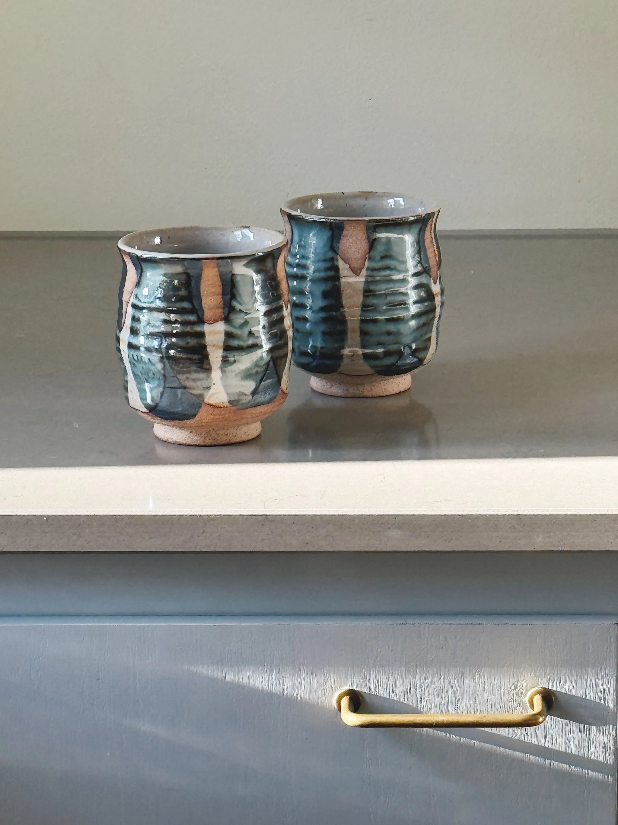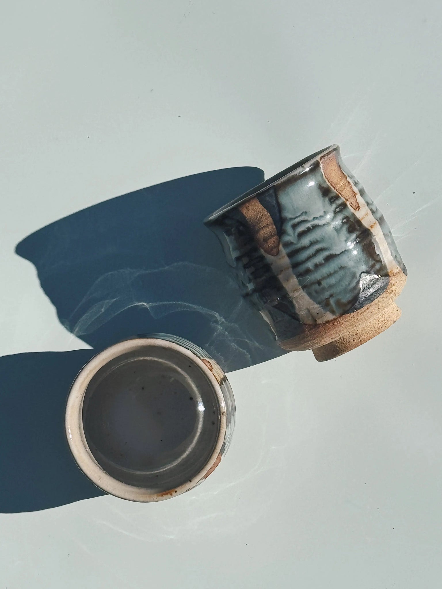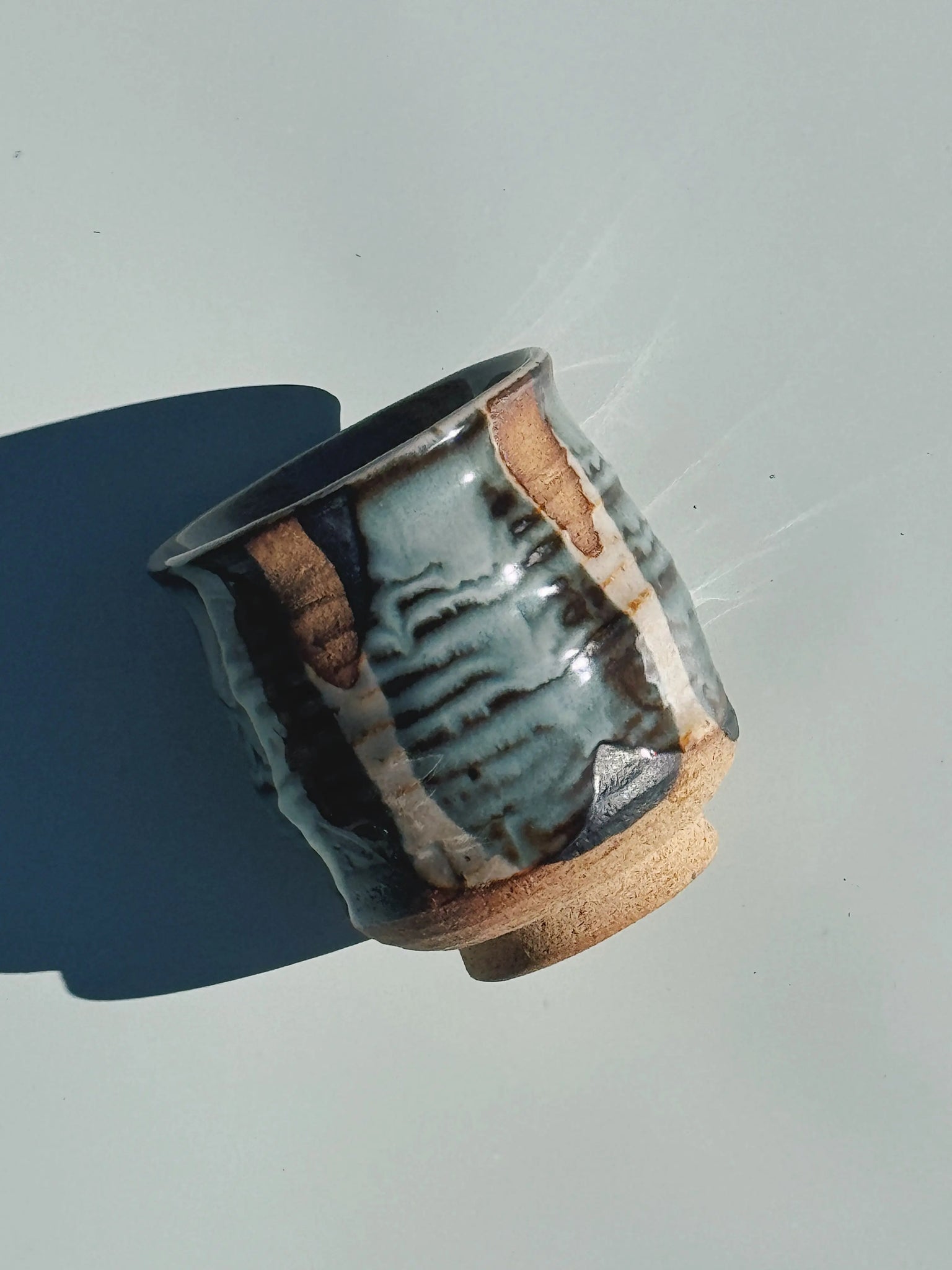 Ceramic cup from Japan featuring an artistic and rustic look in deep black, blue-green, beige, and warm brown tones. The organic shape and decorative glaze strokes give the cup a lively, almost painterly character, while the ribbed surface adds extra texture and personality.