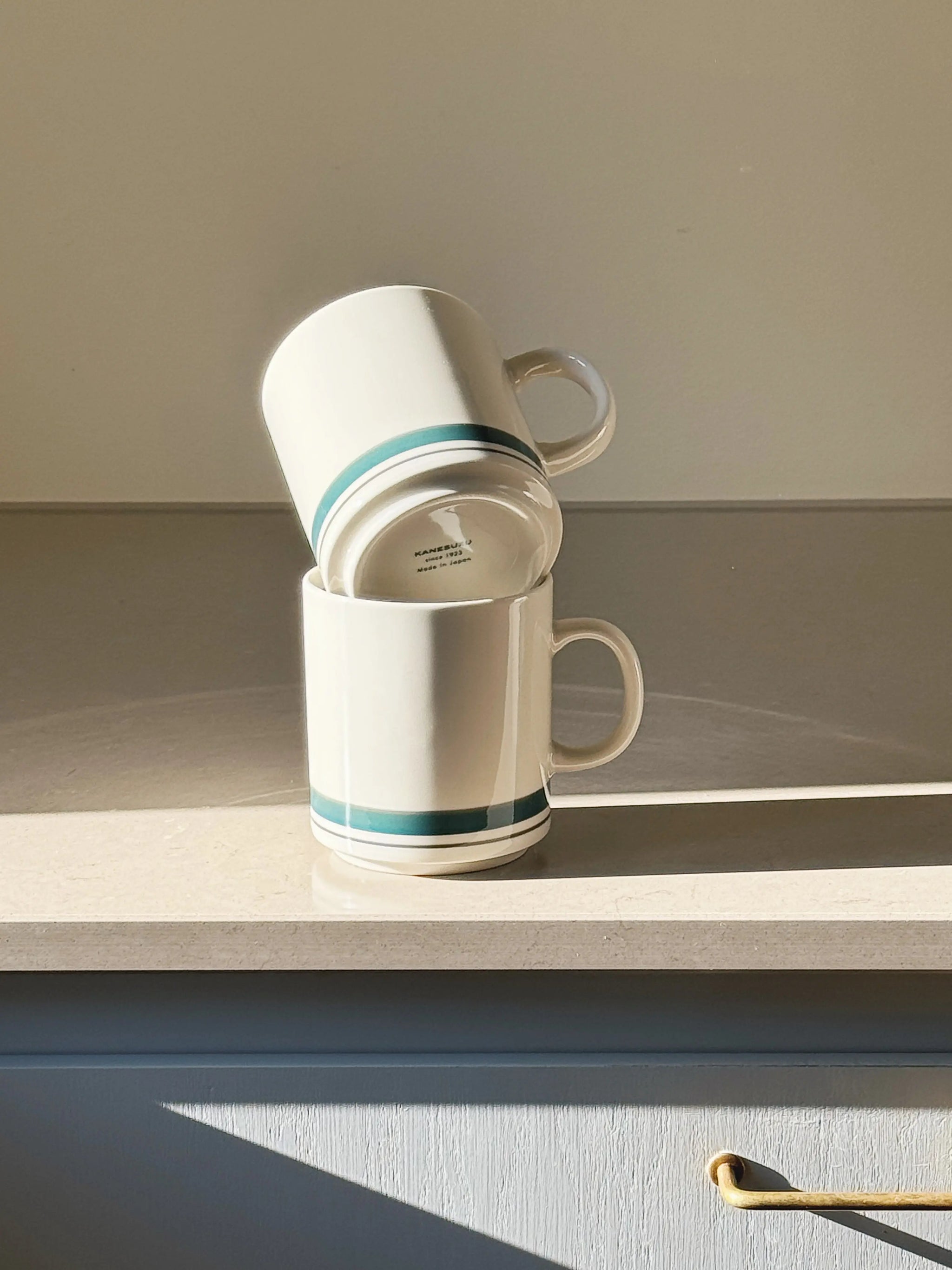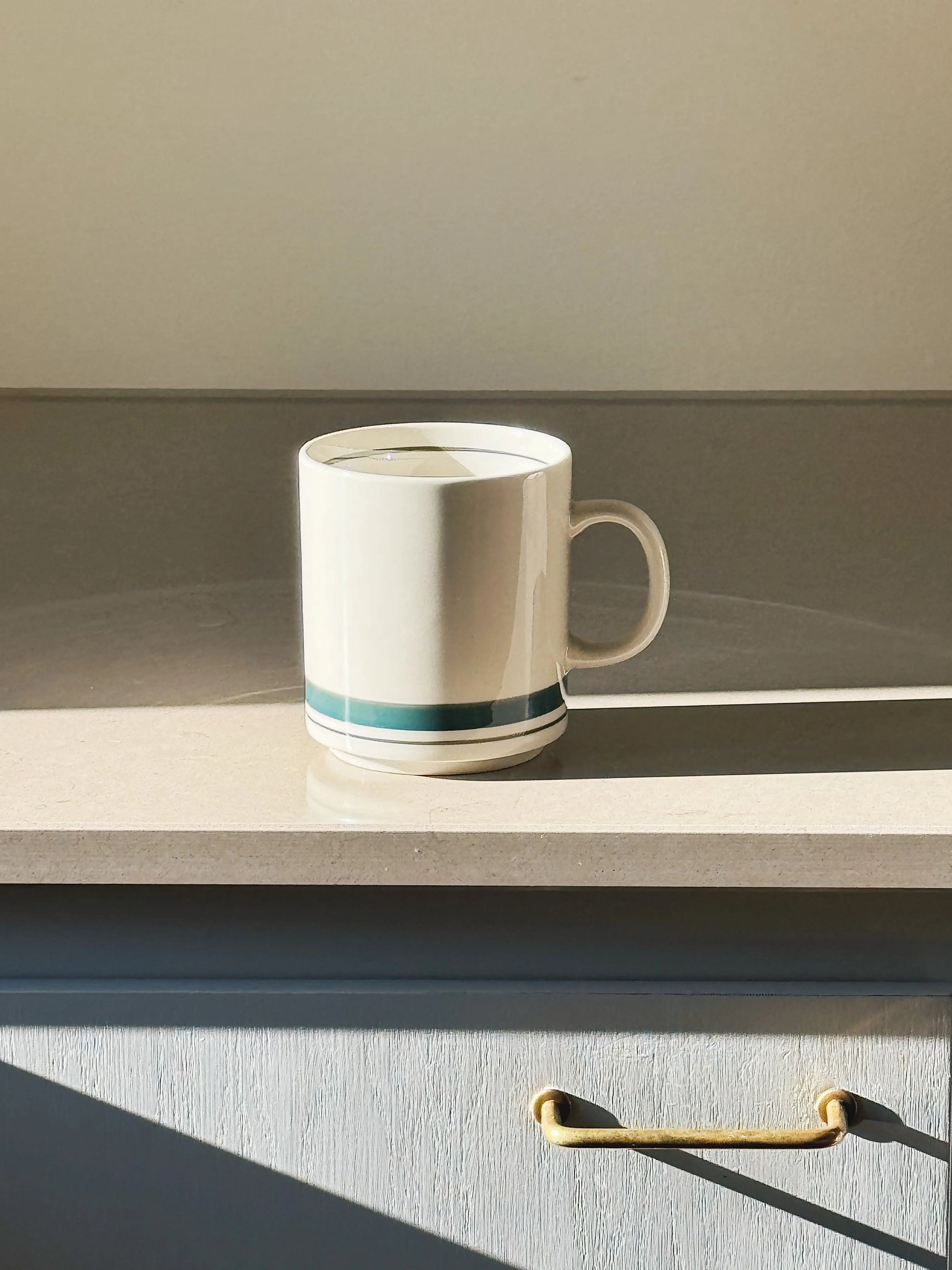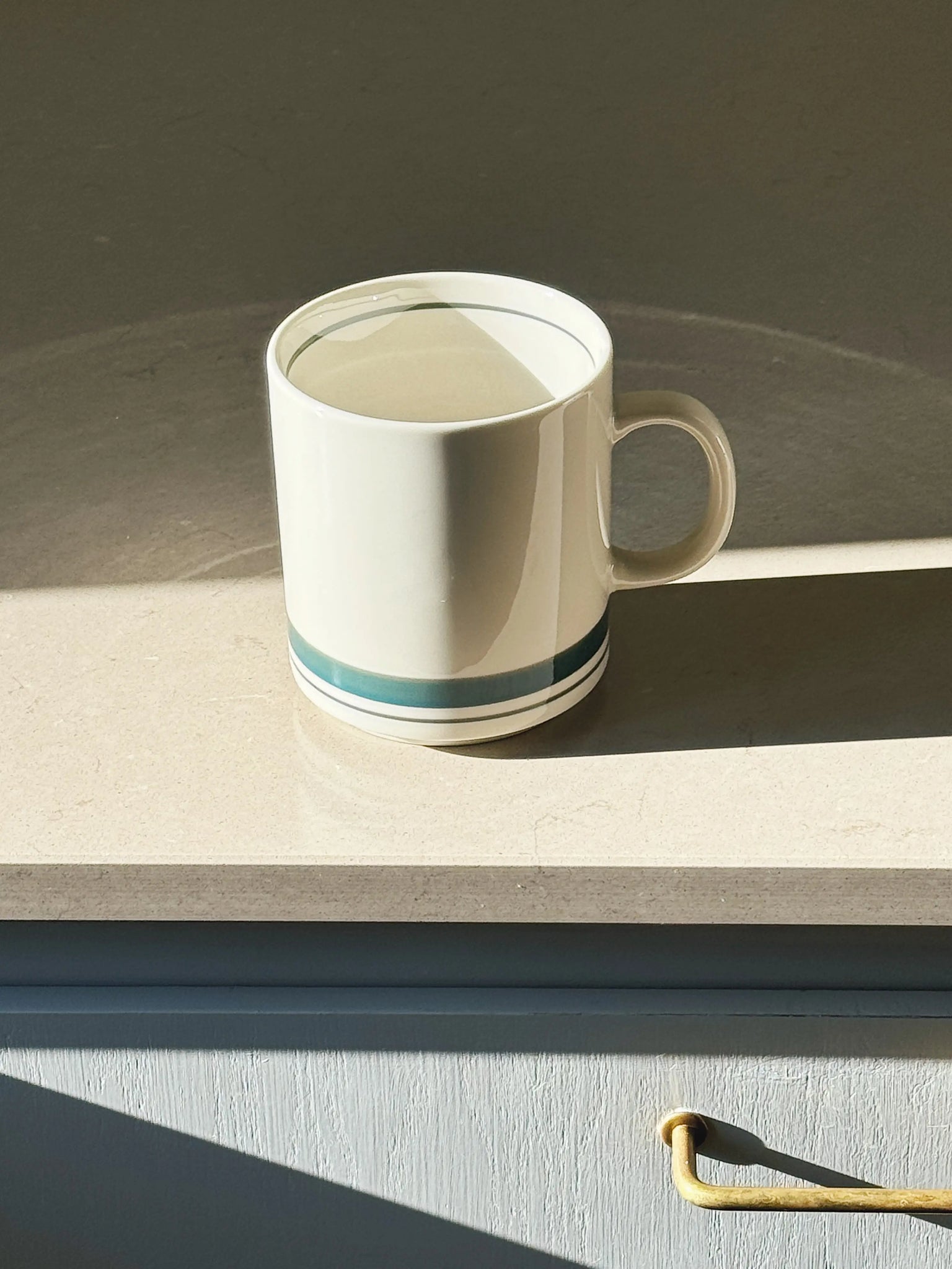 A clean and timeless Japanese ceramic mug with hand-painted green stripes – part of the retro-inspired series that includes bowls, plates, and serving dishes. The mug fits comfortably in the hand and has a classic shape, perfect for enjoying coffee, tea, hot chocolate, or any warm beverage. The minimalist design fits seamlessly into both modern and nostalgic kitchens.