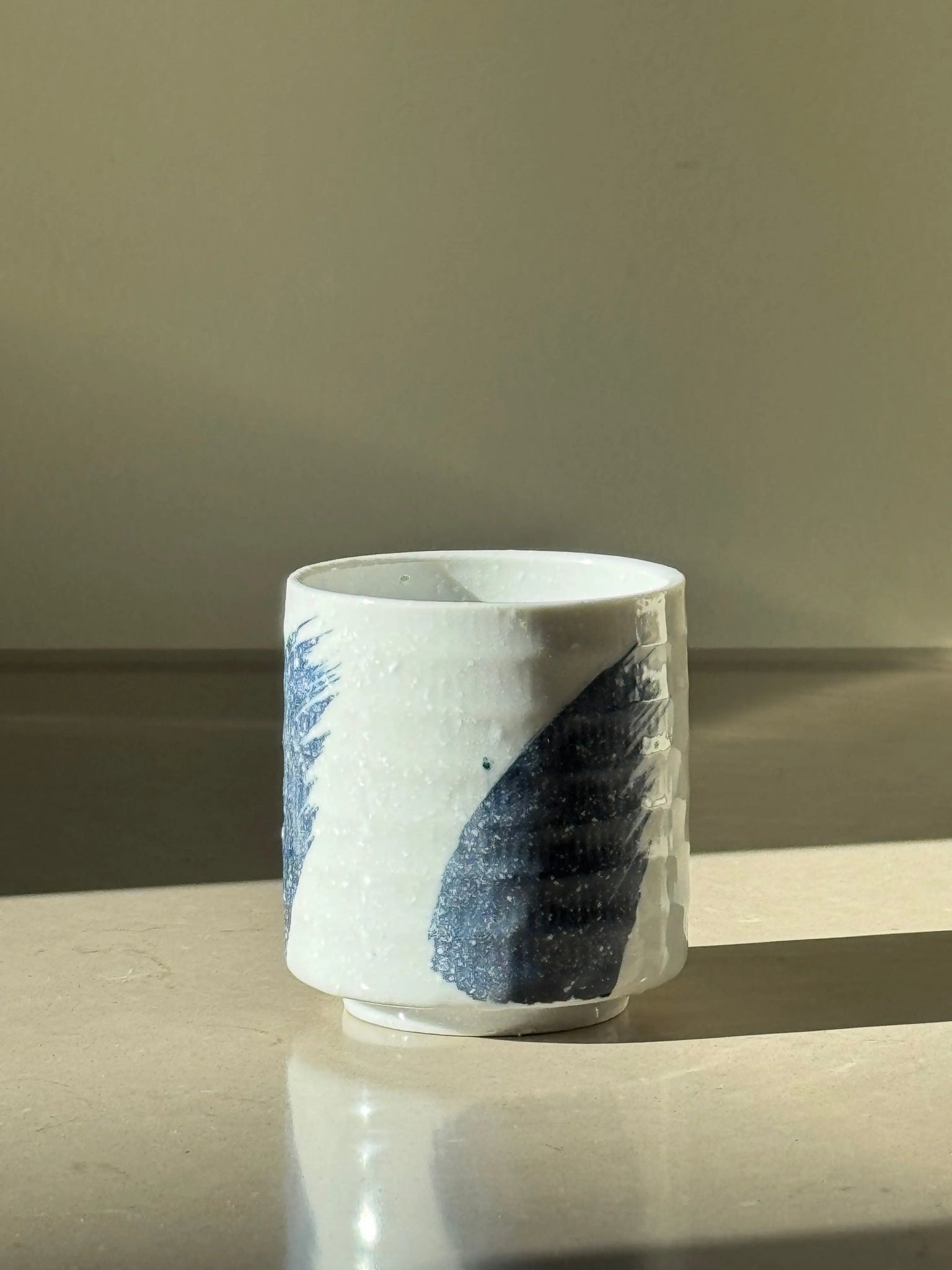 This Japanese tea cup is made from food-safe ceramics and decorated with a hand-painted blue brushstroke on a raw white background. The cup is crafted in Mino ceramics – a renowned Japanese tradition known for its natural beauty and durability.