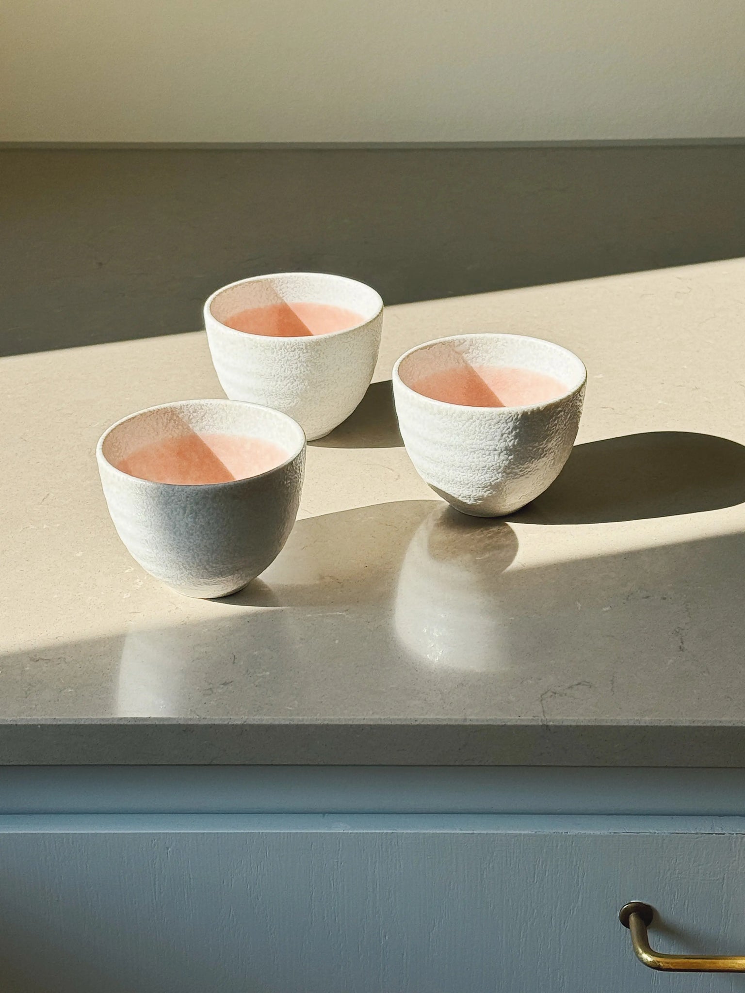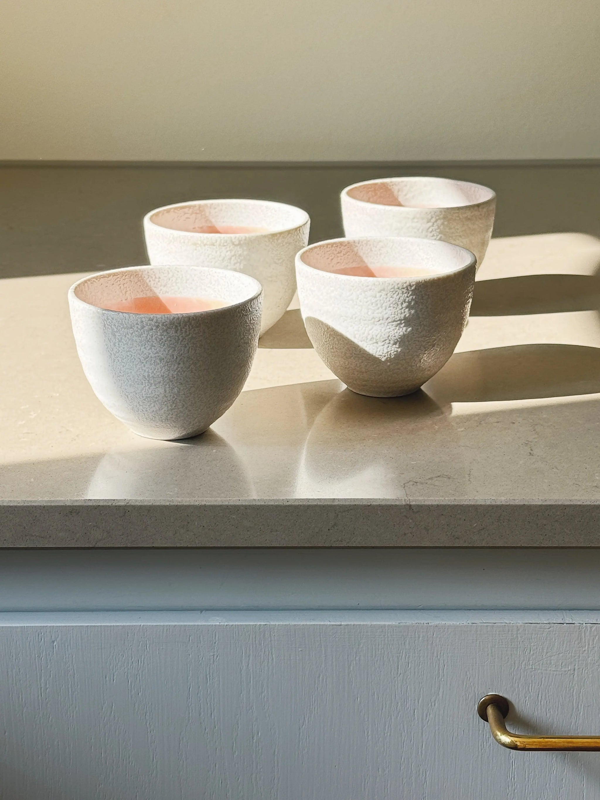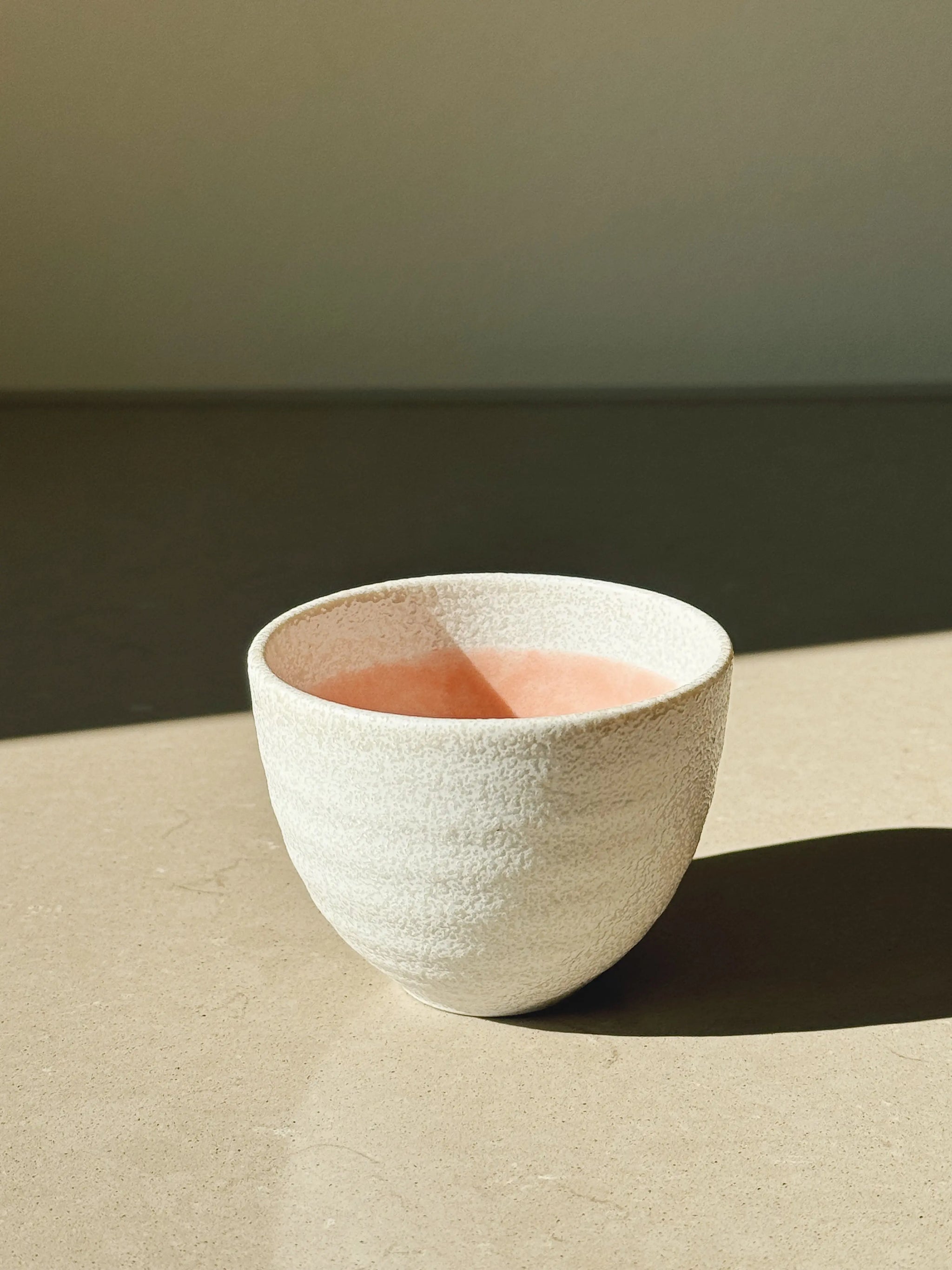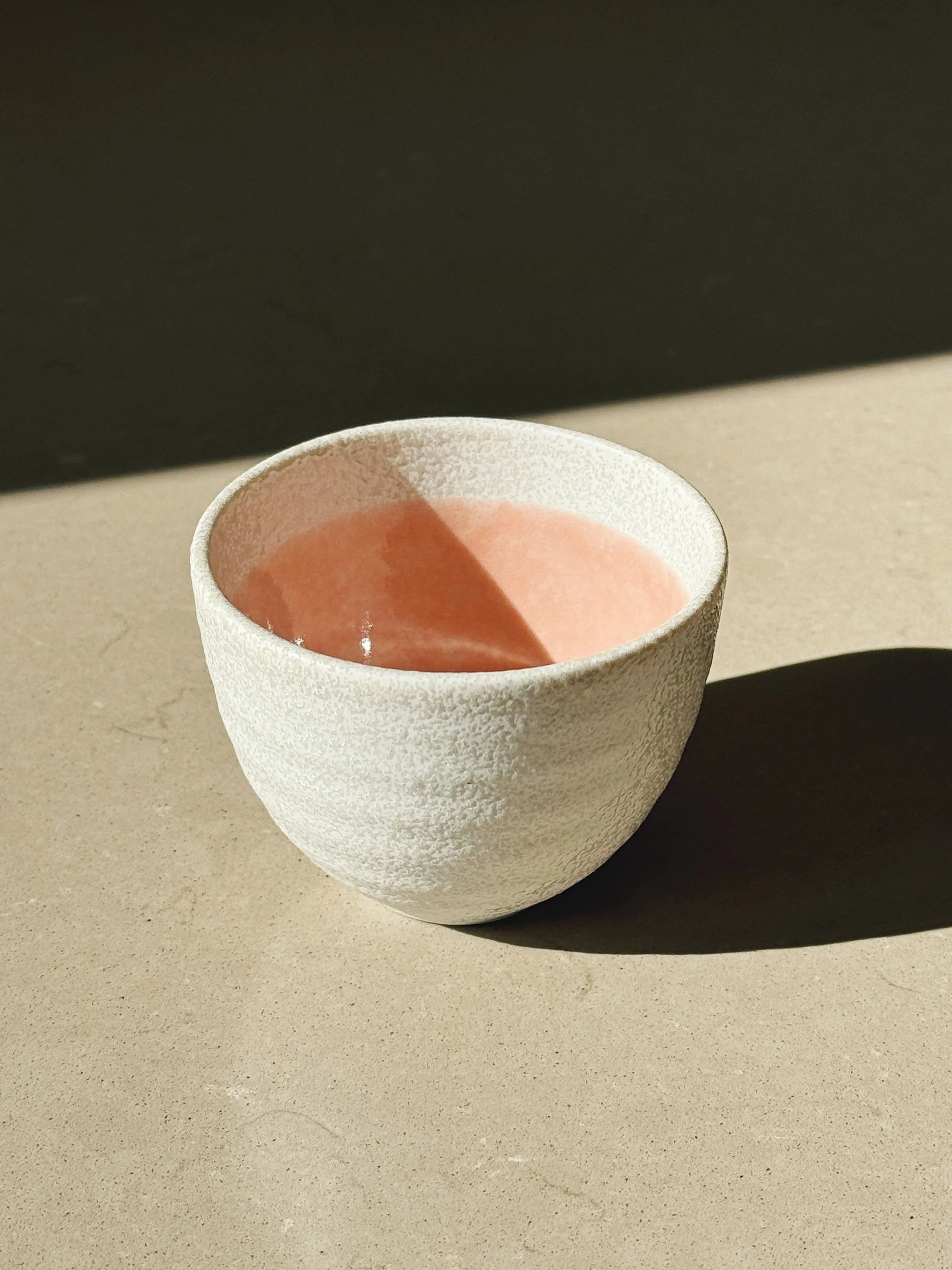 A delicate Japanese teacup without a handle, featuring a matte white exterior and a soft pink glazed interior. The clean, rounded form fits comfortably in the hand and creates a calm, minimal aesthetic at the table. Ideal for green tea, herbal tea, or any warm beverage in smaller portions.