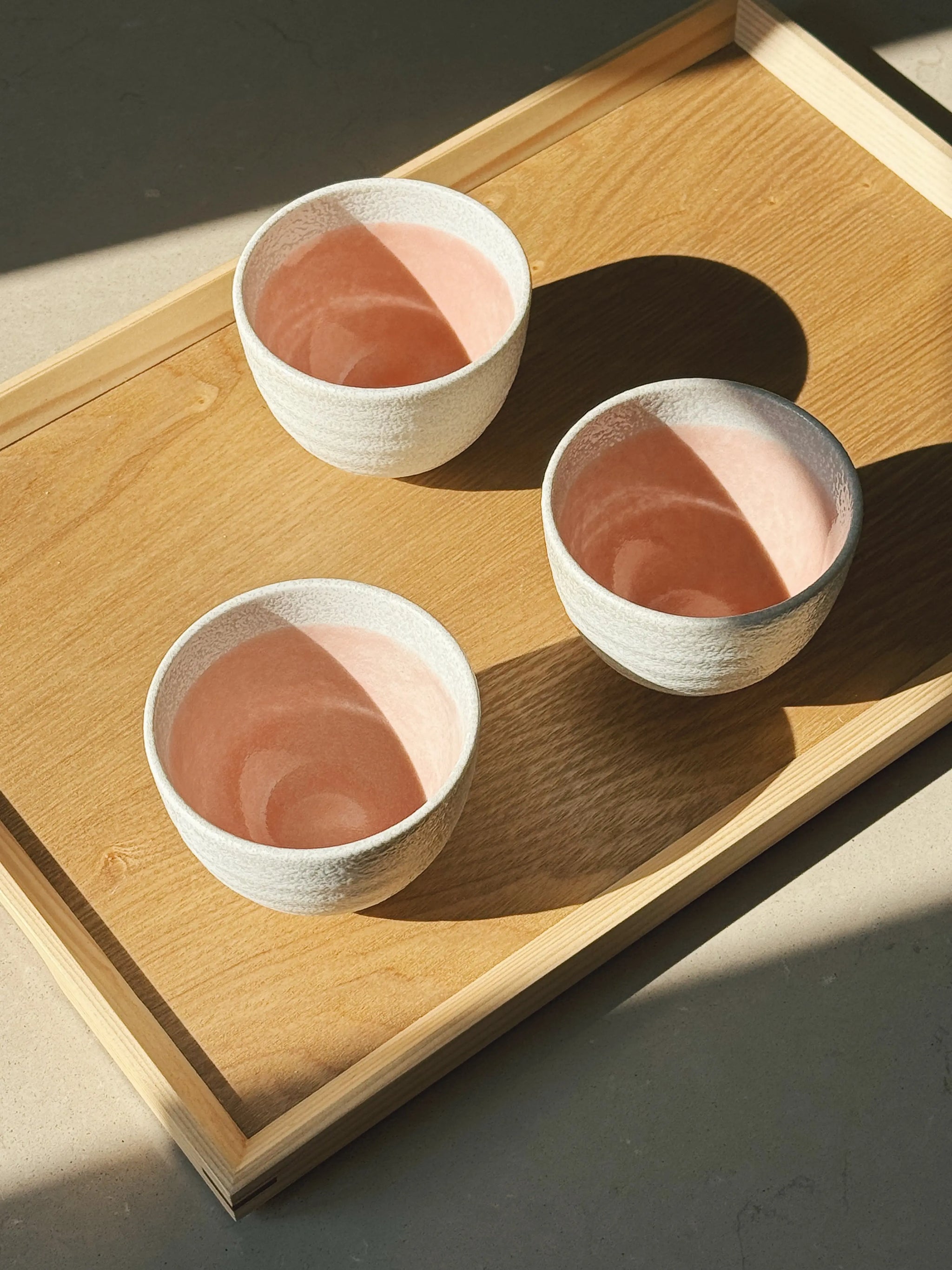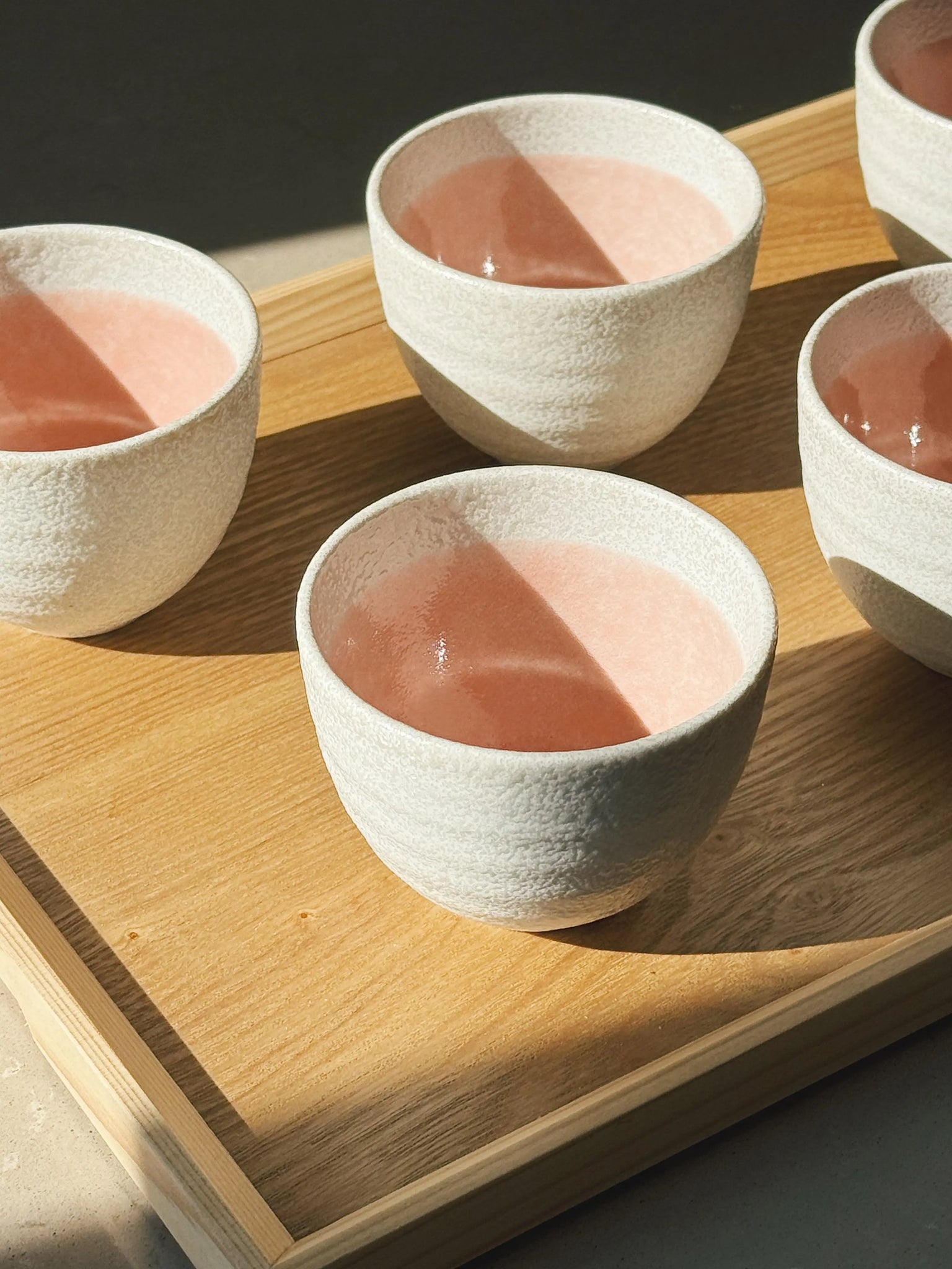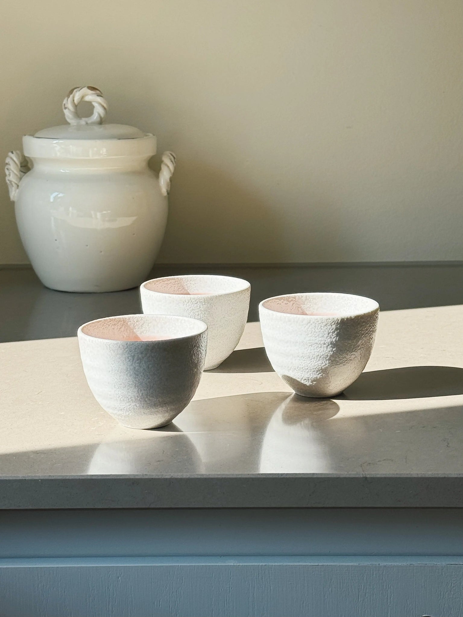 A delicate Japanese teacup without a handle, featuring a matte white exterior and a soft pink glazed interior. The clean, rounded form fits comfortably in the hand and creates a calm, minimal aesthetic at the table. Ideal for green tea, herbal tea, or any warm beverage in smaller portions.