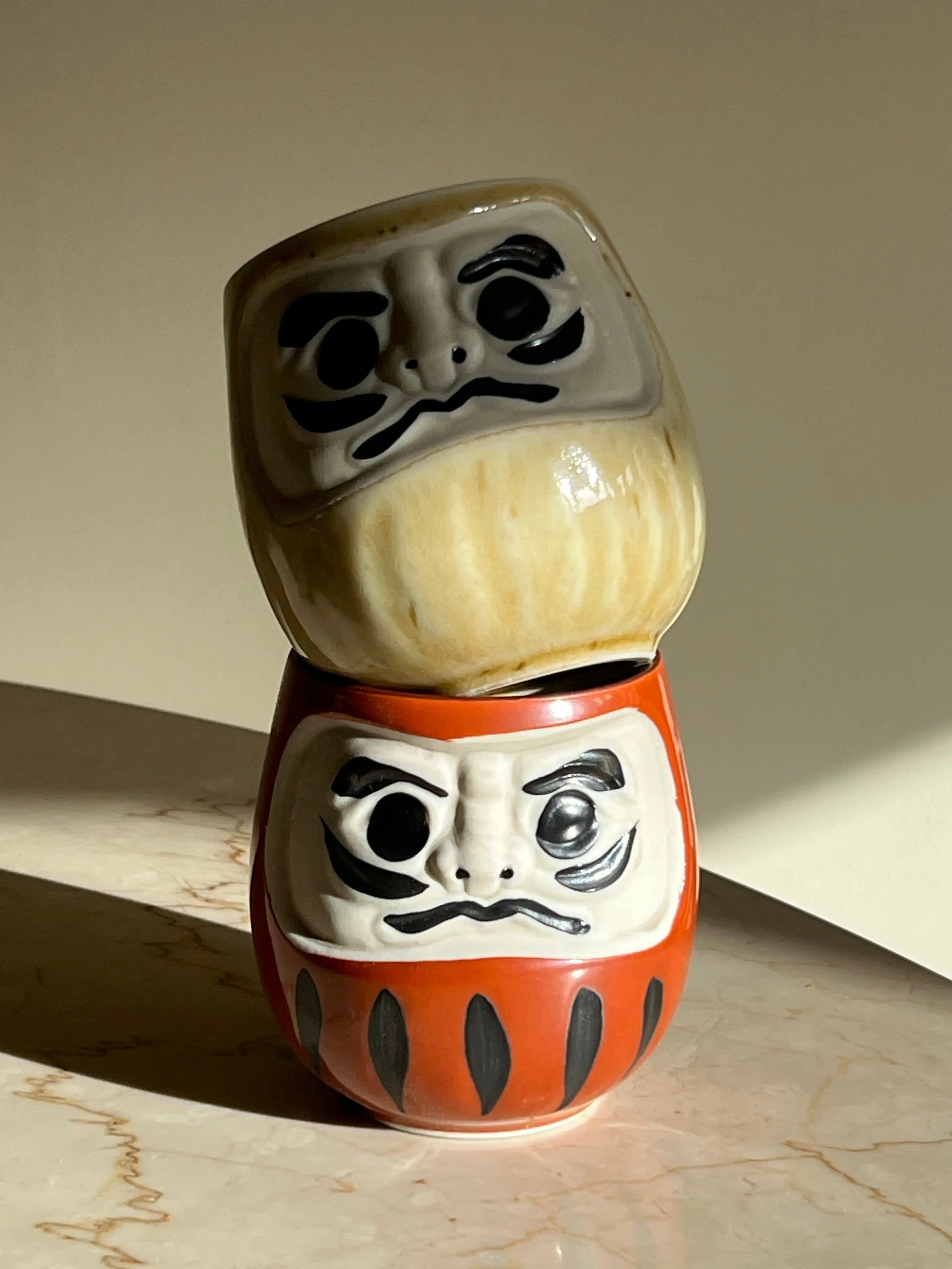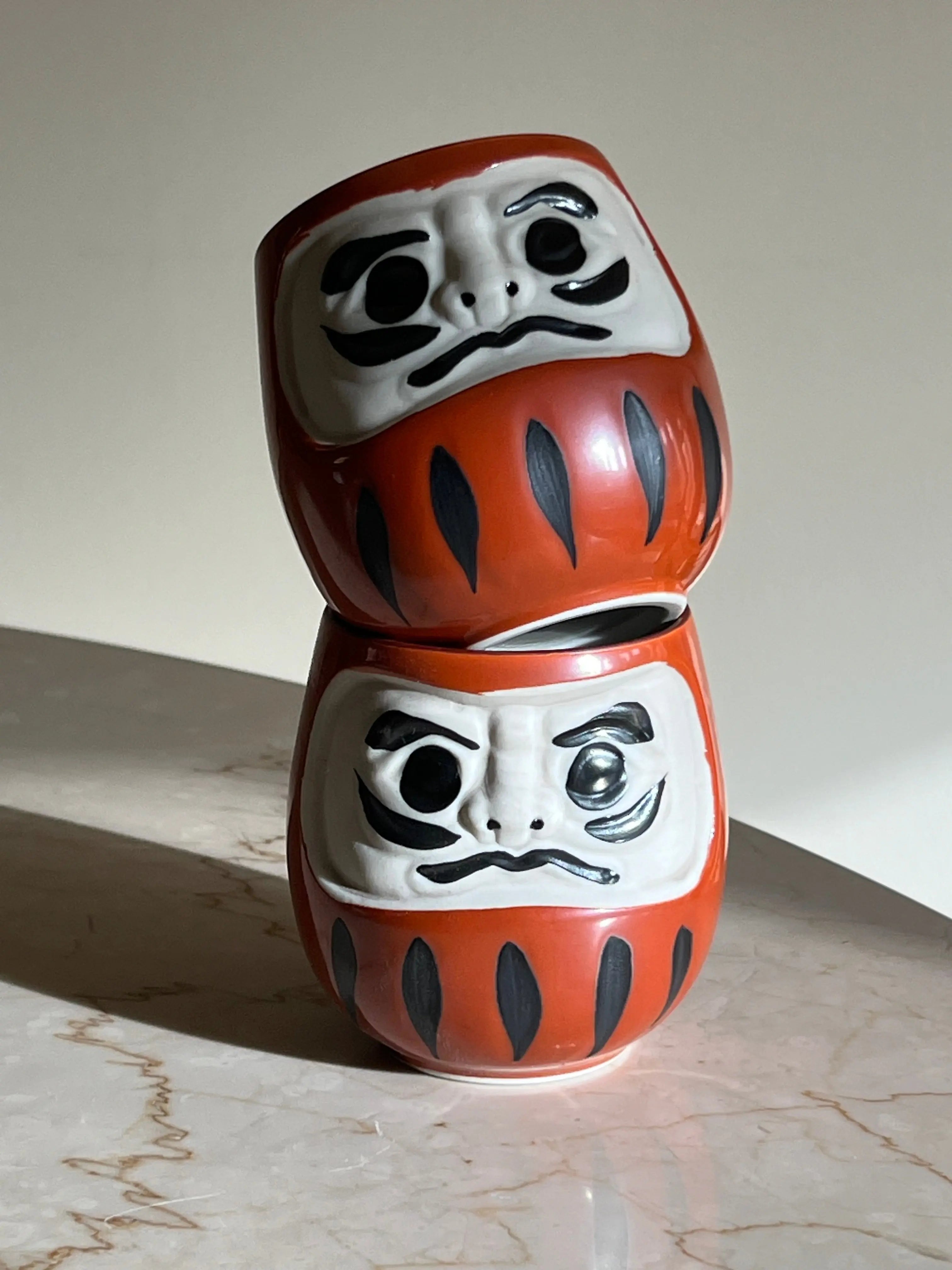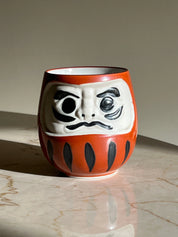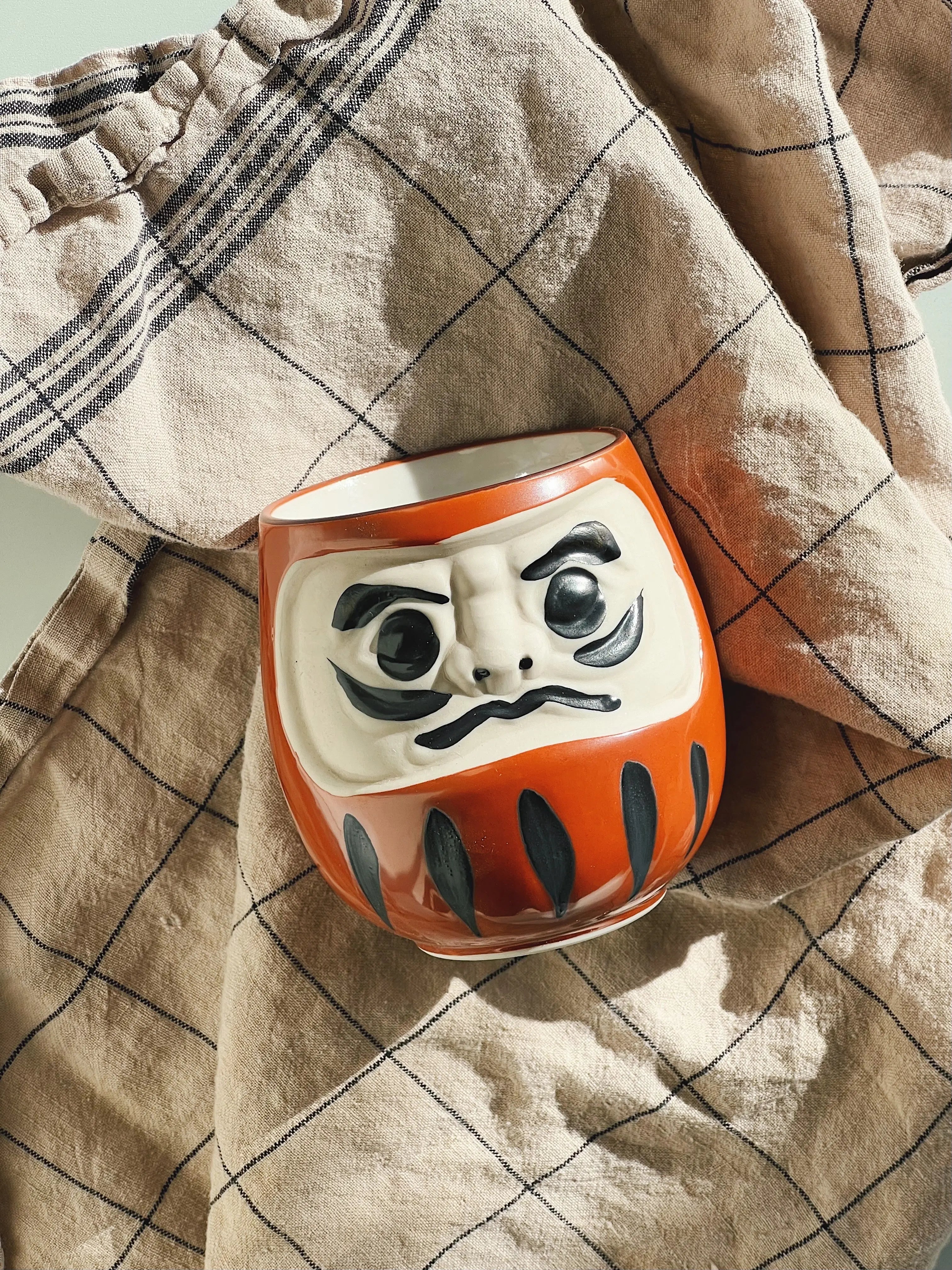 Daruma is a popular lucky charm in Japan and the popular Japanese Daruma doll without arms and legs represents the founder of Zen Buddhism, Bodhidharma, whose arms and legs withered away after nine years of meditation in a mountain cave. The Daruma doll always gets up after being pushed, and according to the Japanese, it falls down 7 times but gets up 8 times. The Daruma doll thus represents an ideal in Japanese ethics: a symbol of rebirth and a belief in never giving up. The Daruma dolls have different colours, and the red doll in particular is a sign of safety and success. The Japanese Daruma mug will decorate any home.